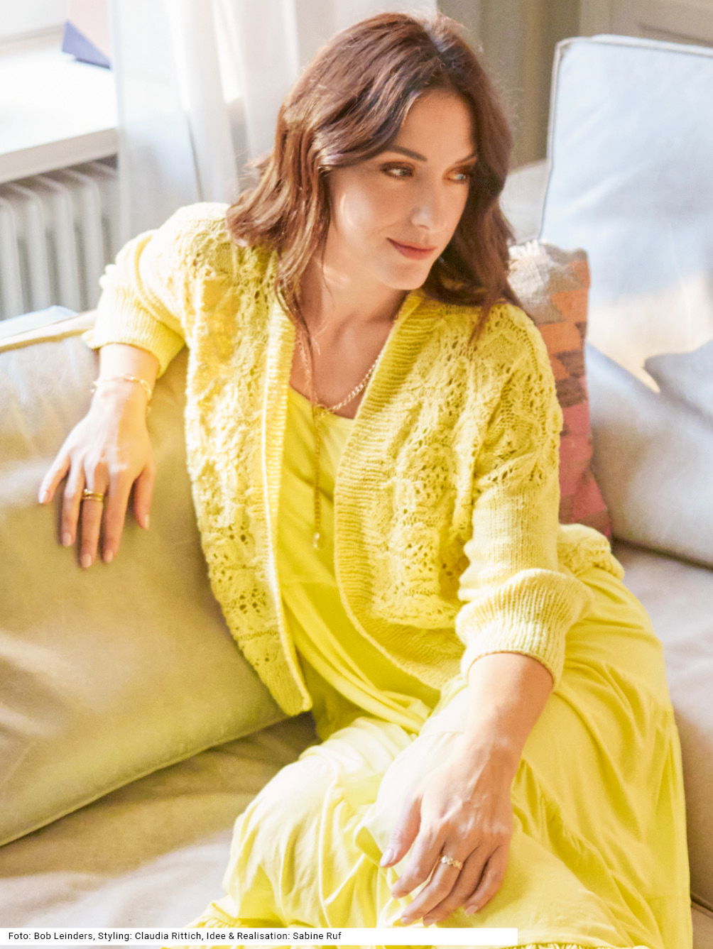 So eine Jacke mit Schalkragen zieht mit ihrem dekorativen Loch-Zopfmuster die Blicke auf sich. Das verzopfte Ajourmuster ist etwas für geübte StrickerInnen. Die beiden Vorderteile werden quer gestrickt, das Rückenteil und die Ärmel von oben nach unten schlicht glatt rechts, sodass das löchrige Muster im Vordergrund steht. Die Ärmel sind rundgestrickt und ganz gerade. Der Bund und die Vorderteilblenden werden zum Schluss im Rippenmuster angestrickt. Hellgelbes Garn aus einer Mischung von Baumwolle und Polyamid ist perfekt für den Sommer. Eine Anleitung gibt es für die Größen 36/38, 40/42 und 44/46.
