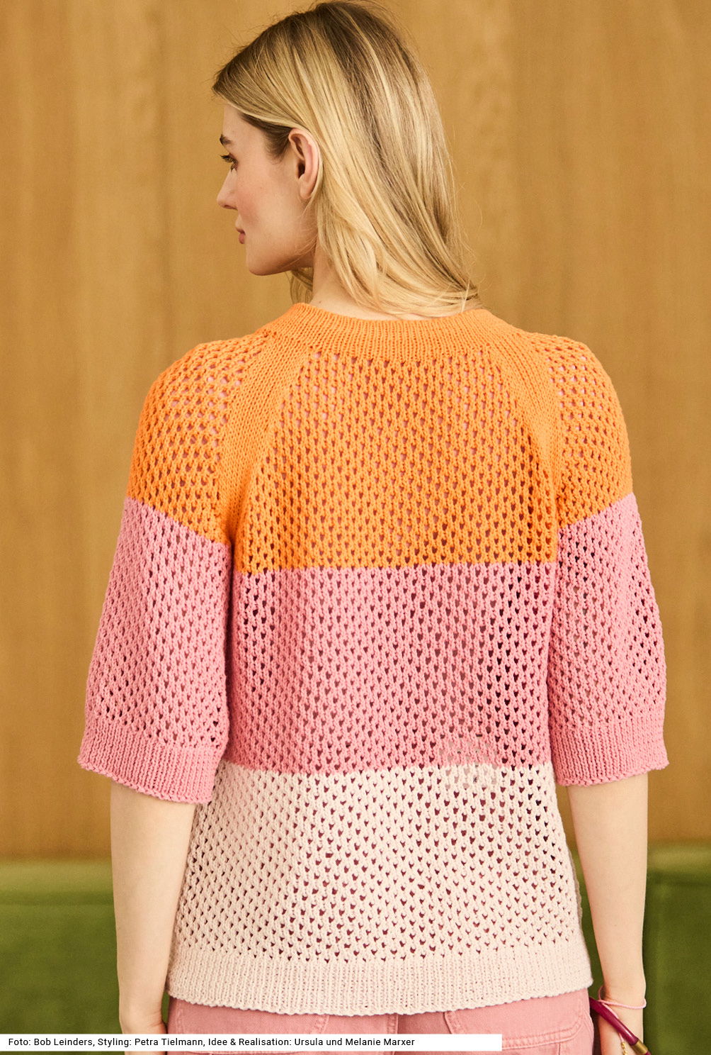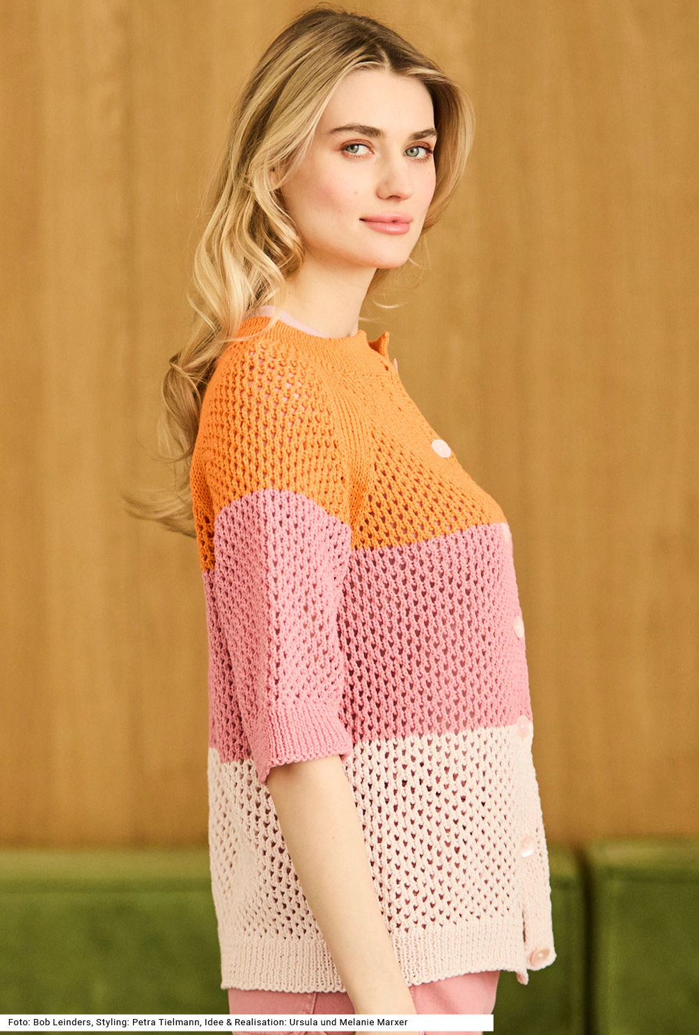 Diese Jacke mit einem einfachen Lochmuster lebt vom kraftvollen Kontrast dreier Farben. Beide Vorderteile und das Rückenteil werden in einem Stück samt Knopfblende gearbeitet; ab den Armausschnitten kommen dann auch die bis über die Ellbogen reichenden Ärmel dazu und es wird alles zusammen weitergestrickt. Die betonten Raglanschrägungen sind glatt rechts gestrickt. Der Halsausschnitt bekommt eine doppelte Rippenblende. Verwendet wird ein reines Baumwollgarn und sanft schimmernde Perlmuttknöpfe. Die Anleitung dieses Modell ist für die Größen 36/38, 40/42 und 44/46 vorhanden.