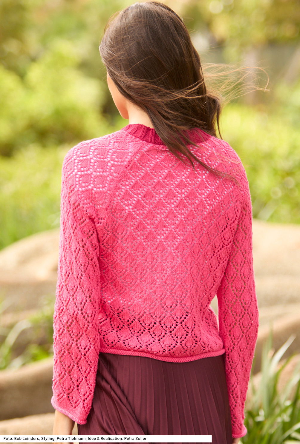 Ein klassischer Schnitt beieiner Jacke mit V-Ausschnitt muss nicht langweilig sein. Das beweist dieses Modell mit Rauten-Lochmuster. Das rührt daher, dass die Vorderteilblende farblich abgesetzt ist und die Ärmel ganz offen enden. Dadurch, dass das Muster zunächst mit glatt rechts beginnt, ergibt sich ein kleiner Rollrand an allen Teilen. Die Knopfblende wird im 2/2-Rippenmuster gearbeitet. Raglanärmel garantieren einen perfekten Sitz an den Schultern. Eine Anleitung für ein Garn aus reiner Baumwolle kann für die Größen 36/38, 42/44 und 48/50 downgeloadet werden.