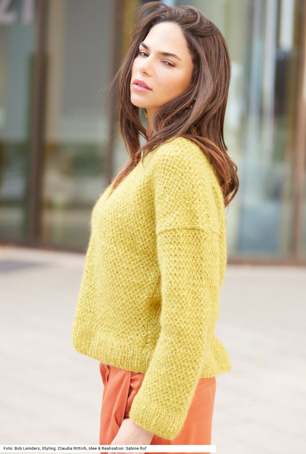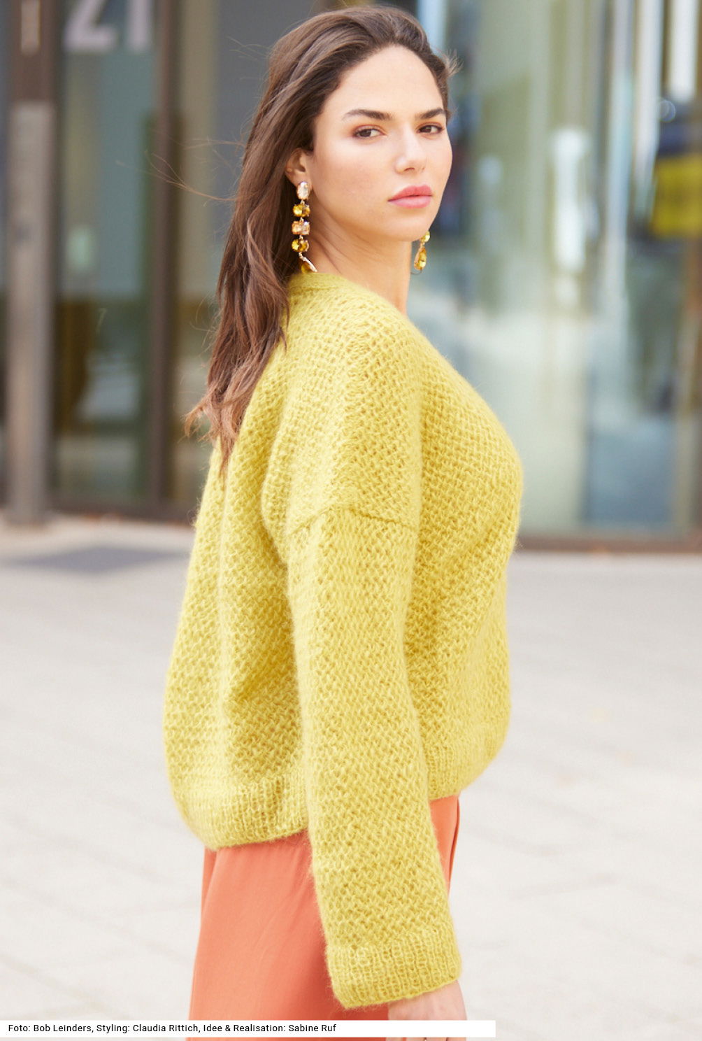 Diese limettengrüne Jacke bringt kaum etwas auf die Waage – wärmt aber dennoch wunderbar und ist zudem kuschelig weich. Das liegt an der Garnneuheit aus hochwertigem Kidmohair und Seide. Das Modell ist oversized geschnitten und wird im Brustbereich breiter, was eine stark überfallende Schulterpartie zur Folge hat. Die Bündchen sind im Rippenmuster gearbeitet, ansonsten wird ein Flechtmuster gestrickt. Für die Vorderteilblende wird extra ein «Schlauch» im Doppelstrick gearbeitet und zum Schluss an die Vorderteile genäht. Eine Anleitung gibt es für die Größen 38/40, 42/44 und 46/48.