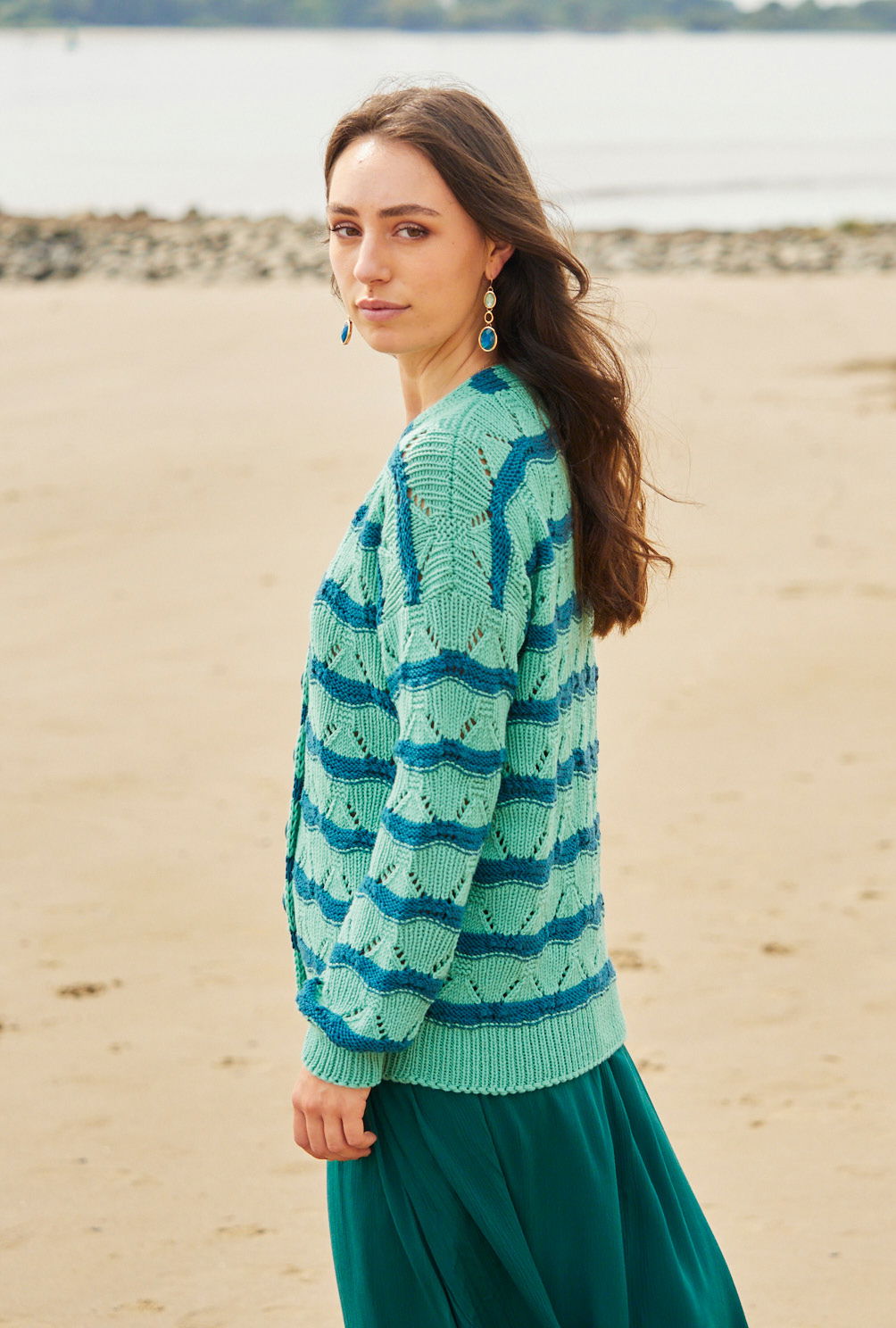 Sabrina Strickjournal Jacke mit V-Ausschnitt im Wellenmuster in Mint und Petrol