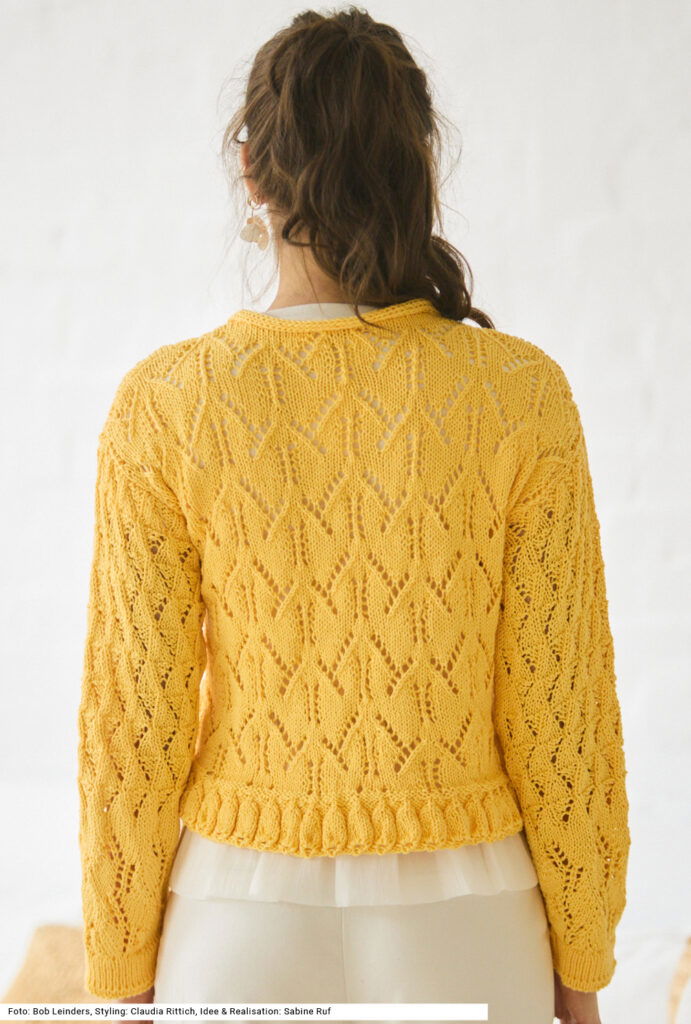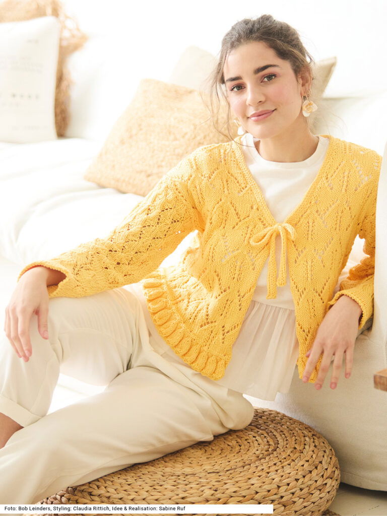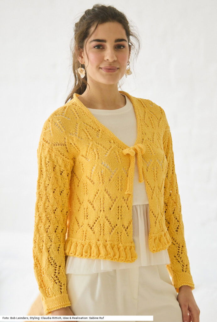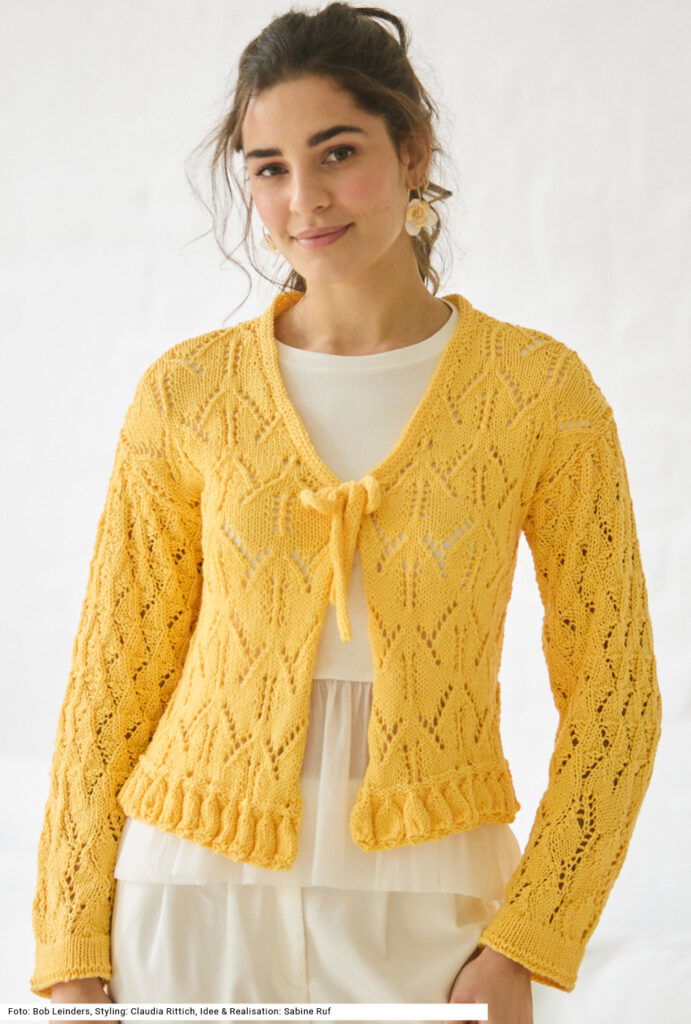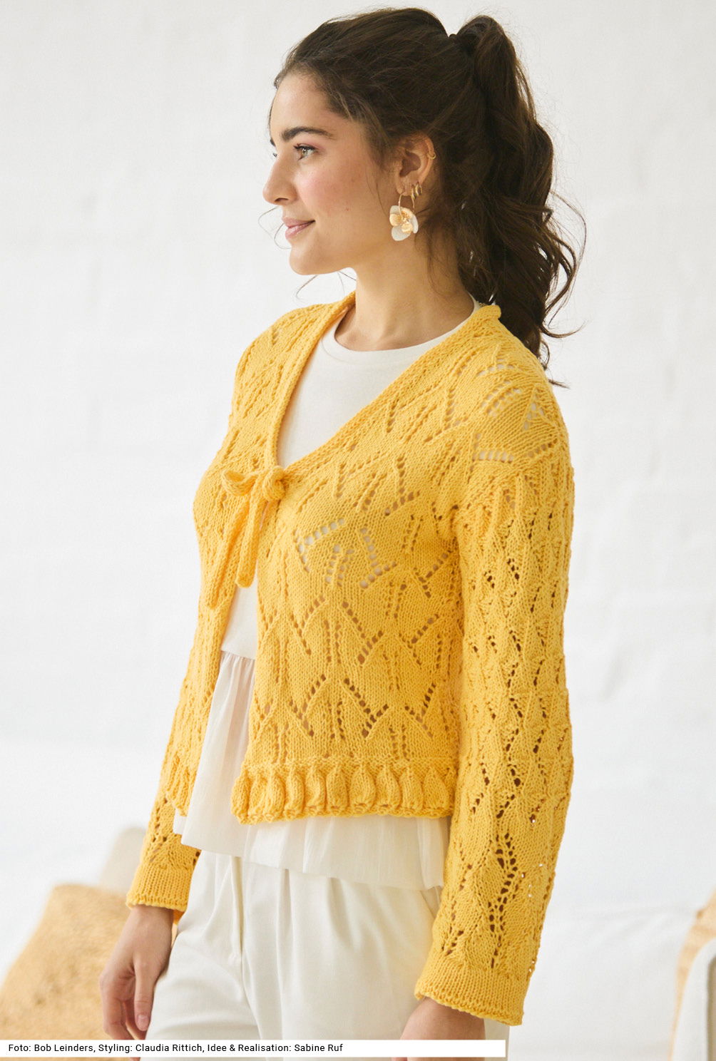 Für Frauen, die es romantisch lieben: Das taillenkurze Baumwolljäckchen setzt mit einem besonderen Rüschenbund, der aus einem Glockenmuster besteht, dazu dreierlei Ajourmustern und einem Bindeband Akzente. Leicht, feminin und vielseitig kombinierbar – ein außergewöhnliches Modell mit verspielten Details. Dafür braucht es keinen komplizierten Schnitt. Das Bindeband läuft am den V-Ausschnitt-Schrägungen und dem rückwärtigen Halsauschnitt entlang weiter. Mit seinen vielerlei Mustern wird dieses Modell das Herz einer jeden versierten Strickerin höher schlagen lassen. Eine Anleitung steht für die Größen 36/38, 40/42 und 44/46 bereit.