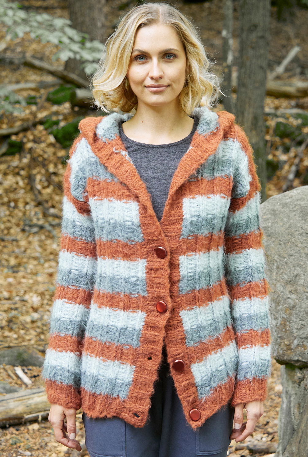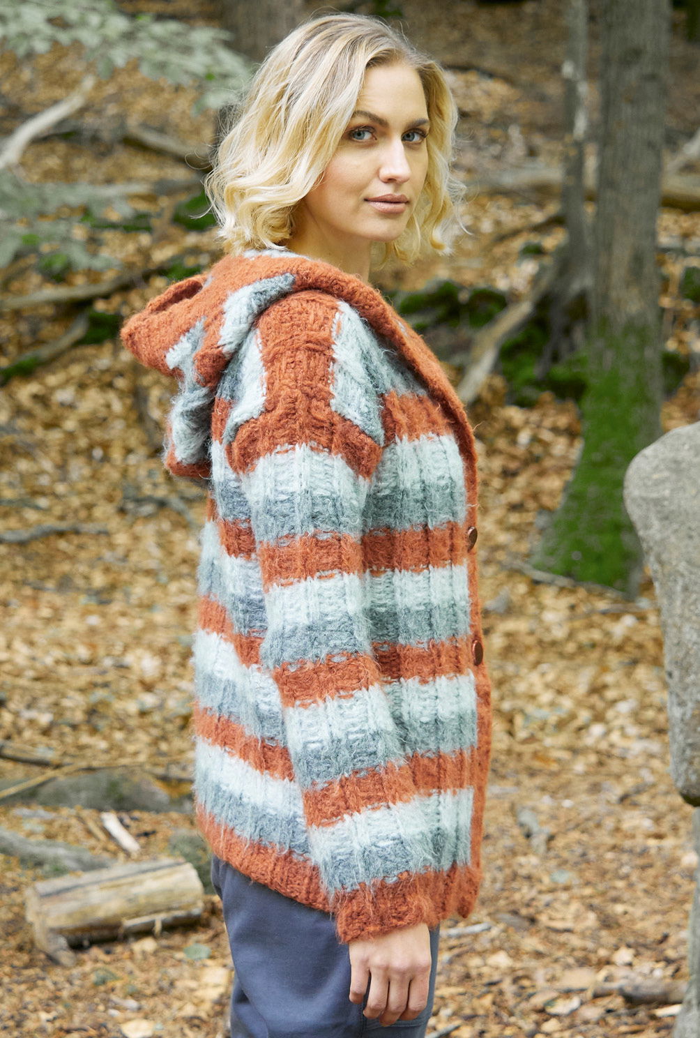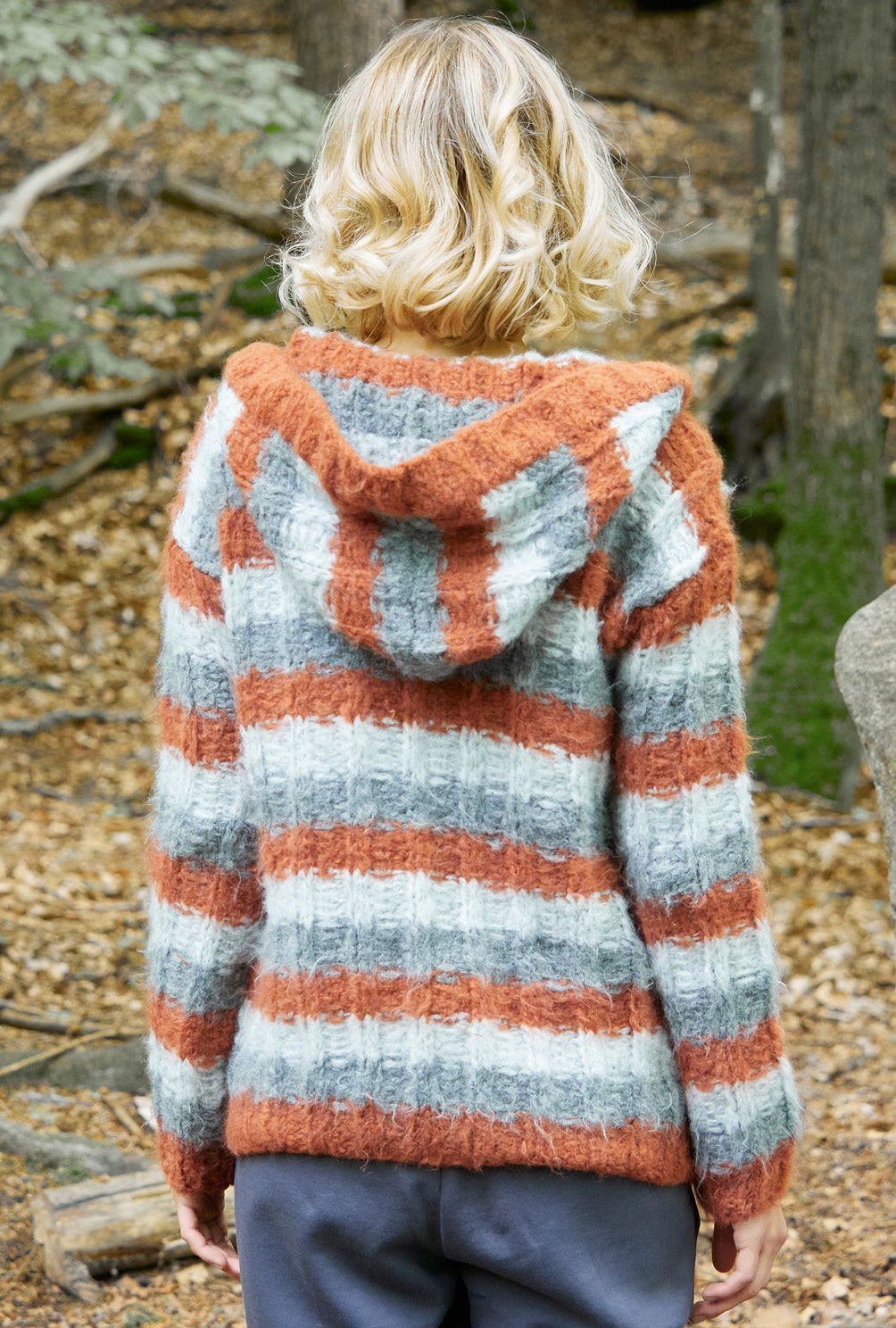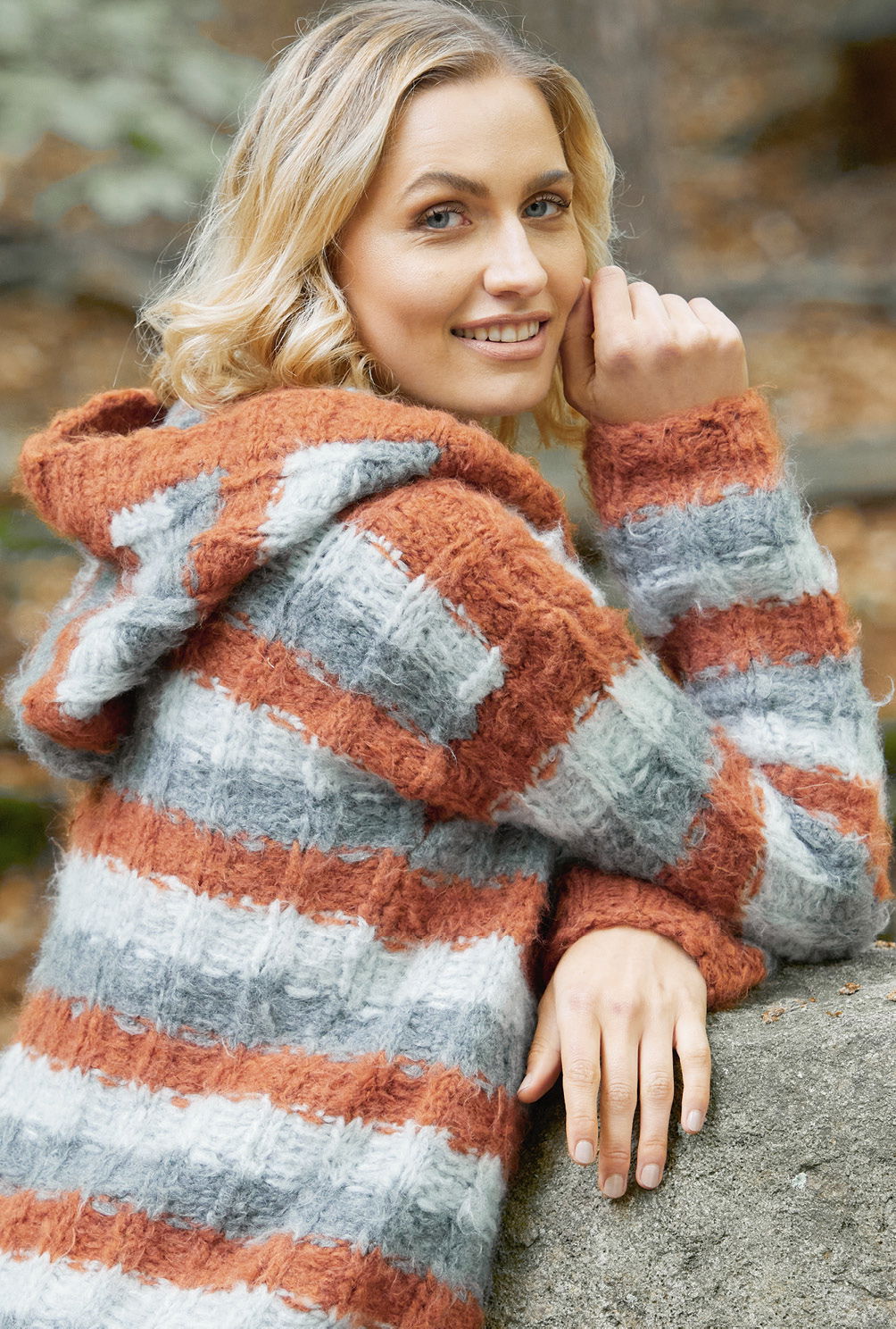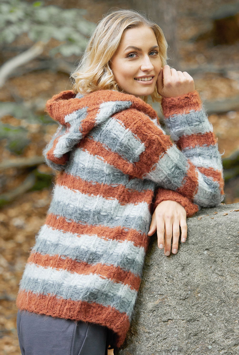 Im Herbst werden kuschelweiche Hoodies zu einer beliebten Alternative für den klassischen Anorak und das aus gutem Grund – sie sind nicht nur gemütlich, sondern sehen auch äußerst attraktiv aus. Ein besonders ansprechendes Beispiel hierfür ist diese Kapuzenjacke in einem raffinierten Streifenmix aus warmen Rost– und dezenten Grautönen. Dieser einzigartige Look wird durch die Verwendung eines einfachen Hebemaschenmusters zusätzlich aufgewertet, was der Jacke eine besondere Textur und Raffinesse verleiht. Mit solch einem vielseitigen Kleidungsstück ist man nicht nur bestens gegen die herbstliche Kälte gewappnet, sondern sieht auch noch ausgesprochen stylisch aus. Die Anleitung für diesen Cardigan ist in den Größen 36/38 und 44/46 verfügbar, sodass jeder die Möglichkeit hat, dieses einzigartige Strickstück zu gestalten.