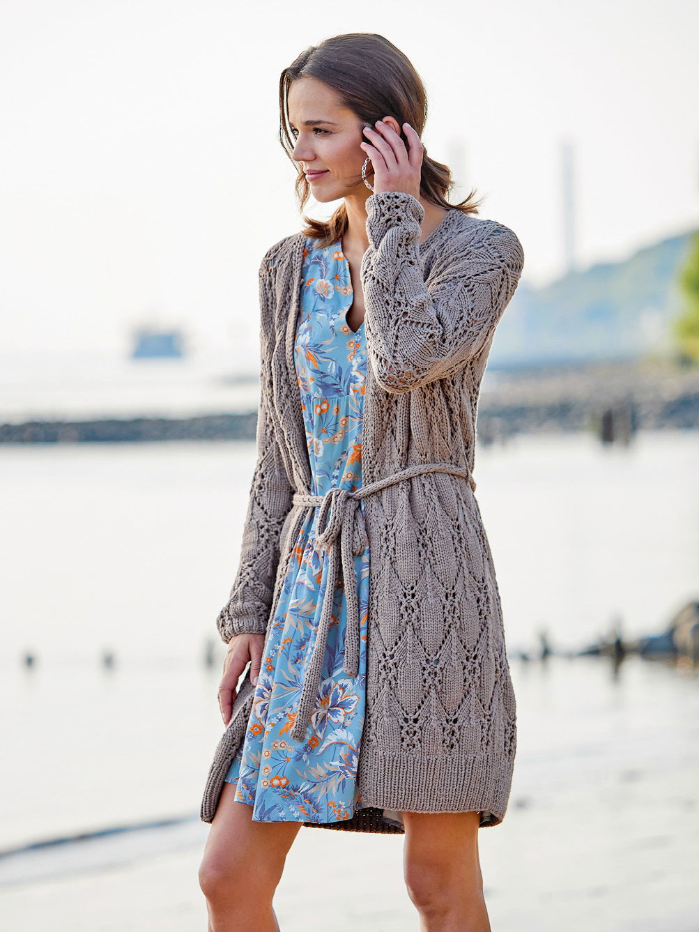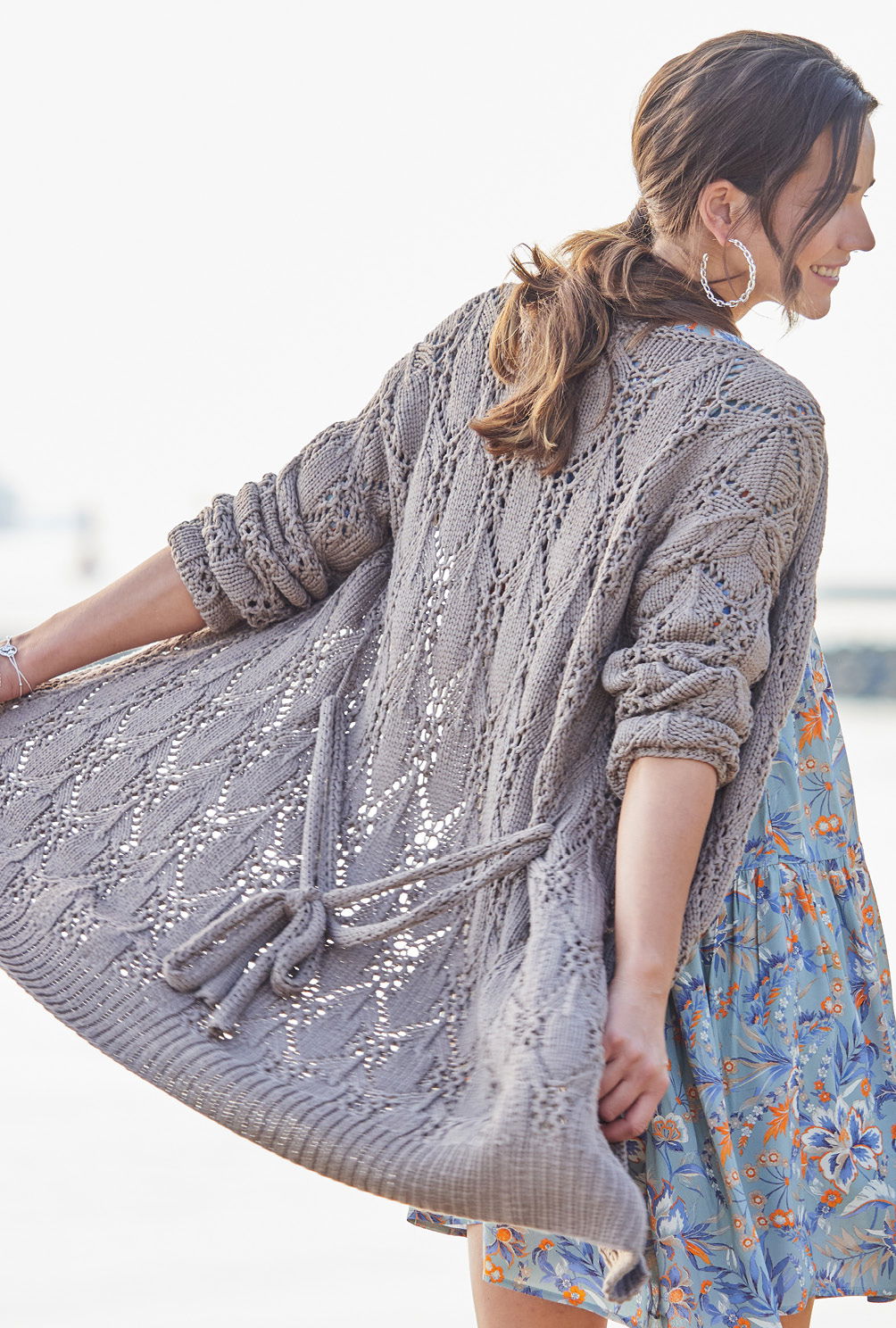 Wer noch ein luftiges Strickprojekt für die Reisezeit benötigt, ist hier genau richtig! So ein Longcardigan in neutralem Taupe passt immer in den Koffer – und zu nahezu jedem Teil unserer Garderobe. Gestrickt aus Kaschmir, Seide und Modal ist diese Kombi wunderbar weich und anschmiegsam, aber dennoch angenehm kühl auf der Haut. Mit Nadelstärke sieben gestrickt wird die Jacke auch gerade noch rechtzeitig fertig. In Einzelteilen wird von unten nach oben nach den Rippenbündchen allover im Ajourmuster gestrickt. Das benötigt zwar ein wenig Aufmerksamkeit, aber die klare Strickschrift in der Anleitung hilft dabei, stets den Überblick zu behalten. Sind alle fünf Teile fertig gestrickt, werden noch die Nähte geschlossen und Blenden im Rippenmuster herausgestrickt. Dann noch fix den Gürtel stricken – und fertig ist der Klassiker!