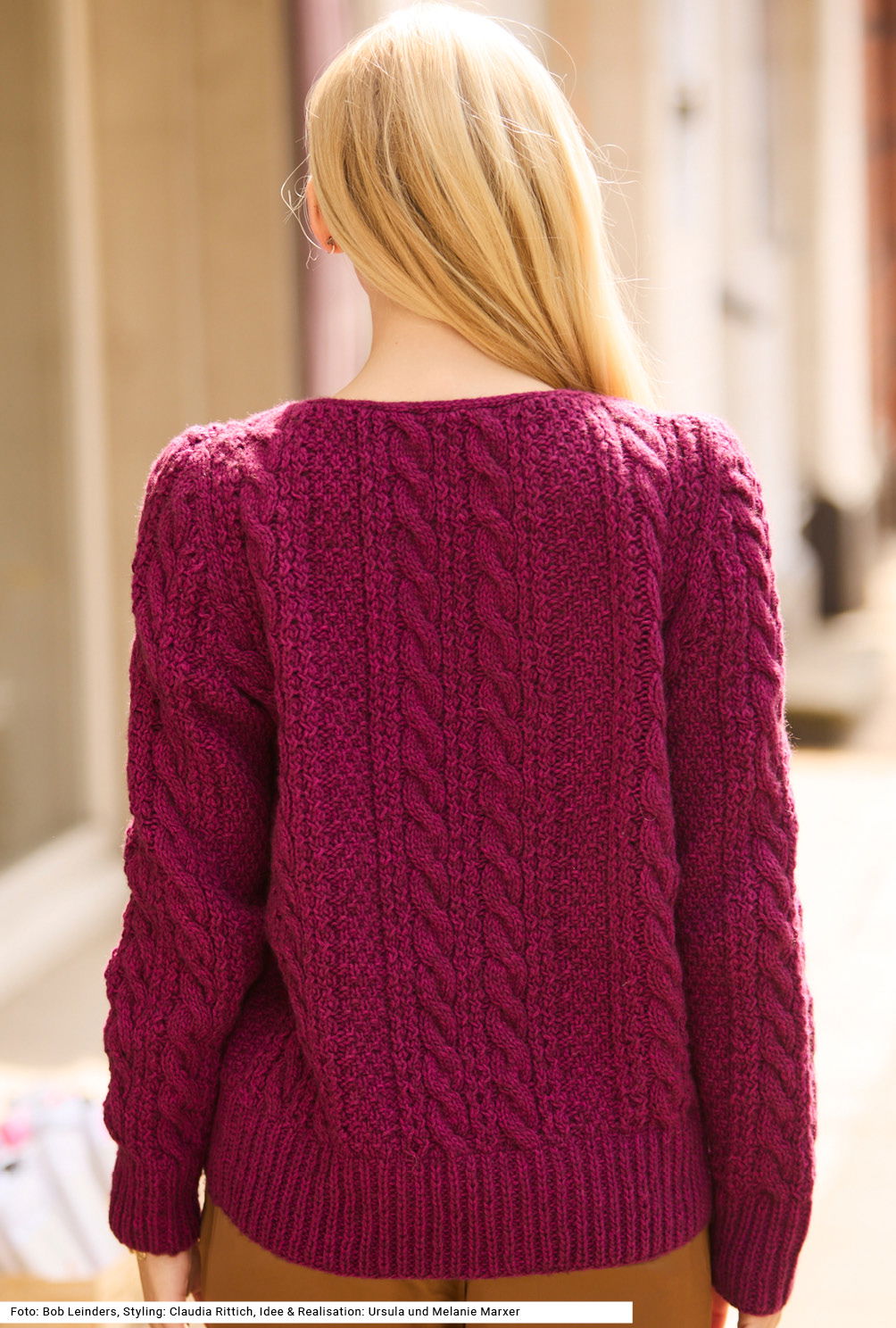 Was für ein gelungener Mustermix – ideal für alle, die Abwechslung beim Stricken lieben. Die doppelte, einzeln gestrickte Knopfleiste mit zehn Knöpfen dieser Jacke ist im Halbpatent gearbeitet, wie auch die Bündchen am Saum und an den Ärmeln. Die Mustervielfalt setzt sich zusammen aus schmalen und breiteren Zöpfen und Streifen im großen Perlmuster. Nach dem Annähen der Knopfblenden wird um den runden Halsausschnitt ein I-Cord gearbeitet. Das superweiche Garn ist aus Schurwolle und Yak. Eine Anleitung gibt es für die Größen 40/42, 44/46 und 48/50.