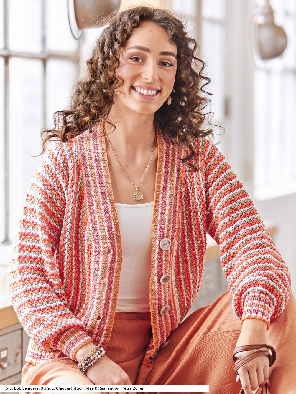 Eine quer samt Ärmel gestrickte Jacke mit V-Ausschnitt und hohem Rippenbündchen ist überaus bequem zu tragen, auch dank der weiteren Ärmel, die gerade mal bis knapp über die Ellenbogen reichen. Das Baumwoll-Viskose-Garn bringt mit seinem edlem Glanz die feinen Farb-Streifen groß raus. Auch der nachträglich angestrickte breite Saumrand und die ebenfalls breiten Vorderteilblenden werden in wechselnden Farben gearbeitet. Rippenmuster, kraus links und Dornröschenmuster wechseln sich ab. Die Anleitung steht für die Größen 36/38, 40/42 und 44/46 zum Download bereit.