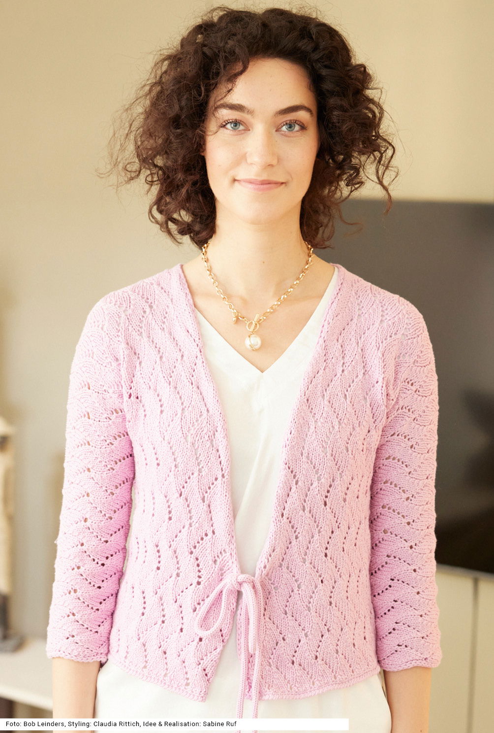 Diese feminine fliederfarbene Wickeljacke mit angestrickten Ärmeln wird durchgehend im Ajourmuster gearbeitet, und zwar mit einer Garn-Neuheit aus Bio-Baumwolle und recyceltem Polyamid. Die doppelten Randmaschen bilden hübsche Kanten, die in der rückwärtigen Halsblende weiterlaufen. Der untere Jackenrand wird mit je einer Runde fester Maschen und Krebsmaschen umhäkelt. Zusammengehalten werden die Vorderteile mit zwei Schnüren, die in der Strickmühle gefertigt werden. Beim Tragen wird das lange Band innen um die Taille geschlungen und an der Seitennaht nach außen geführt, um in der vorderen Mitte mit dem kurzen Band zur Schlaufe gebunden zu werden. Eine Anleitung gibt es in den Größen 36/38, 40/42 und 44/46.