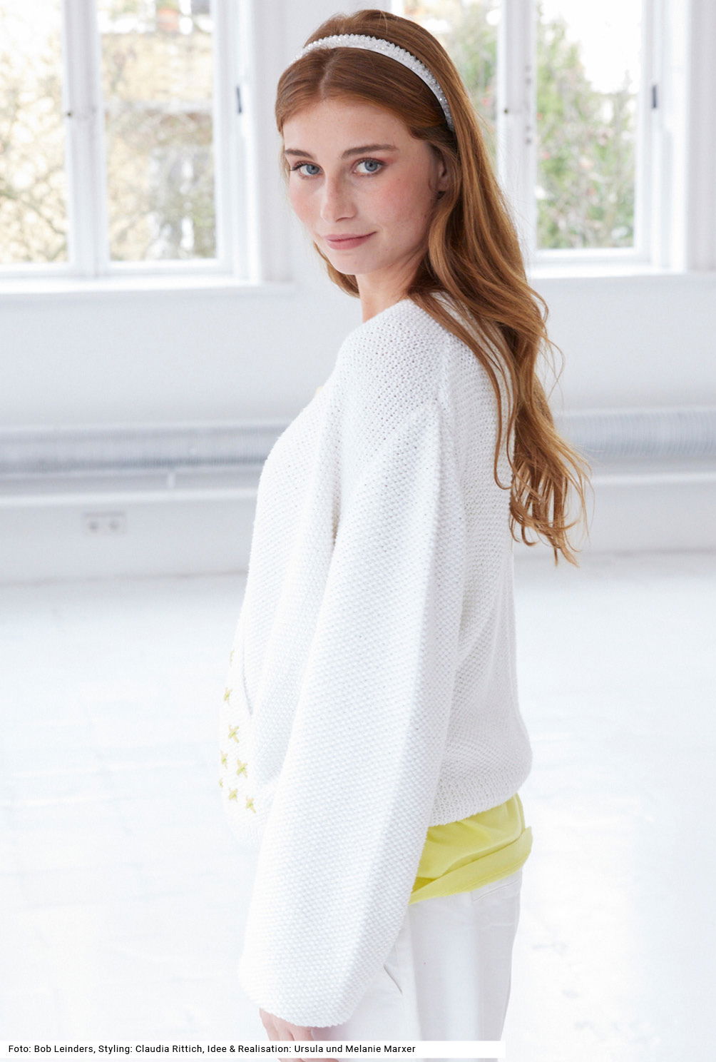 Diese ansich schlichte Wickeljacke mit kleinem Perlmuster bekommt dank der aufgestickten Sterne das gewisse Etwas. Mit zwei I-Cord-Schnüren wird die Jacke geschlossen. Die Ärmel sind weit und ganz gerade geschnitten und haben eine Armkugel, sodass sie sich gut in den Armausschnitt einpassen. Die Bündchen sind im 1/1-Rippenmuster gearbeitet; eine Blende an den Vorderteilen erübrigt sich, da die doppelte Randmasche einen sauberen Abschluss erzeugt. Gestrickt wird mit einem weichen, anschmiegsamen Garn aus Baumwolle mit etwas Polyamid. Eine Anleitung gibt es für die Größen 38/40, 42/44 und 46/48.