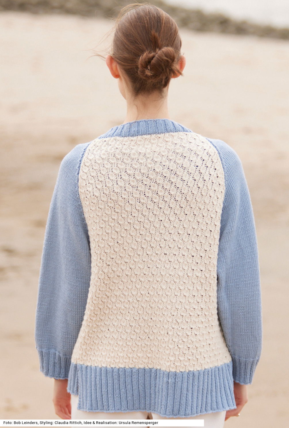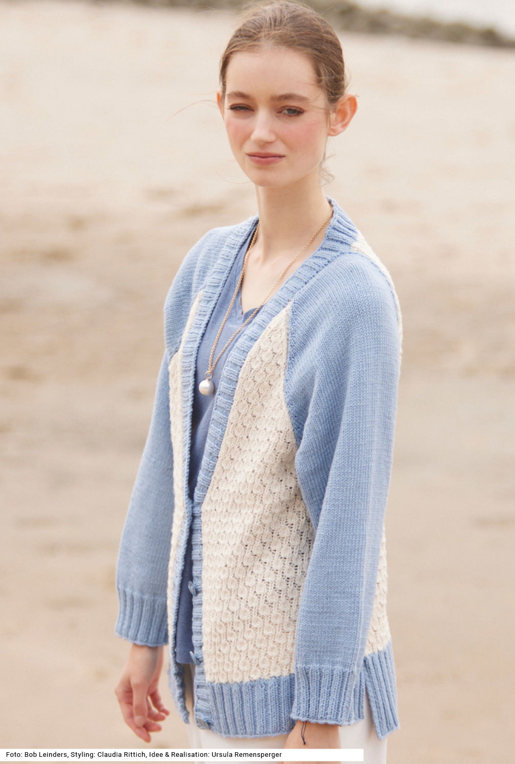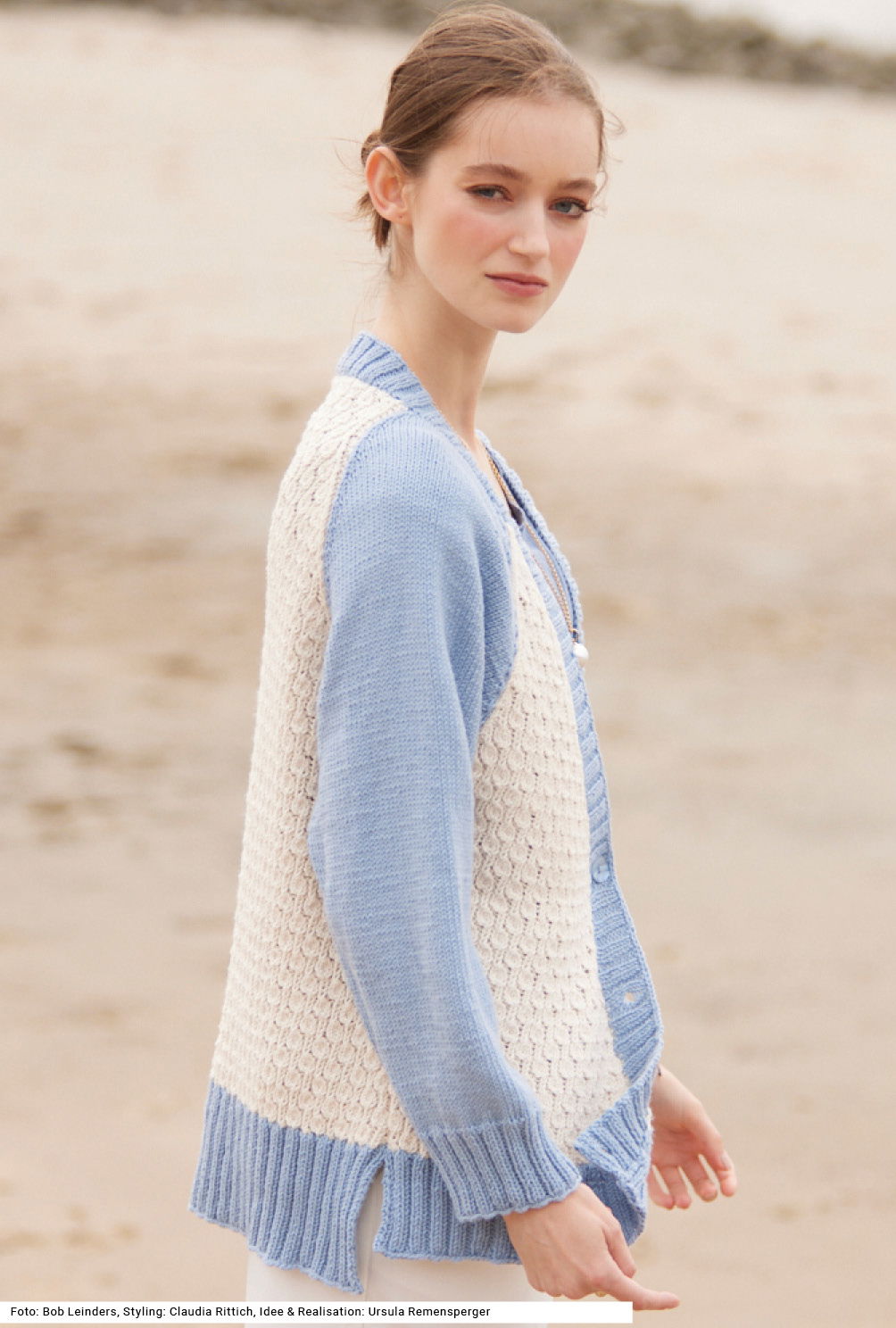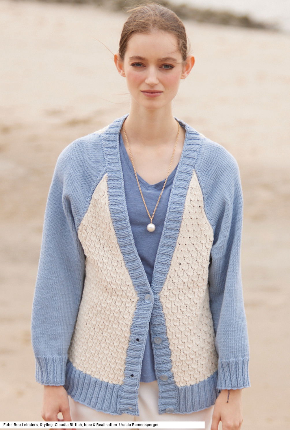 Es sind die Details, die diese Raglanjacke zu etwas Besonderem machen. Vorder- und Rückenteil sind in Wollweiß im sogenannten Notenmuster, das aussieht wie kleine Blasen, gestrickt, die Ärmel, der hohe Bund und die Knopfblende, die um den tiefen V-Ausschnitt weiterläuft, werden in Hellblau gearbeitet. Ein weiteres Detail sind die Seitenschlitze in Bundhöhe und die auffällig betonten Abnahmen an den Raglanschrägen. Als Garn haben wir eine Mischung aus Schurwolle und Baumwolle genommen. Eine Anleitung dazu gibt es für die Größen 38/40, 42/44 und 46/48.