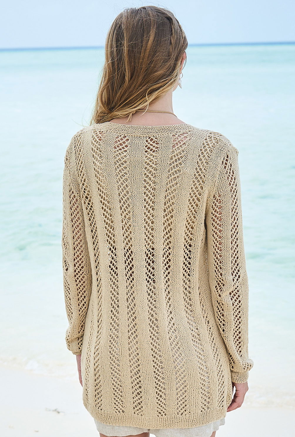 Kurz zu lang, das ist der neue Lagenlook! Die verschlusslose Jacke brilliert mit schmalen Lochmusterstreifen, die beim bauchnabelfreien Top nur seitlich zum Einsatz kommen. Gestrickt werden alle Teile einzeln und von unten nach oben. Der Cardigan erhält dabei ein allover Ajourmuster, welches nicht schwierig zu stricken ist. Die übersichtliche Strickschrift in der Anleitung hilft zudem dabei, stets die Übersicht zu behalten. Die Blenden werden ganz zum Schluss kraus rechts angestrickt, nachdem alle Nähte geschlossen wurden. Das Bustier wird auch in zwei Teilen gestrickt, wobei die glatt rechts gestrickten Maschen seitlich von einem schmalen Ajourmusterstreifen eingerahmt werden. Am besten nimmt das Set dann noch ein kleines Bad und wird schön glatt ausgestrichen und liegend getrocknet. Dabei entfaltet das Ajourmuster seine volle Schönheit.