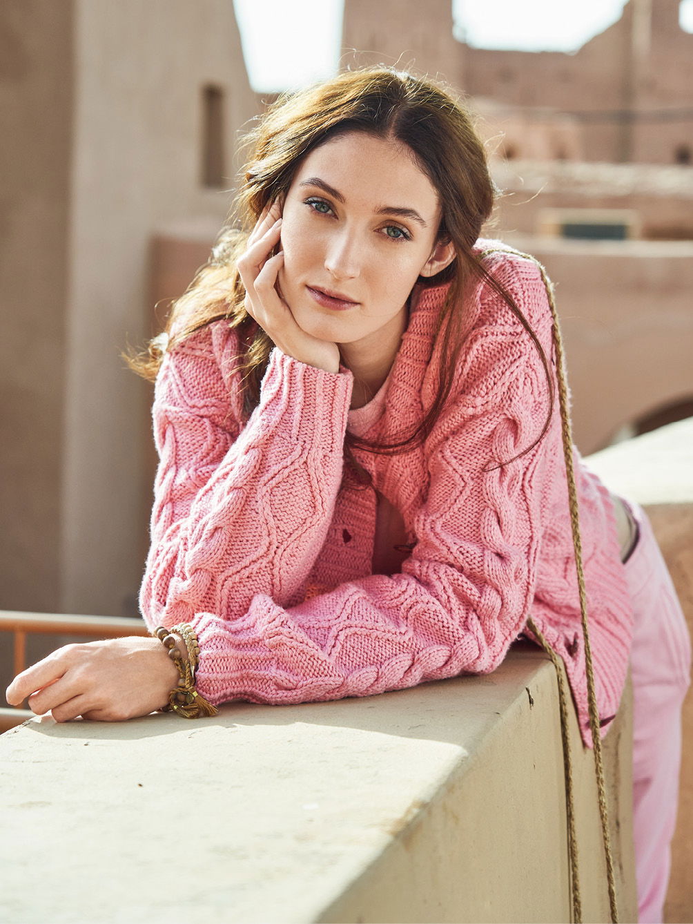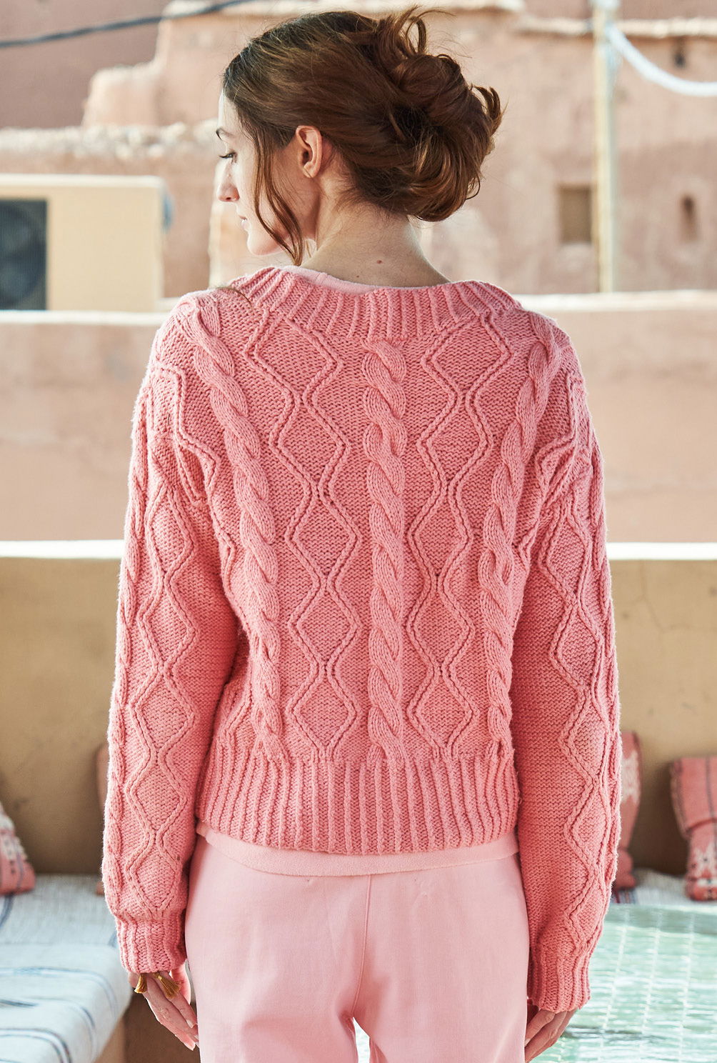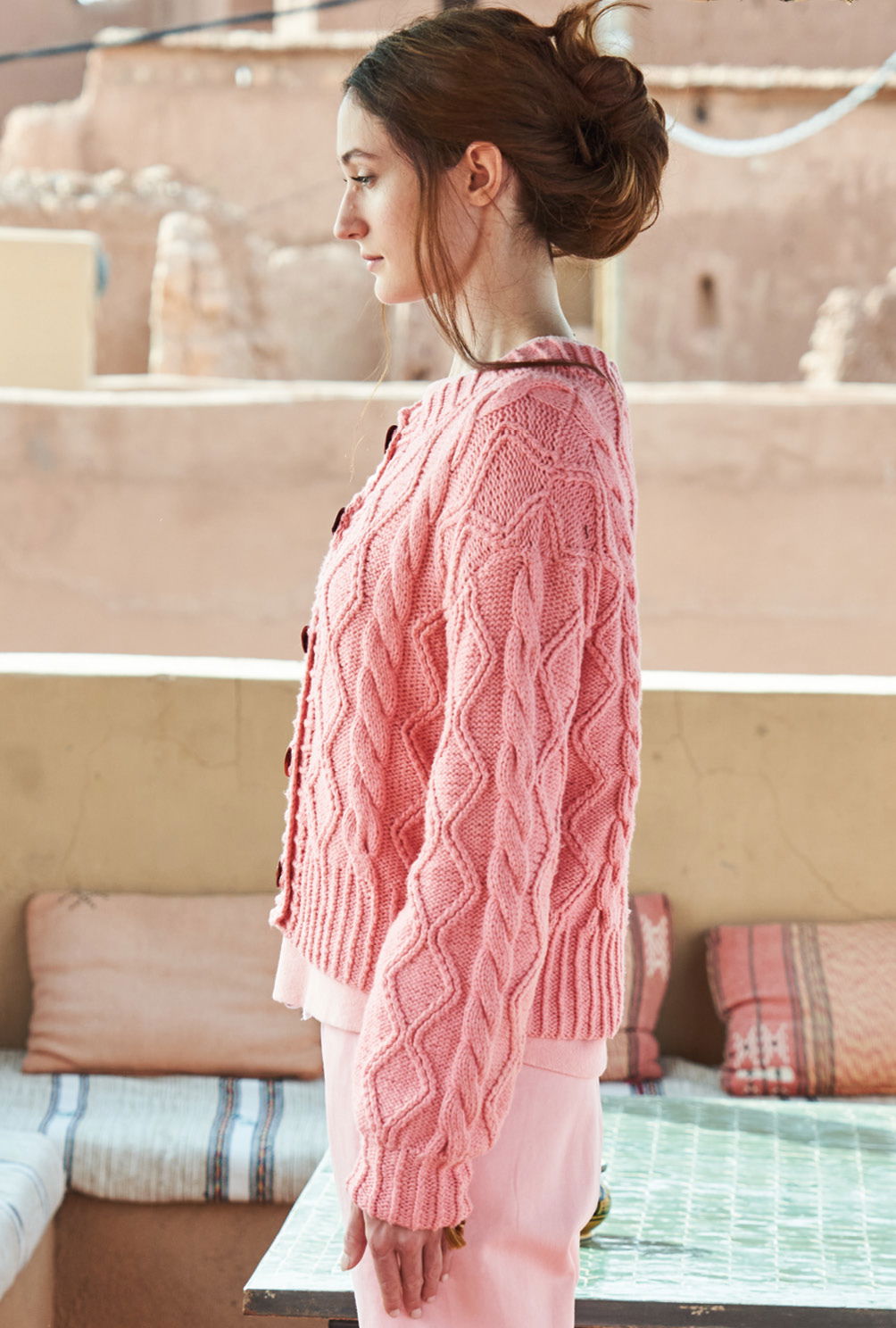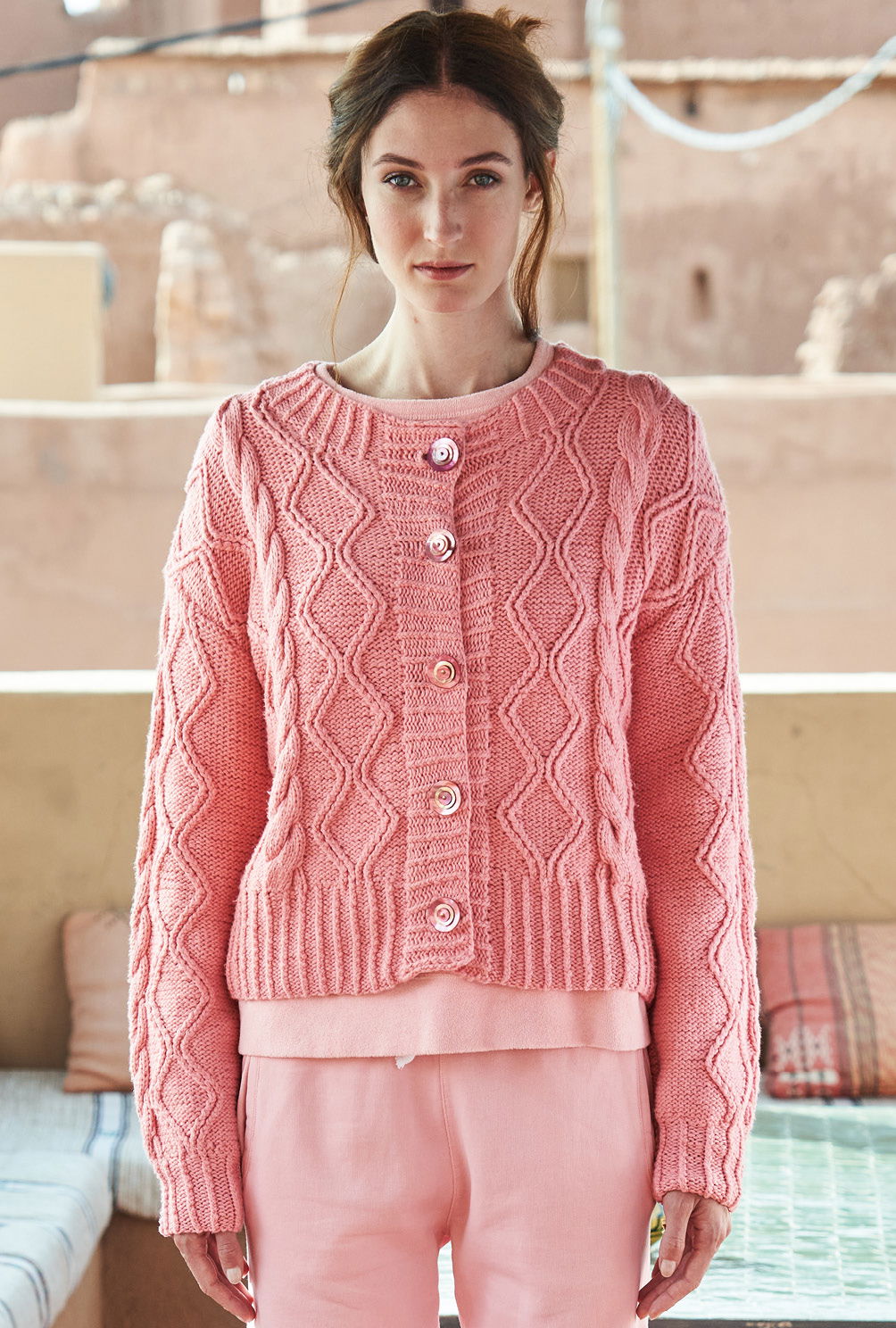 Für die Prinzessin in uns kommt diese wunderbar weiche Jacke in Erdbeer-Rosa gerade recht! Das Garn aus israelischer, langstapeliger Mako-Baumwolle mit einem kleinen Anteil Polyamid zur Stabilisierung ist so zart und weich – ein echtes Schmusegarn. Der Mustermix aus Rauten und Zöpfen unterstreicht die Schönheit des Garns gekonnt und bietet zudem ein kurzweiliges Strickvergnügen. Der Cardigan wird in Einzelteilen von unten nach oben gestrickt. Zuerst das hohe Rippenbündchen, danach werden die Maschen dann eingeteilt, um im Wechsel das Rauten- und Zopfmuster zu stricken. Gerade zu Beginn kann es hilfreich sein, die unterschiedlichen Musterbereiche mit Maschenmarkierern zu kennzeichnen. Die klaren, übersichtlichen Strickschriften helfen dabei, stets den Überblick im Muster zu behalten. Sind alle Teile fertig, werden die Schulternähte geschlossen und aus dem Halsausschnitt und den Verschlusskanten die Blenden herausgestrickt. Danach werden die restlichen Nähte geschlossen und die Knöpfe angenäht.