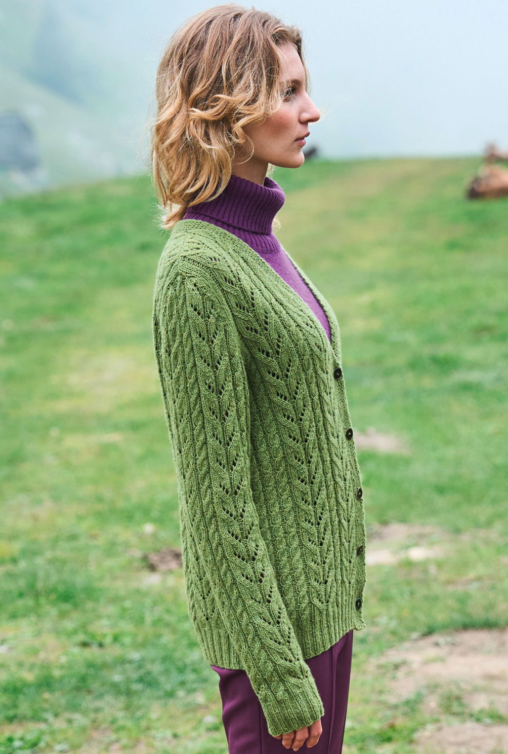 Klassisch, zu allem kombinierbar und ein «Für-Immer-Stück»: Dieser Cardigan mit Zöpfen und Ajourmuster-Streifen begleitet dich die ganze Saison und macht, durch sein heiteres Grün, auch im Frühling Furore. Das feine Garn besteht aus recycelten Kaschmirfasern und wird nachhaltig produziert – ein klares Statement für die Umwelt. Elastische Rippenbündchen, die perfekt ausgearbeitete V-Ausschnittschrägung und die angestrickte, mit farblich passenden Knöpfen versehene Kraus-rechts-Blende bilden das Finish.