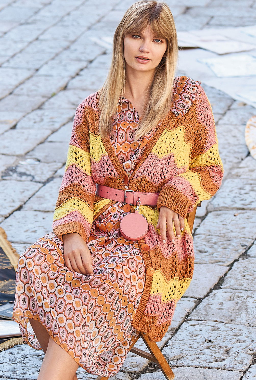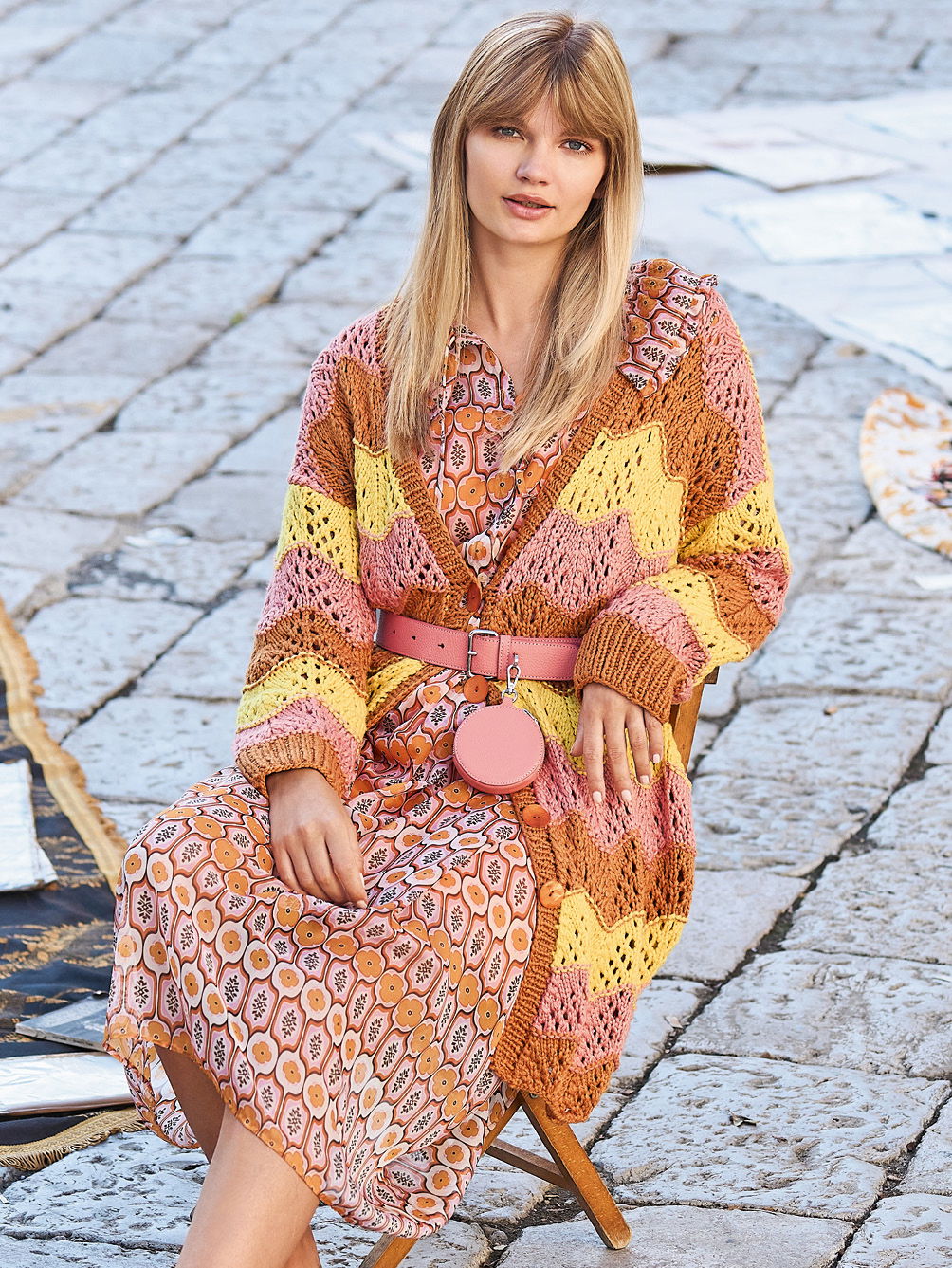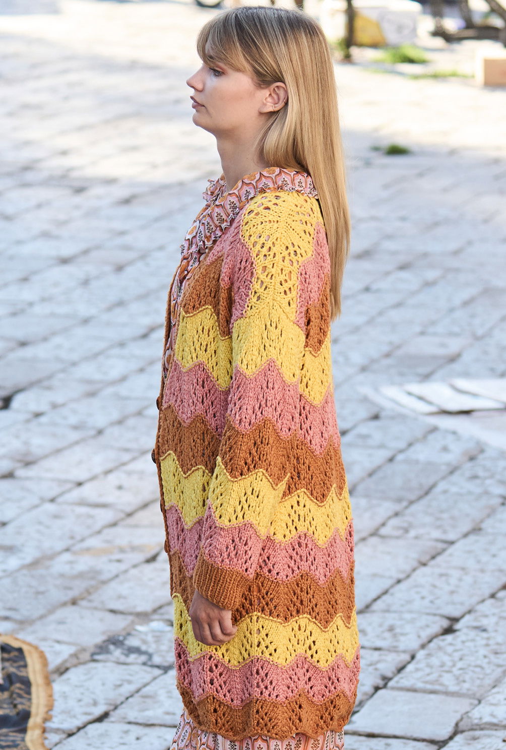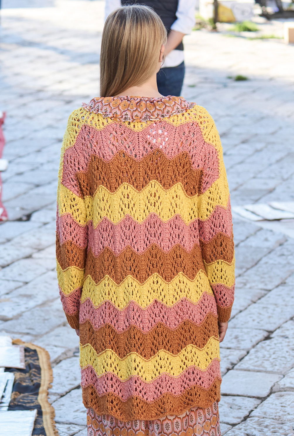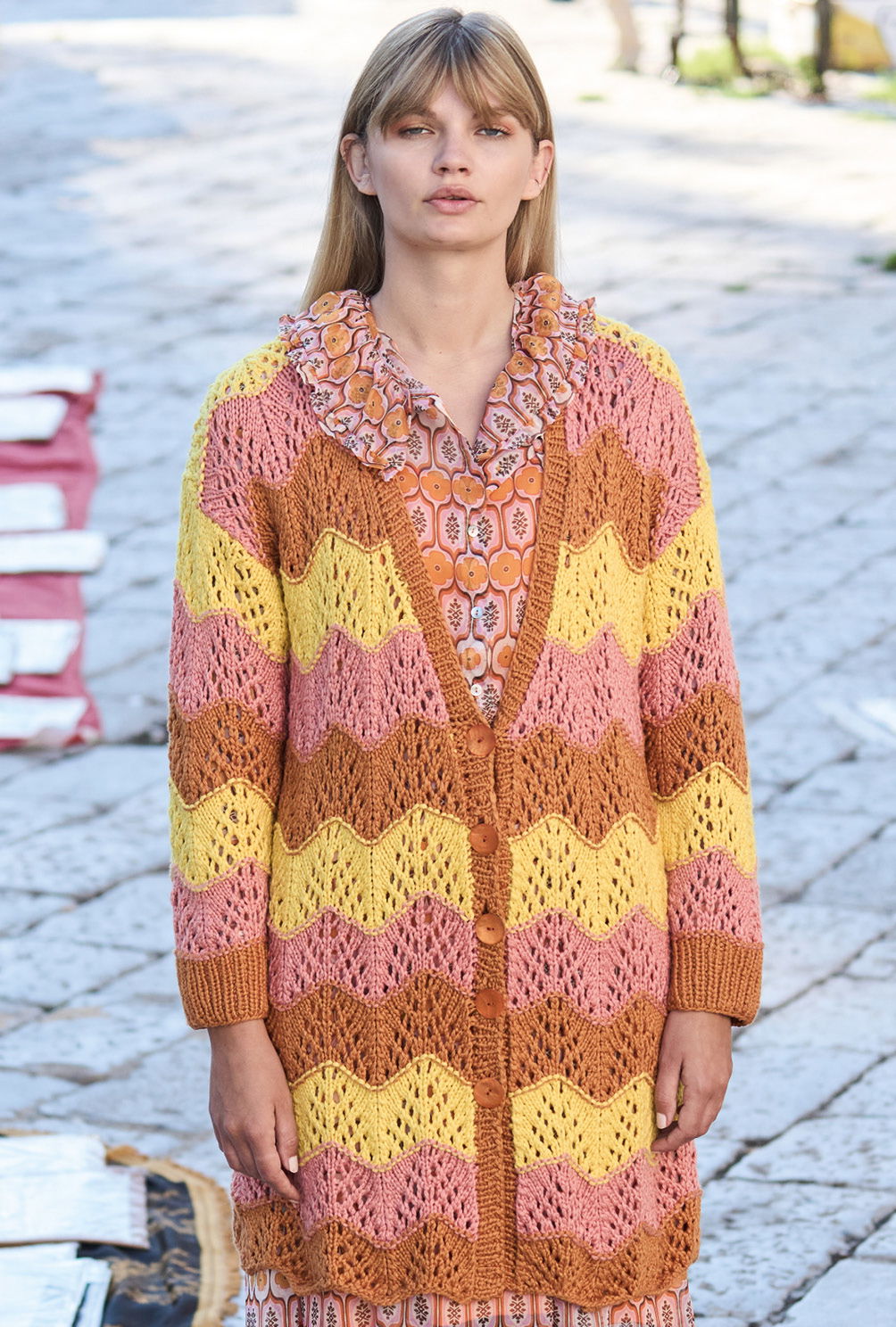 Mehr Energie, mehr Dynamik – das verspricht die kühne Kombination aus Braun, Rosa und Gelb. Der gelungene Farbmix wird durch ein schwungvolles Wellenmuster akzentuiert, für das wir in unserer Anleitung eine übersichtliche Strickschrift hinterlegt haben. Die einfache Schnittform mit leichten Schulterschrägungen und gerade eingesetzten Ärmeln ist auch von weniger versierten Strickerinnen zu bewältigen. Nur bei der Verschlussblende aus rechten und linken Maschen heißt es aufgepasst, da hier Knöpfe und Knopflöcher ins Maschenspiel kommen.