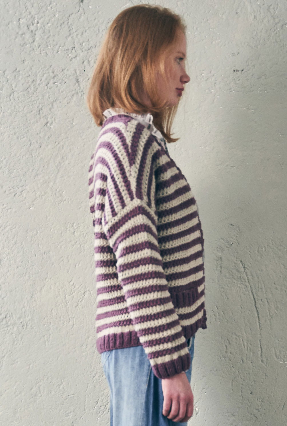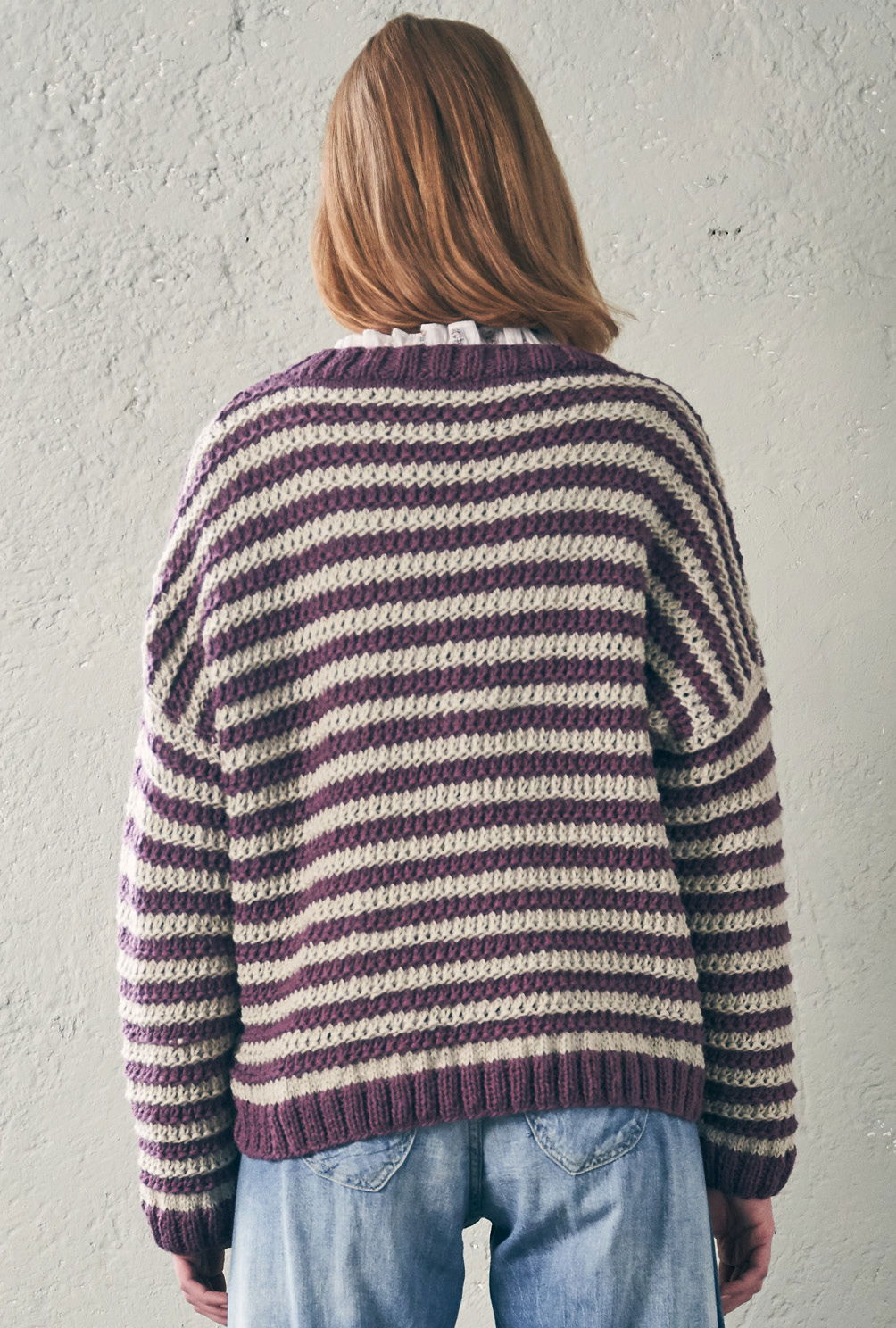 Der gestreifte Cardigan hat viele Details zu bieten: dezente Seitenschrägungen, betont überschnittene Schultern, eingearbeitete Taschen und passende Knöpfe – sie sieht sie aus, die neue Lässigkeit! Sowohl die Muster- als auch die Streifenfolge sind leicht zu merken und zusätzlich in der Anleitung detailliert Reihe für Reihe beschrieben. Das Querrippenmuster betont die Streifenfolge ganz besonders schön und ist mit einem Rapport von zwei Maschen und vier Reihen schnell verinnerlicht. Gestrickt wird alles in einzelnen Teilen und von unten nach oben. Bevor es an die Vorderteile geht, werden die Taschenbeutel gestrickt – so lassen sie sich ganz einfach direkt mit einarbeiten. So müssen zum Schluss nur noch die Taschen- und Vorderteilblenden angestrickt und alle Nähte geschlossen werden.