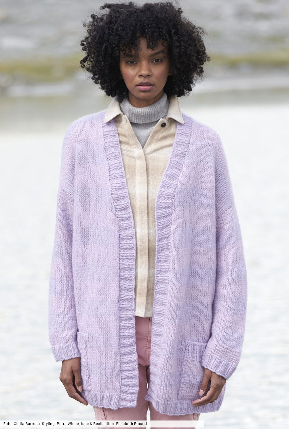 An diese lässig geschnittene, verschlusslose Jacke mit Schulterschrägungen können sich auch AnfängerInnen wagen. Denn das griffige Flauschgarn wird einfach glatt rechts verstrickt, gleichmäßige Streifen in Lavendel und Rosa bilden die ruhige Farboptik und lassen die Teile Stück für Stück wachsen. Zwei aufgesetzte Taschen, der schräge Halsausschnitt und die schmalen Rippenblenden sind die schlichten Details, bei denen alle Strickfans zum Erfolg kommen.