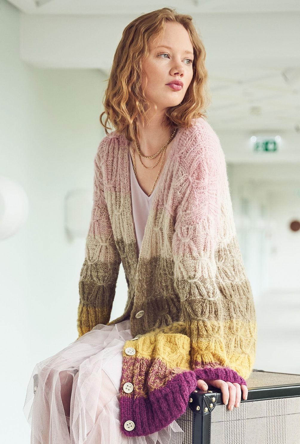 Die superweiche Alpaka-Schurwolle ist die ideale Basis für das gerippte Wickelmuster dieser gestreiften Longjacke – so trägt nichts auf und der wunderschöne Farbmix kann sich voll entfalten. Das Wickelmuster ist nicht sonderlich komplex und die übersichtliche Strickschrift hilft dabei, stets den Überblick zu behalten. Da das Garn zweifädig verstrickt wird, erklärt die Anleitung auch ganz detailliert, wann welche Farbe ausgetauscht wird, damit dieser harmonische Streifen-Effekt entstehen kann. Alle Teile werden einzeln und von unten nach oben gestrickt – besonders praktisch: Die Blenden werden gleich mitgearbeitet. Das sieht ausgesprochen sauber aus und erspart zudem eine komplexere Ausarbeitung. So werden zum Schluss nur noch die Taschen aufgenäht, die Knöpfe angebracht und die Nähte geschlossen.