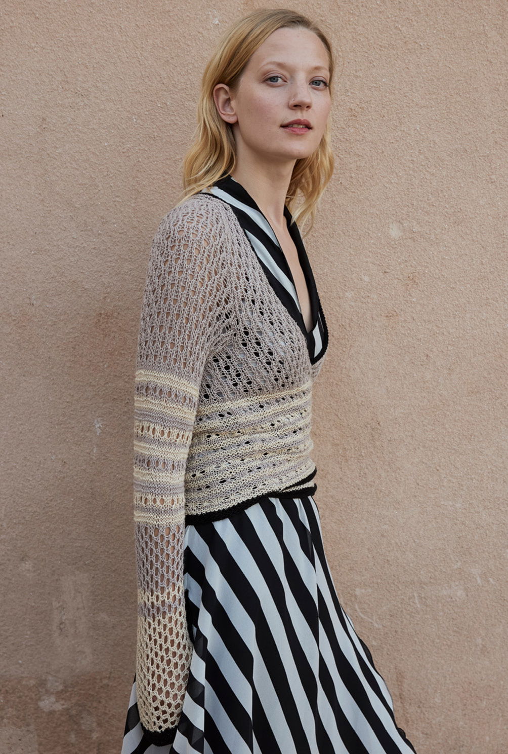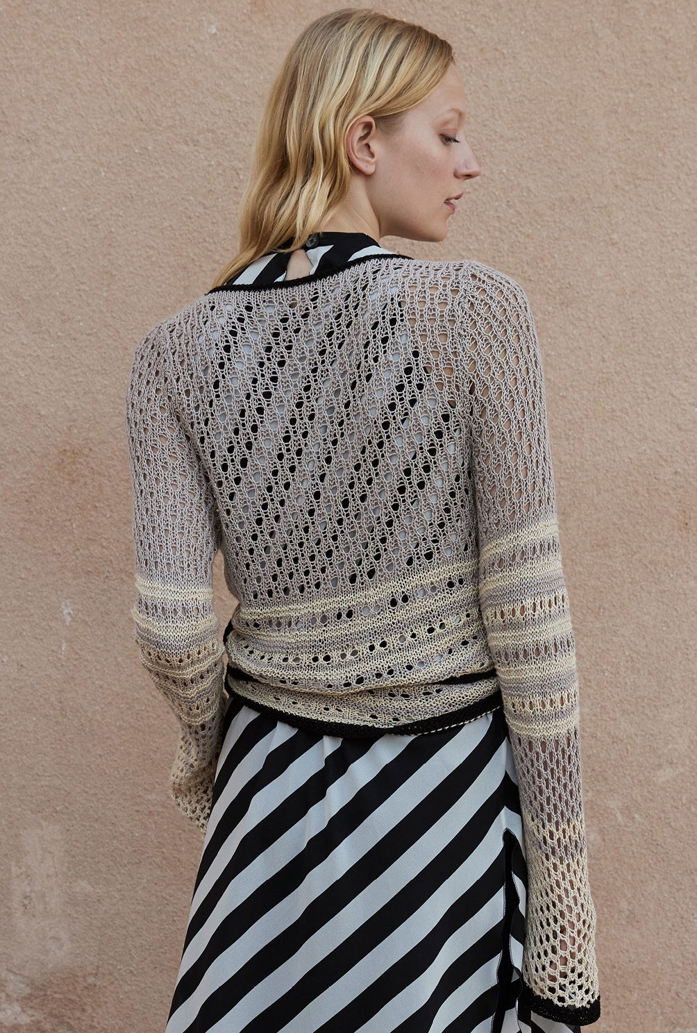 Einfach anziehen, um sich rumwickeln und zubinden – fertig ist ein Oberteil, das sowohl zu Kleidern und Röcken als auch zu Hosen kombiniert werden kann. Aus reinem Leinengarn bietet es hohen Tragekomfort und die verschiedenen Lochmuster-Designs lassen viel Luft an die Haut. Dadurch wird dich dieses aparte Wickeljäckchen in ruhiger Farbkombination aus Sandtönen mit einem Schuss Schwarz bis weit in den Sommer hinein begleiten.