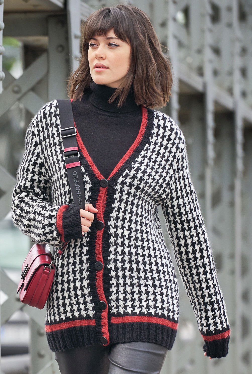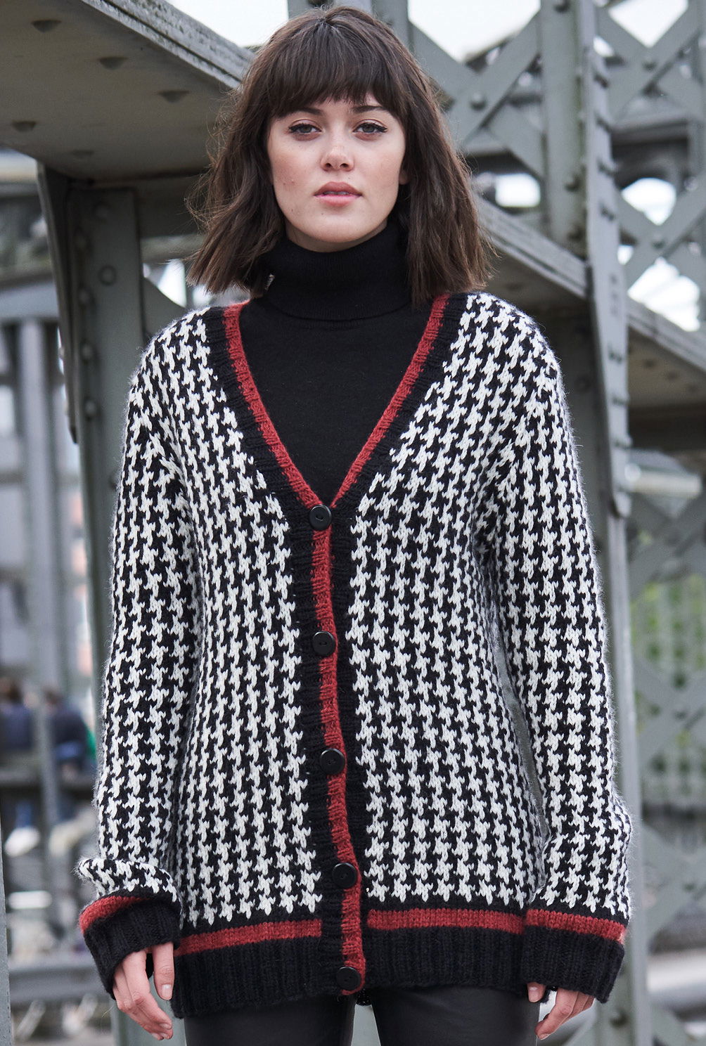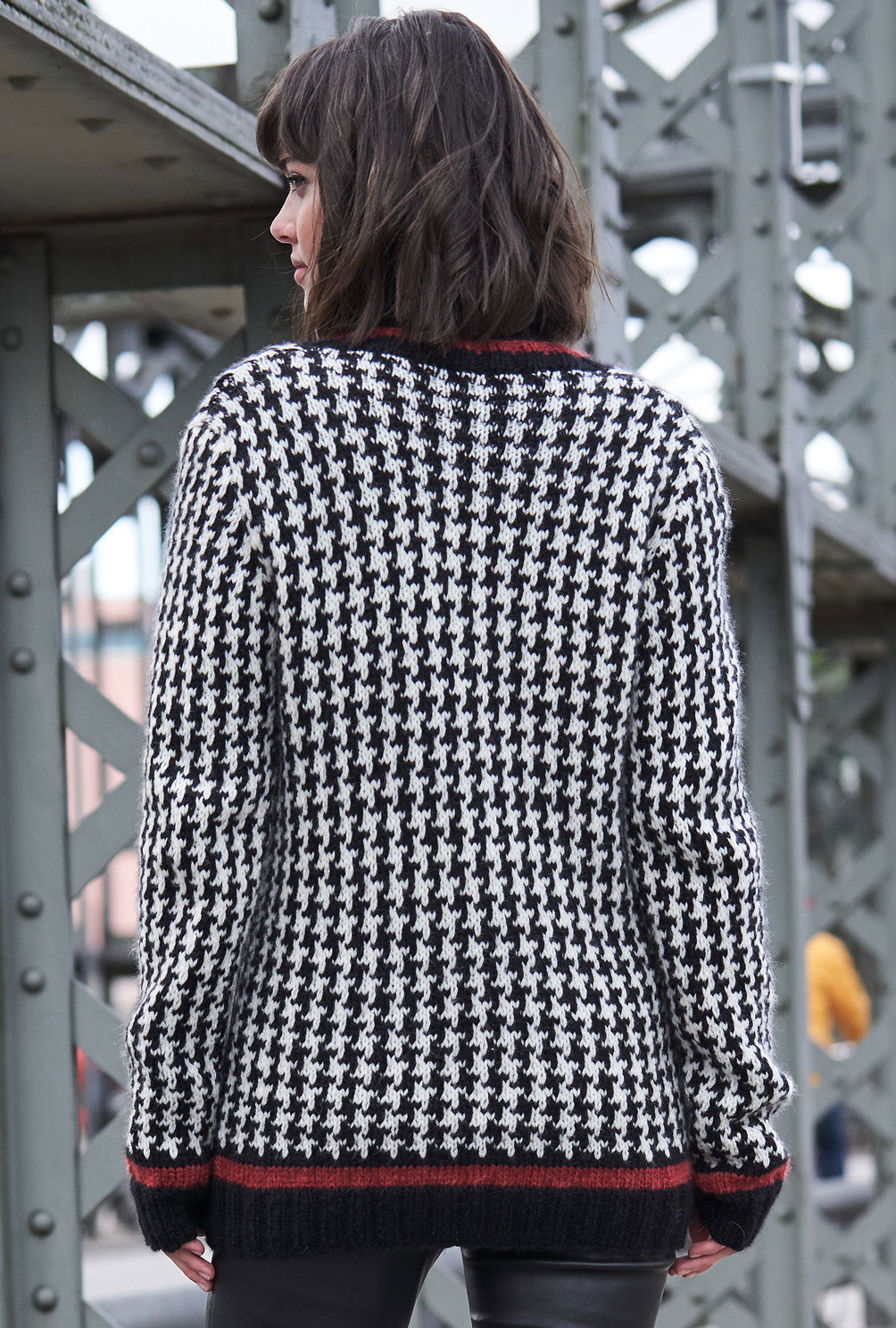 Diese Strickjacke ist ein stilvoller und bequemer Ersatz für den klassischen Blazer. Besonders schön: Der schwarz-weiße Look wird durch rote Streifen in den Blenden wohltuend akzentuiert! Gestrickt werden alle Teile der Jacke in Hin- und Rückreihen. Erst das Bündchen im Rippenmuster, gefolgt vom Streifenmuster in glatt rechts, welchem sich dann das kleine Jacquardmuster anschließt. Das Muster ist nicht schwer zu stricken, der Mustersatz besteht lediglich aus vier Maschen und lange Spannfäden, welche während des Strickens eingewebt werden müssten, gibt es hier auch nicht. Sind das Rückenteil, beide Vorderteile und die Ärmel fertig gestrickt, geht es an die Ausarbeitung. Die Schulternähte werden geschlossen und aus dem Halsausschnitt, den Ausschnittschrägungen und den Blenden werden die Maschen für die Blende herausgestrickt. Diese wird im Rippenmuster und in Streifen gearbeitet, wobei auf der einen Seite auch gleich die Knopflöcher mit eingestrickt werden. Dann nur noch die Ärmel einnähen und die restlichen Nähte schließen.