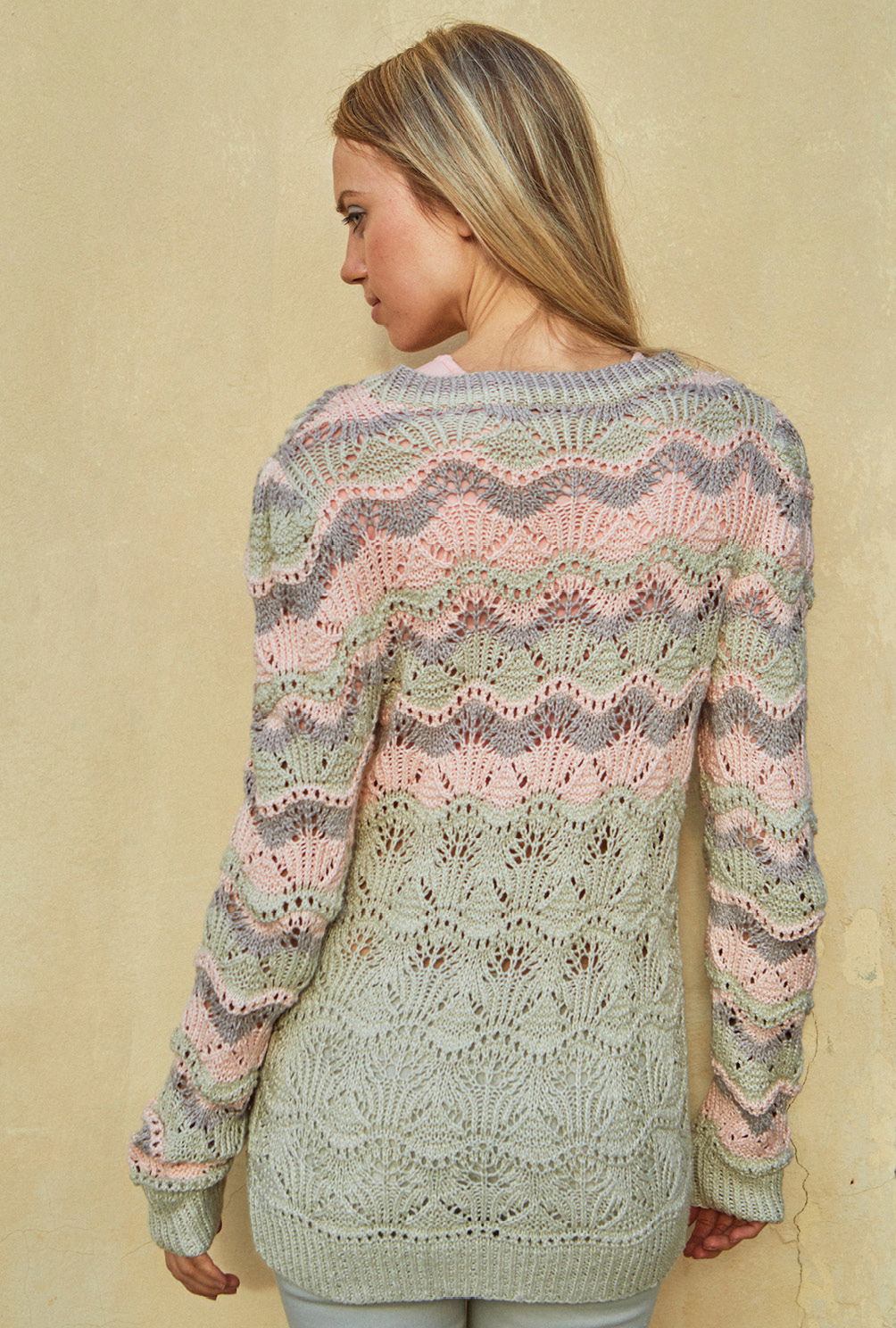 Fantasievolle Ajourmuster sind das eine, harmonische Streifendesigns das andere. Wenn beide sich zusammentun, entsteht eine Optik, die uns mit verführerischem Charme umfängt. Schönstes Beispiel: Diese Longjacke in zarten Muscheltönen. Das weiche, anschmiegsame Mischgarn sorgt zusätzlich für eine angenehme, fließende Silhouette. Gestrickt wird der sommerliche Cardigan in Einzelteilen von unten nach oben. Nach dem Rippenbündchen geht es für das Rückenteil allover im Ajourmuster weiter. Das Muster benötigt schon etwas Aufmerksamkeit, aber die übersichtliche, klare Strickschrift hilft dabei, stets den Überblick zu behalten. Lediglich bei den Ab- und Zunahmen muss darauf geachtet werden, dass sich die Umschläge und zusammengestrickten Maschen immer ausgleichen. Bei den Vorderteilen wird zusätzlich zum Lacemuster die Rippenblende gleich mitgestrickt – das sieht schön aus und ist auch noch praktisch. So müssen zum Schluss nur noch die Nähte geschlossen und die Blende für den Halsausschnitt gestrickt werden. Am besten nimmt die fertige Jacke jetzt noch ein kleines Bad und wird im Liegen getrocknet. Dabei schön in Form bringen und glattstreichen – so öffnet sich das Lacemuster und entfaltet seine ganze Pracht.