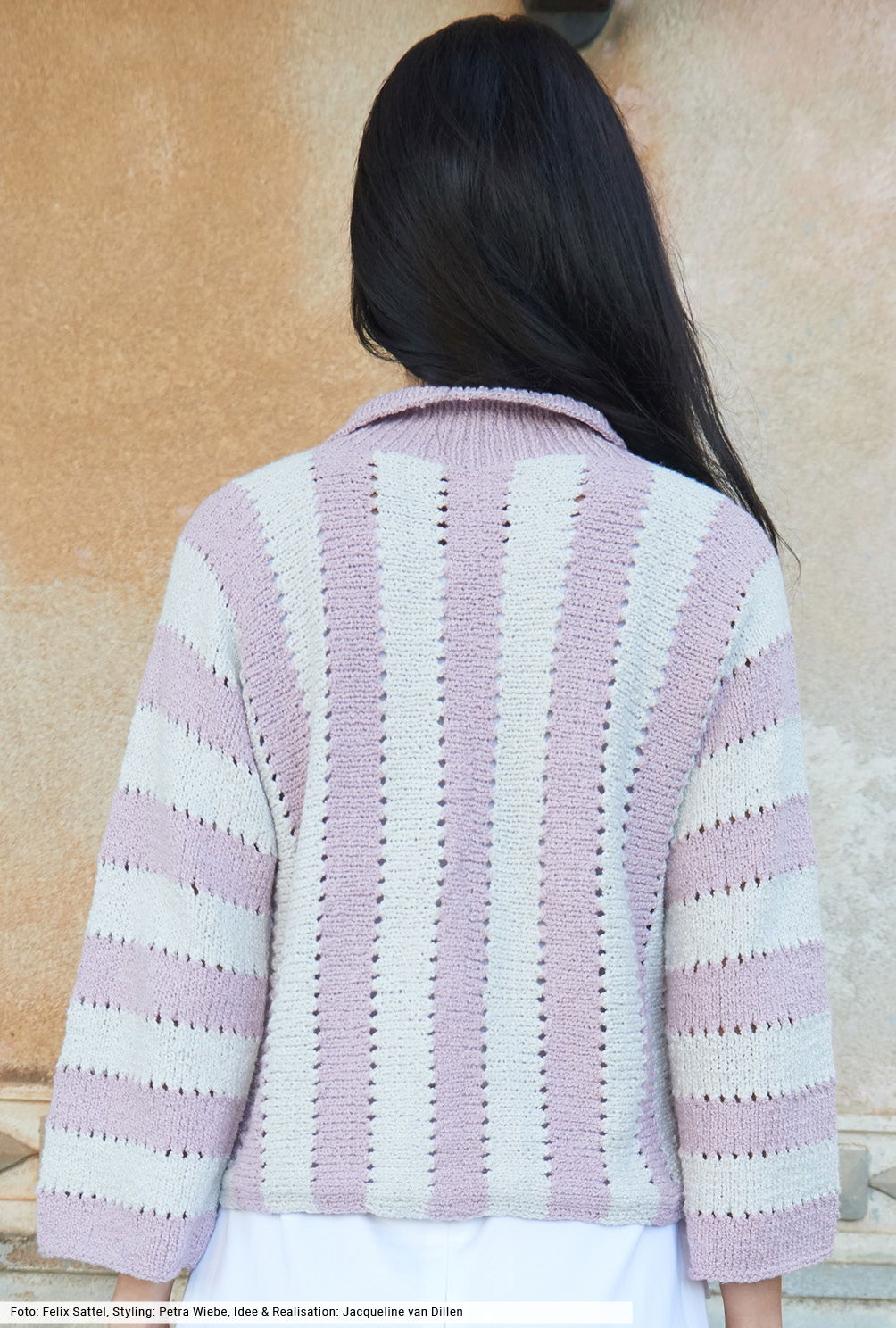 Für einen sanften Einstieg in den Frühling: Hellgrau und Rosé im Wechselspiel. Vom Ärmel bis zur vorderen beziehungsweise rückwärtigen Mitte gestrickt legen sich hier die schlichten Blockstreifen quer und lassen eine taillenkurzes Jäckchen entstehen, das besonders zu weiten Hosen oder schmalen Röcken kombiniert werden kann. Wir haben es aus einem frottee-ähnlichen Effektgarn gestrickt, das für die lässige Optik sorgt. Die farblich passenden Knöpfe kannst du direkt beim Hersteller bestellen.