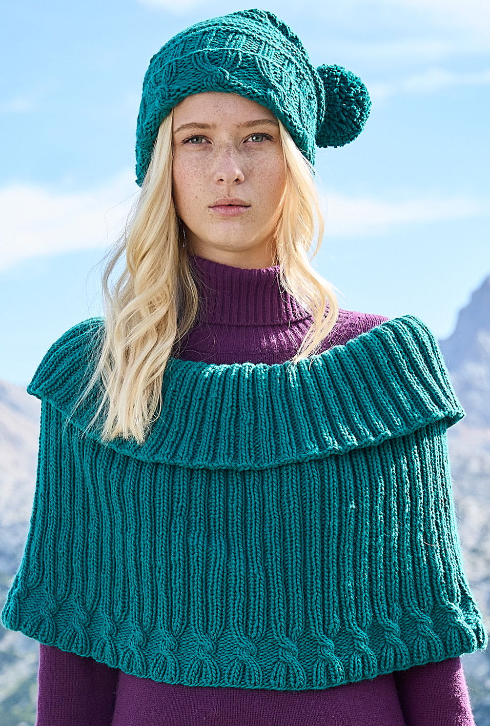 Eine Zopblende für den Abschluss, den Rest in Längsrippen – so einfach strickt sich das kurze Cape, durch dessen oberen Rand ein Hutgummi zur Stabilisierung gezogen und zum Schluss nach außen umgeschlagen wird. Das gleiche Spiel bei der passenden Mütze: Auch hier beginnt man mit der Zopfblende und setzt die Arbeit mit Querrippen fort. Ein selbstgemachter Pompon bildet den kessen Abschluss. Beide Teile garantieren durch das luxuriöse Kaschmirgarn bei Minunsgraden Wärme und Behaglichkeit.