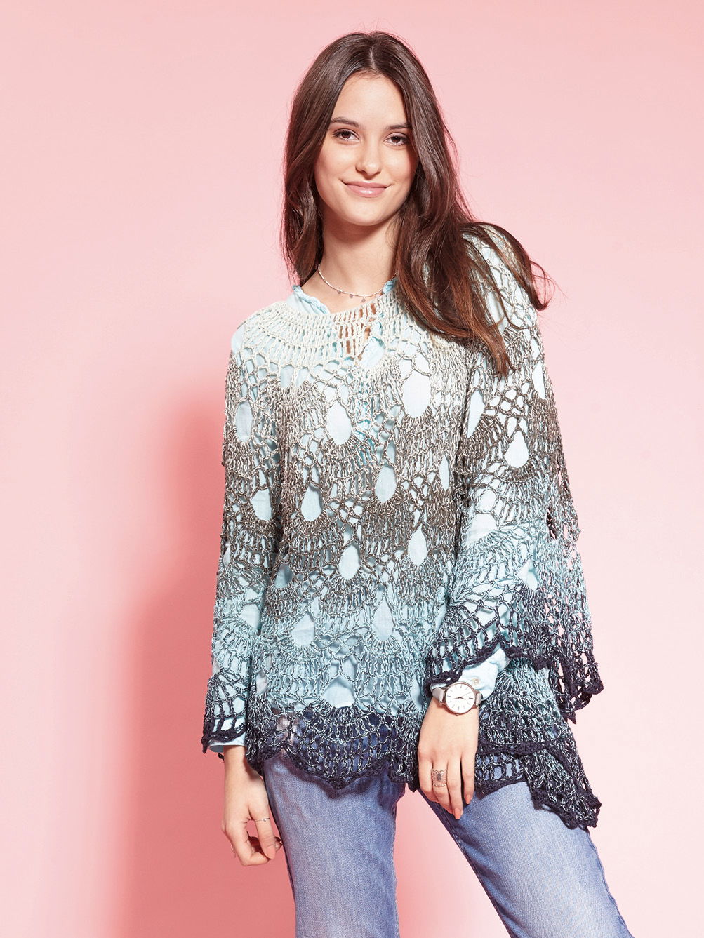 Aufsehenerregend ist dieser Poncho. Am Ausschnitt begonnen, wird er in immer größer werdenden Runden gehäkelt. Das Muster besteht aus Luftmaschen, festen Maschen, Stäbchen und überwiegend Doppelstäbchen. Für die Zunahmen werden an vier Stellen die Maschenmarkierer gesetzt. Sie werden am besten in jeder Runde mitgeführt. So weiß man immer genau, wo die Zunahmen gearbeitet werden. Ab der 14. Runde beginnt die Formgebung, damit der Poncho nicht zu weit wird. Es ist aber einfach, wenn du genau nach Anleitung und der zusätzlichen Häkelschrift arbeiten. Sollte dir der Poncho zu lang werden, kannst du ihn natürlich früher beenden. Wichtig ist nur, dass zum Schluss die 19. Runde als schöner Abschluss gehäkelt wird. Du benötigst eine Häkelnadel Nr 4. Das schöne Verlaufsgarn in Blau-Grau Tönen ist von Langendorf & Keller. Und der Poncho deckt die Größen 36, 38, 40, 42, 44 und 46 ab.