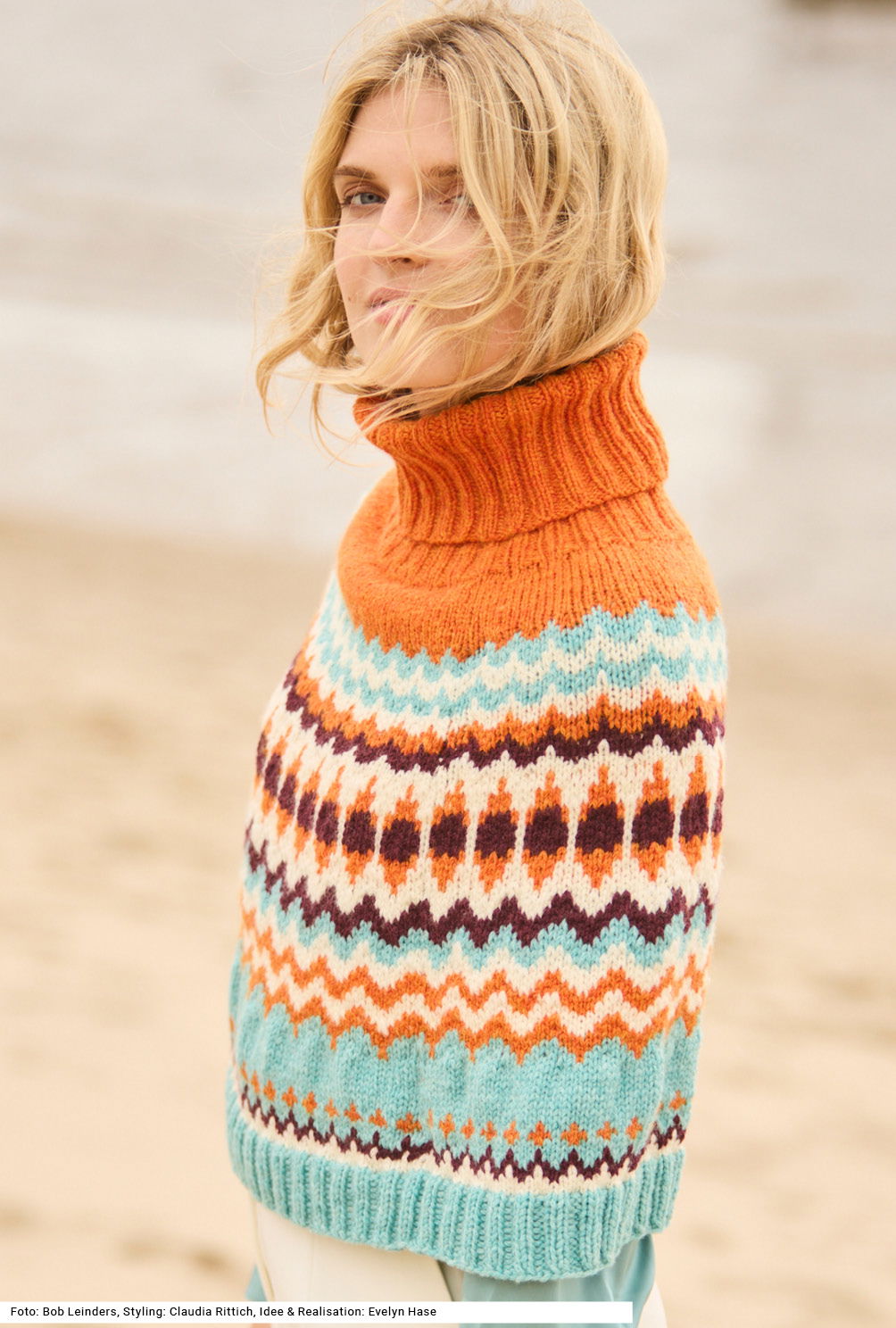 Diese Pelerine gibt nordischem Flair eine moderne Interpretation: Das klassische Jacquardmuster wird in vier lebendigen, angesagten Farben gearbeitet und mit einem voluminösen Rollkragen kombiniert. In Runden von oben nach unten gestrickt, entsteht ein harmonischer Farbverlauf, der das detailreiche Muster unterstreicht. Das leichte Kettengarn aus Merinowolle mit etwas Polyamid-Beimischung sorgt für angenehmen Tragekomfort bei maximaler Wärme. Ob über Mantel, Bluse oder Pullover – dieses Modell eignet sich hervorragend für Layering-Looks. Die Anleitung dazu gibt es für die Größen 36 – 40 und 42 – 46 sowie 48/50.