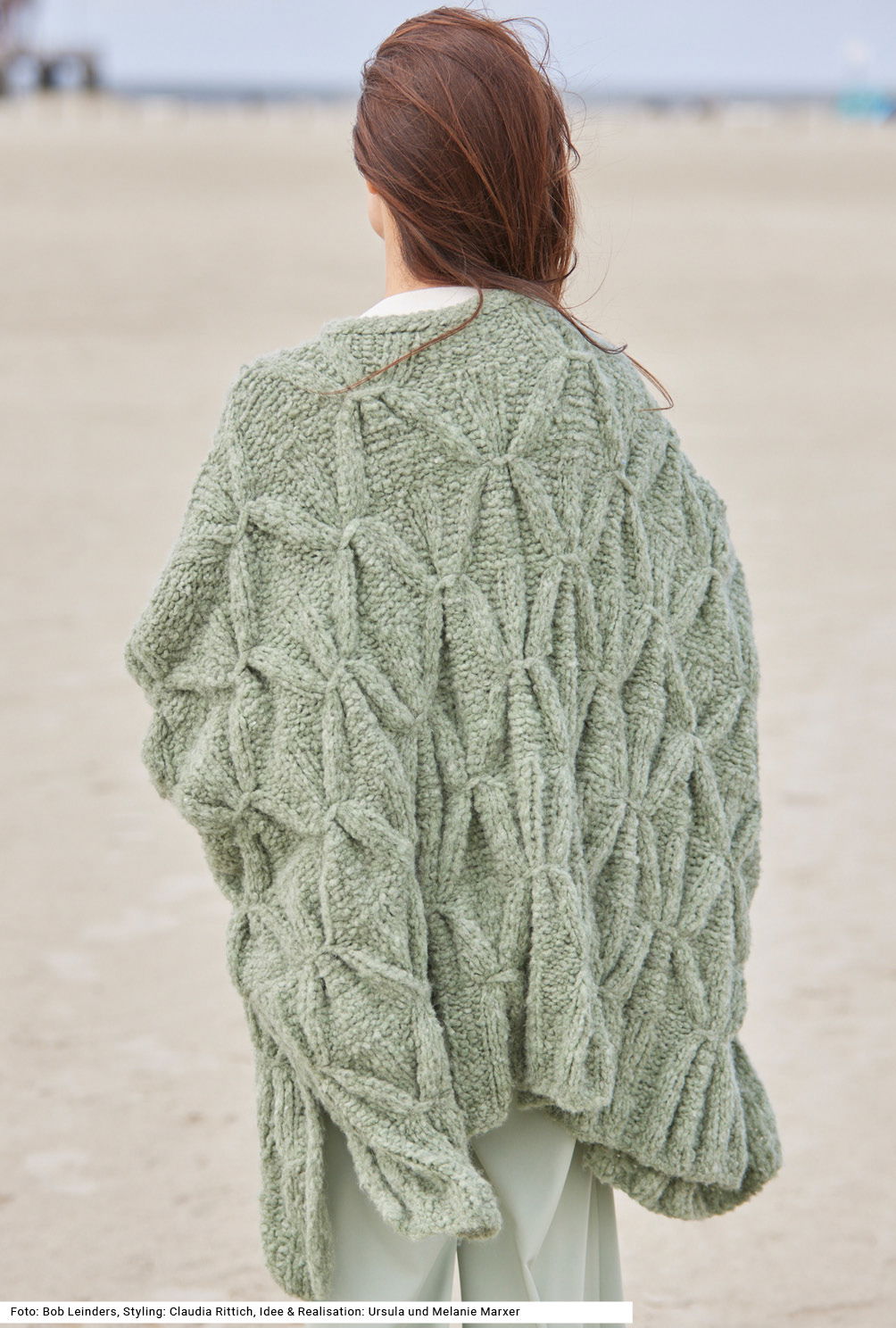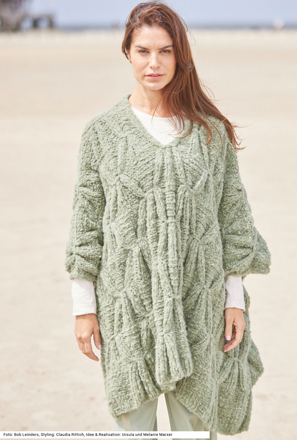Mit diesem in einem Stück gearbeiteten Poncho stehst du garantiert im Mittelpunkt. Das einfach zu strickende Muster mit umwickelten Maschen, die wie gesmokt wirken, aus einem federleichten grünen Flauschgarn aus Schurwolle, Alpaka und etwas Polyamid gelingt auch AnfängerInnen mit etwas Strickerfahrung. Lediglich der I-Cord-Rand, der um den Halsausschnitt gestrickt wird, dürfte neu sein – jedoch nach genauer Anleitung ist das ganz einfach. Der Poncho passt idealerweise zu schmalen Hosen oder Röcken. Die Anleitung dazu kann für die Größen 36 – 42 und 44 – 50 downgeloadet werden.