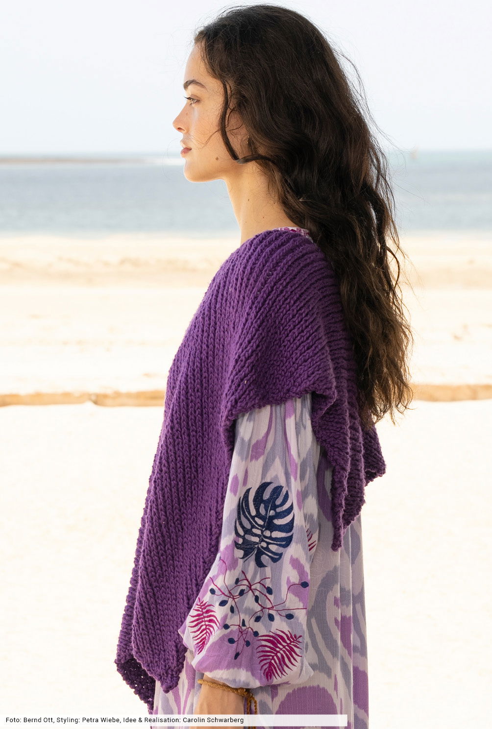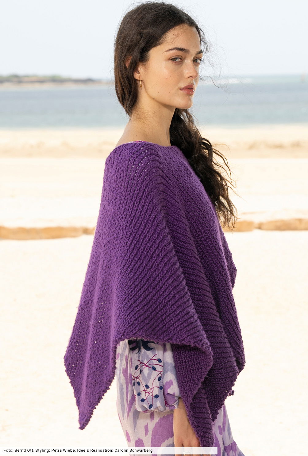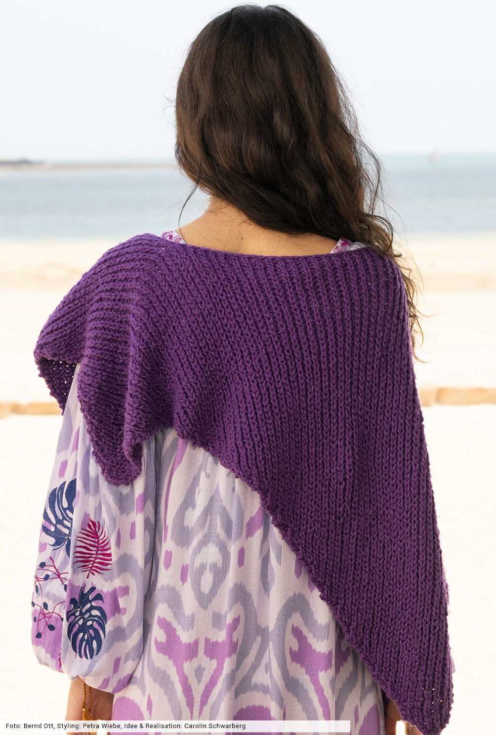 Innovative Passformen verleihen der Masche die ausdrucksstarke Silhouette. Bei diesem Sommerponcho in leuchtendem Lila ist es der asymmetrische Schnitt, bei dem an beiden Seitenkanten unterschiedlich zugenommen wird. Ein ganz neues Patentmuster und das softe, in sich leicht strukturierte Baumwollgarn unterstreichen das lockere Volumen. Das Teil wird über die Schultern an einem Stück gestrickt und kommt ganz ohne Blenden aus – easy going!