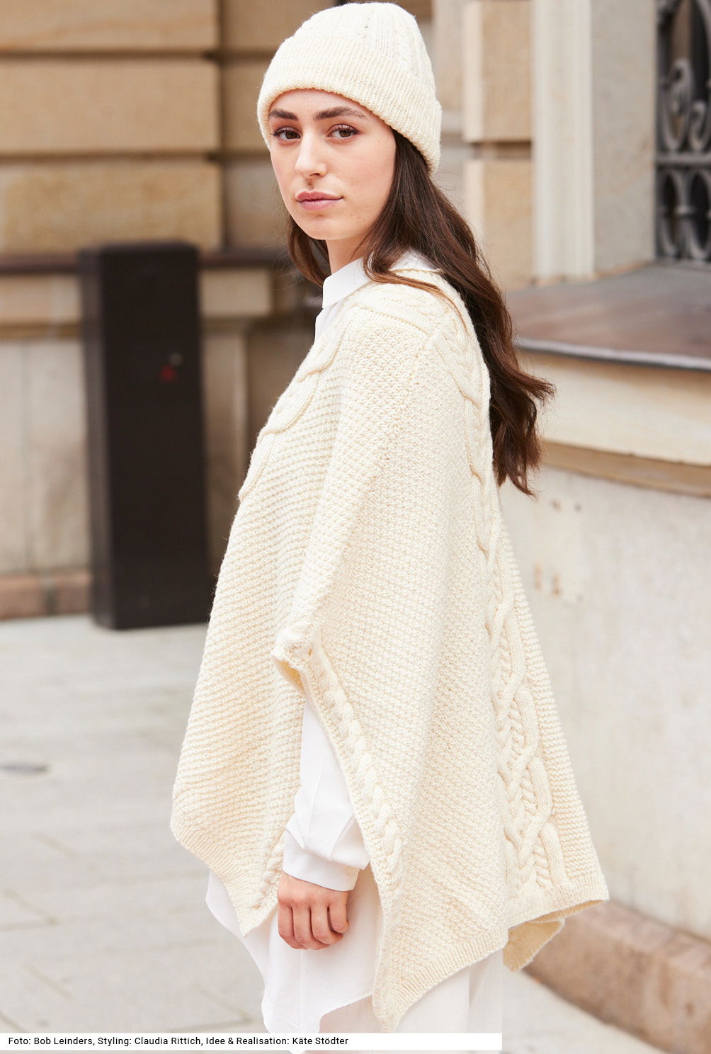 Als stilvolle Alternative zu Jacken ziehen Ponchos immer noch die Blicke auf sich. Designer auf der ganzen Welt interpretieren den südamerikanischen Poncho immer wieder auf neue Art und fügen moderne Elemente hinzu. Bestes Beispiel ist dieses Design, das mit verschlungenen Zopf-Strängen glänzt, welche den Rahmen für ein plastische Perlmuster bilden. Perfekte Ergänzung dazu: eine Mütze mit Umschlag. Für den Überblick bei dieser Musterpracht sorgen die übersichtlichen Strickschriften in der Anleitung. Tipp: Um die Mustereinteilung noch übersichtlicher zu machen, helfen Maschenmarkierer zwischen den einzelnen Mustern.