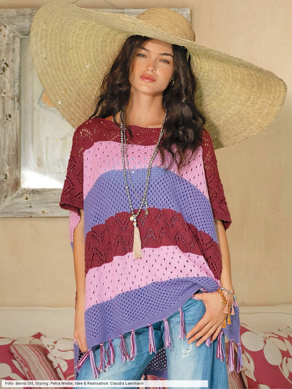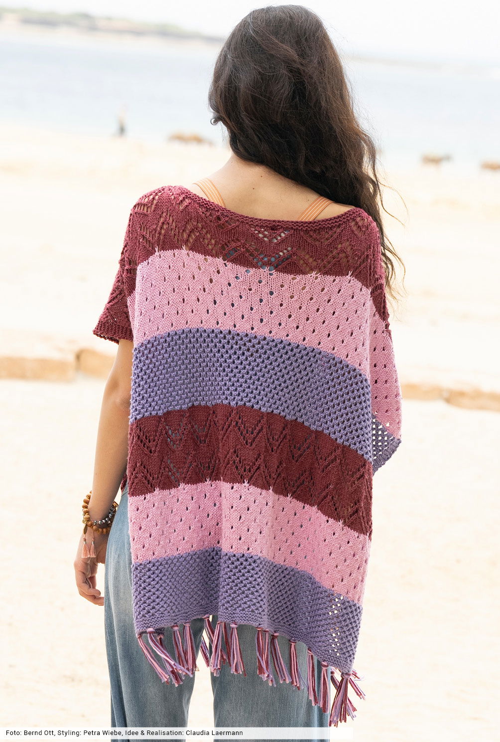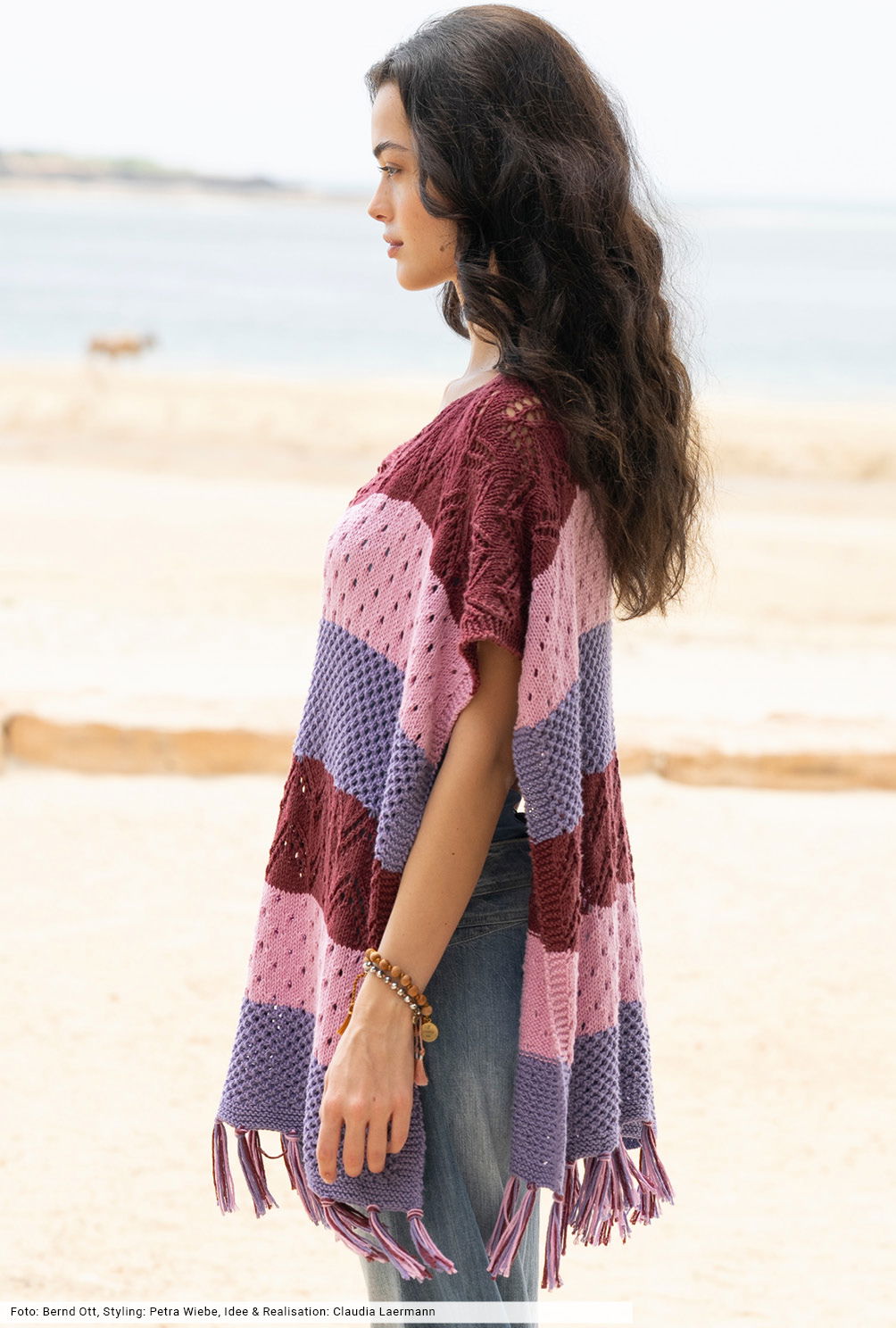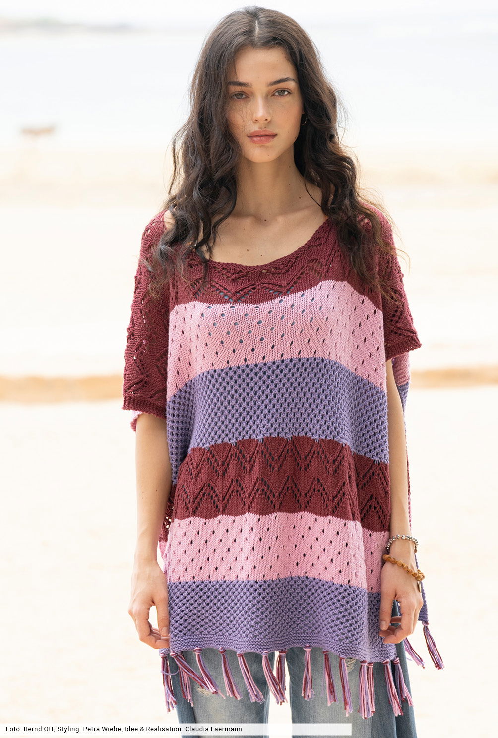 Voluminöse Ponchos sorgen für den Boho-Touch und vervollständigen jedes Outfit. Das dreifarbige Design aus breiten Streifen lässt viel Raum für die unkomplizierten Netz- und Lochmusterstrukturen. Sie werden ganz einfach gerade hochgestrickt und zu beiden Seiten durch schmale Kraus-rechts-Blenden einrandet – ein toller Trick um sich das Auffassen der Blenden zu ersparen. Die Saumkante zieren dreifarbige Fransen, die zum Schluss mit der Häkelnadel eingeknüpft werden.