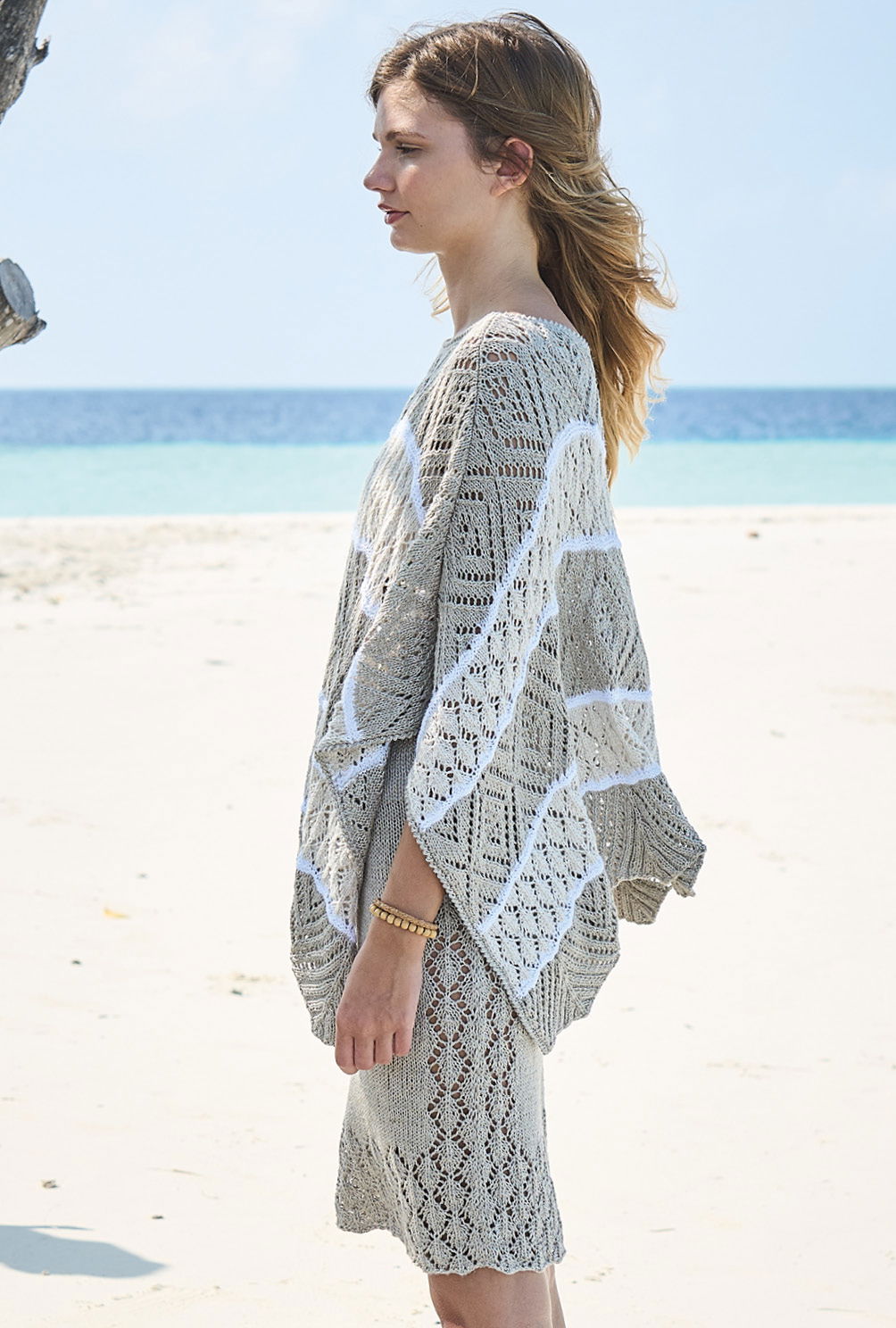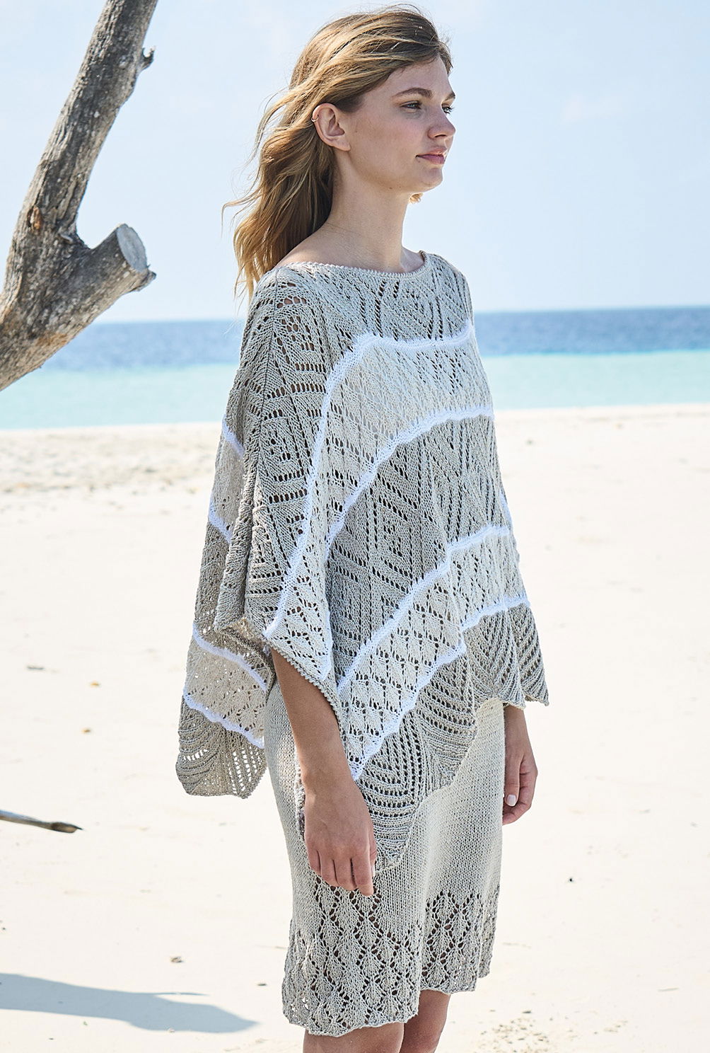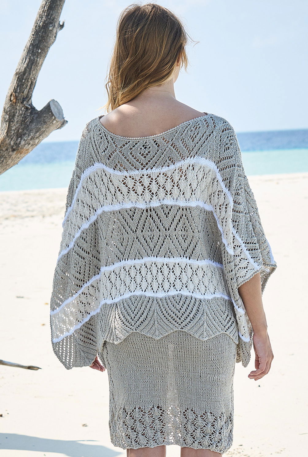 Diese Kombination aus lässiger Weite und elegant schmalem Rock macht einfach immer eine gute Figur! Weiteres Plus: Das Garn aus Baumwolle, Viskose und Leinen sorgt von Kopf bis Fuß für perfekten Wohlfühlkomfort. Auch wenn die hier verwendeten Lacemuster nicht unbedingt anfängertauglich sind, bietet dieses Set ganz viel Abwechslung und Strickspaß. Die großen, übersichtlichen Strickschriften helfen dabei, stets den Überblick zu behalten. Immer der Muster- und Streifenfolge nachgehend, geht es bei dem Poncho immer nur gerade hoch, da kann man sich sehr gut ganz auf das Muster konzentrieren. Damit der Rock auch blickdicht und somit alltagstauglich ist, erhält er am unteren Rand eine zarte Bordüre, in deren Anschluss die mittleren Bereiche glatt rechts gestrickt werden. Ist alles fertig, nimmt das neue Ensemble dann am besten noch ein kleines Bad und wird schön glatt ausgestrichen und liegend getrocknet. Dabei entfaltet das Ajourmuster seine volle Schönheit.