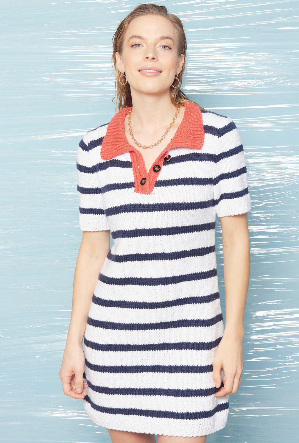 Ein maritimer Hingucker erwartet euch mit diesem Projekt. Das taillierte Kleid besticht durch das ausdrucksstarke Streifenmuster und der besondere Akzent wird durch den Polokragen gesetzt. Ein tollen Teil, das gar nicht schwer zu stricken ist. Alle Teile werden einzeln in Reihen gearbeitet und zum Schluss zusammengefügt. Durch betonte Zu- und Abnahmen schmiegt sich das Kleid perfekt an die Figur. Der rote Polokragen wird zum Schluss angestrickt. Die Anleitung enthält einen detaillierten Schnitt und die Größen 36/38, 40/42 und 44/46. Das Garn gibt es bei Langyarns, gestrickt wird mit der Nadelstärke 5,5.