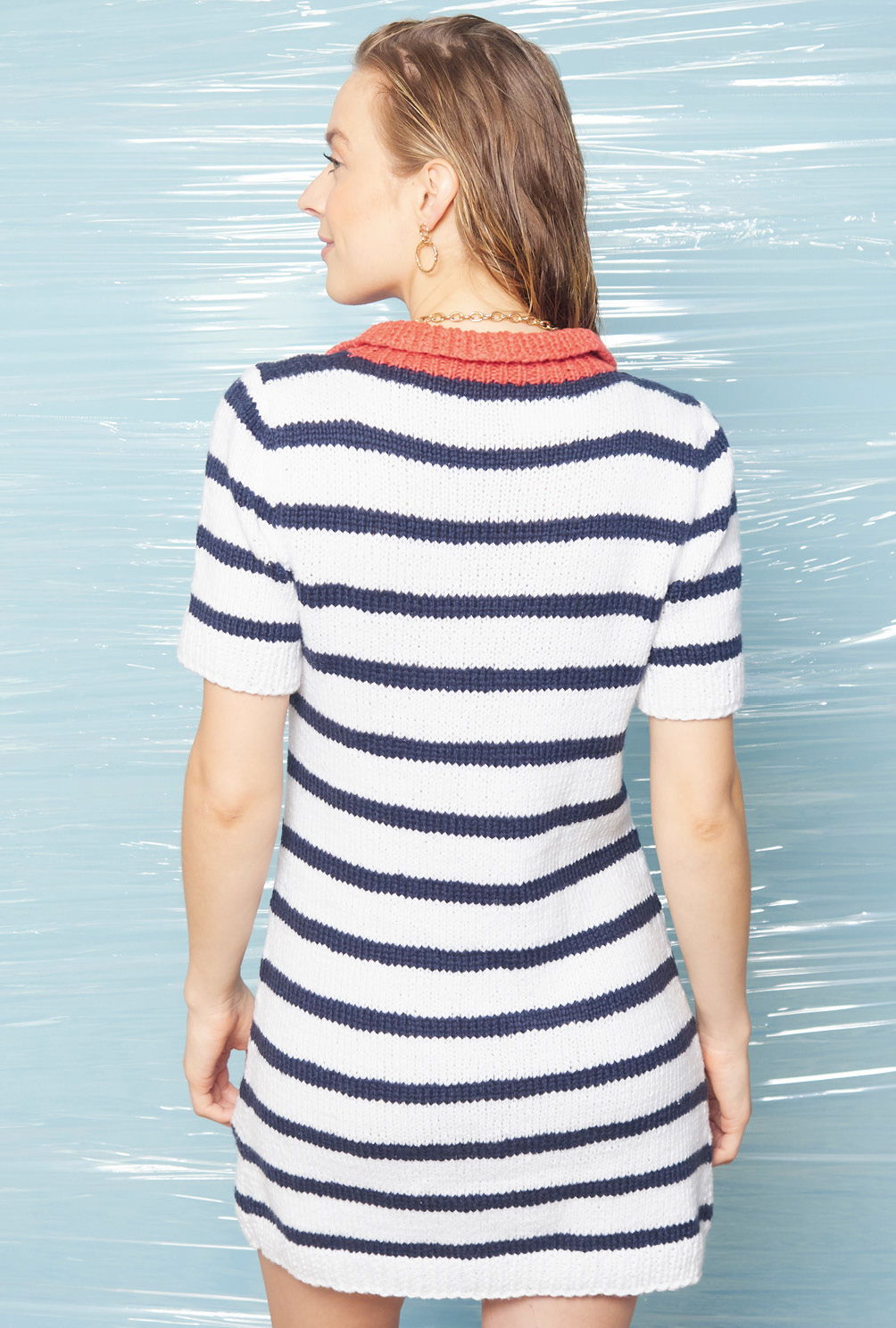 Ein maritimer Hingucker erwartet euch mit diesem Projekt. Das taillierte Kleid besticht durch das ausdrucksstarke Streifenmuster und der besondere Akzent wird durch den Polokragen gesetzt. Ein tollen Teil, das gar nicht schwer zu stricken ist. Alle Teile werden einzeln in Reihen gearbeitet und zum Schluss zusammengefügt. Durch betonte Zu- und Abnahmen schmiegt sich das Kleid perfekt an die Figur. Der rote Polokragen wird zum Schluss angestrickt. Die Anleitung enthält einen detaillierten Schnitt und die Größen 36/38, 40/42 und 44/46. Das Garn gibt es bei Langyarns, gestrickt wird mit der Nadelstärke 5,5.