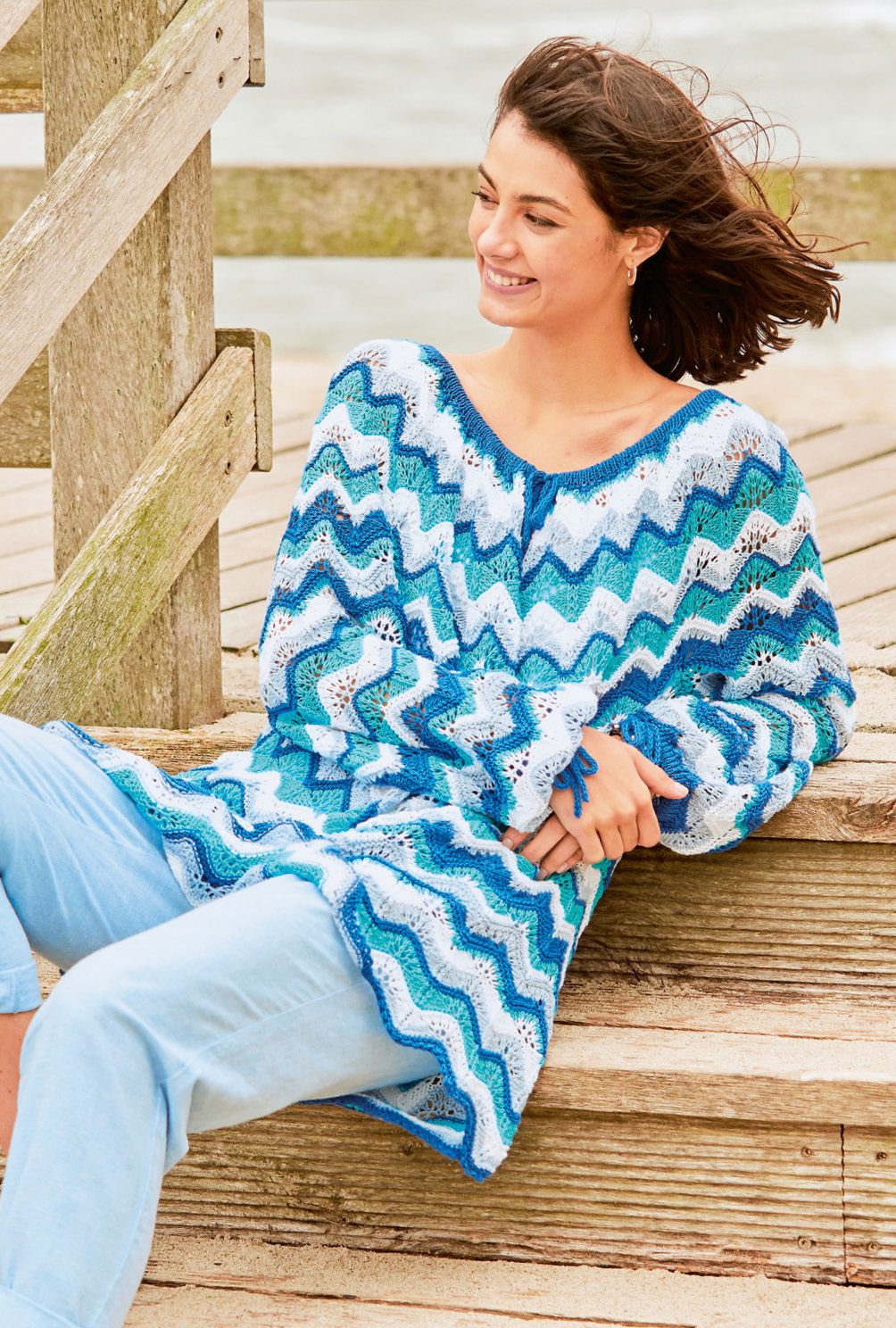 Richtig viel kreatives Potential steckt in dieser raffinierten Tunika! In sanften Blautönen gestrickt macht sie unsere schlichten Hosen oder Jeans als trendiger Longpulli zum Hingucker und zeigt sich dabei durchaus bürotauglich. Zur Leggins oder blickdichten Strumpfhose als bequeme, weich fließende Tunika getragen, begleitet sie uns in der Freizeit. Und wenn wir sie einfach ein oder zwei Mustersätze länger stricken und vielleicht noch mit einem Gürtel tragen, wird sie zum sexy Sommerkleid. Da passt es doch perfekt, dass sie sich zudem ganz hervorragend zur Resteverwertung unserer Sommergarne eignet. Und da es so viel Spaß macht kreativ mit Farben zu spielen, bietet es sich doch an, gleich mehr als eine Tunika zu stricken. Zumal das Zackenmuster wirklich nicht schwer zu stricken, dafür aber sehr effektvoll ist. Jede Menge Raum zum Verwandeln lassen auch die Bindebändchen, die als I-Cord gestrickt und dann in die Tunnelblenden der Ärmel und des runden Halsausschnitts eingezogen werden. So können wir je nach Laune oder Anlass jedes Mal neu entscheiden, wieviel Haut wir gerade zeigen mögen.