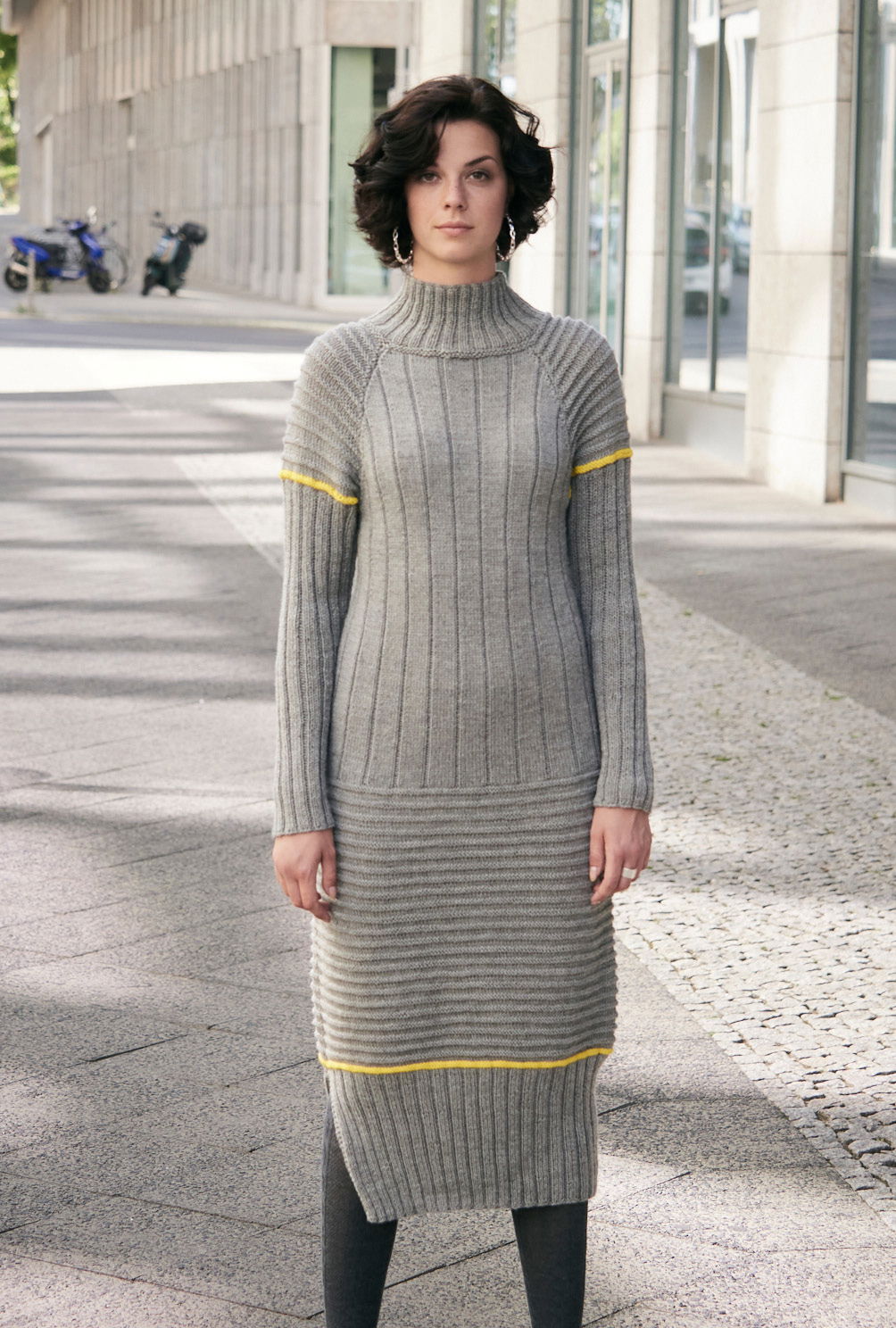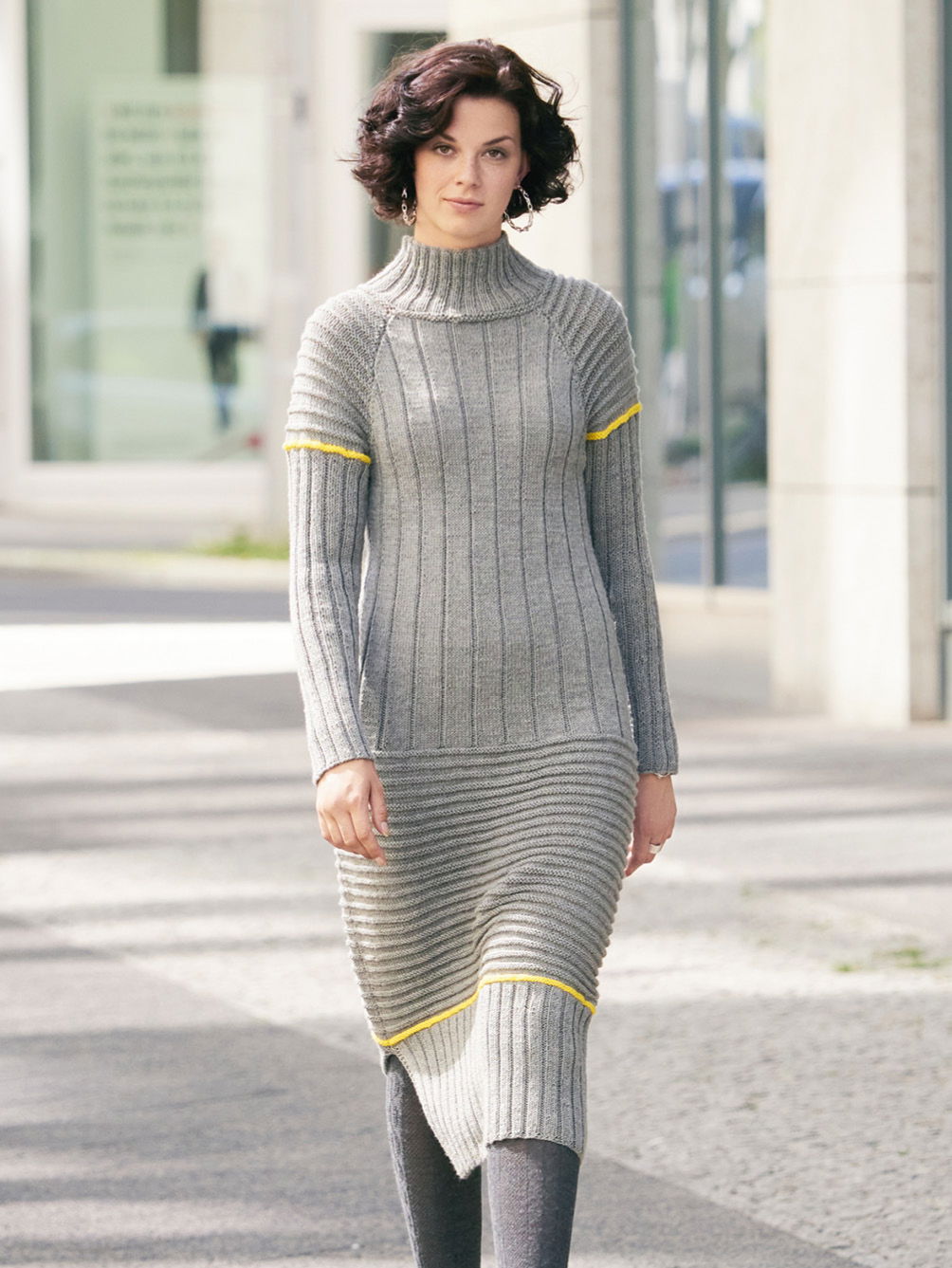 Versierte StrickerInnen werden ihre Freude an diesem Kleid haben, denn es erfordert etwas mehr Zeit, weil mit Nadeln Nr. 3,5 gestrickt wird. Jedoch das Ergebnis lohnt die Mühe allemal. Breite und schmale Längsrippen dominieren die Musterabfolge, dazwischen gibt es Querrippen, die glatt rechts und glatt links gearbeitet werden. Für Bequemlichkeit sorgen sowohl die Raglanärmel als auch der Schlitz an einer Seitennaht, der beim Gehen aufspringt. Das figurbetonte Kleid in Midilänge und aus reiner Merinowolle streckt optisch. Die Anleitung steht in den Größen 36/38 (40/42) 44/46 zur Verfügung.