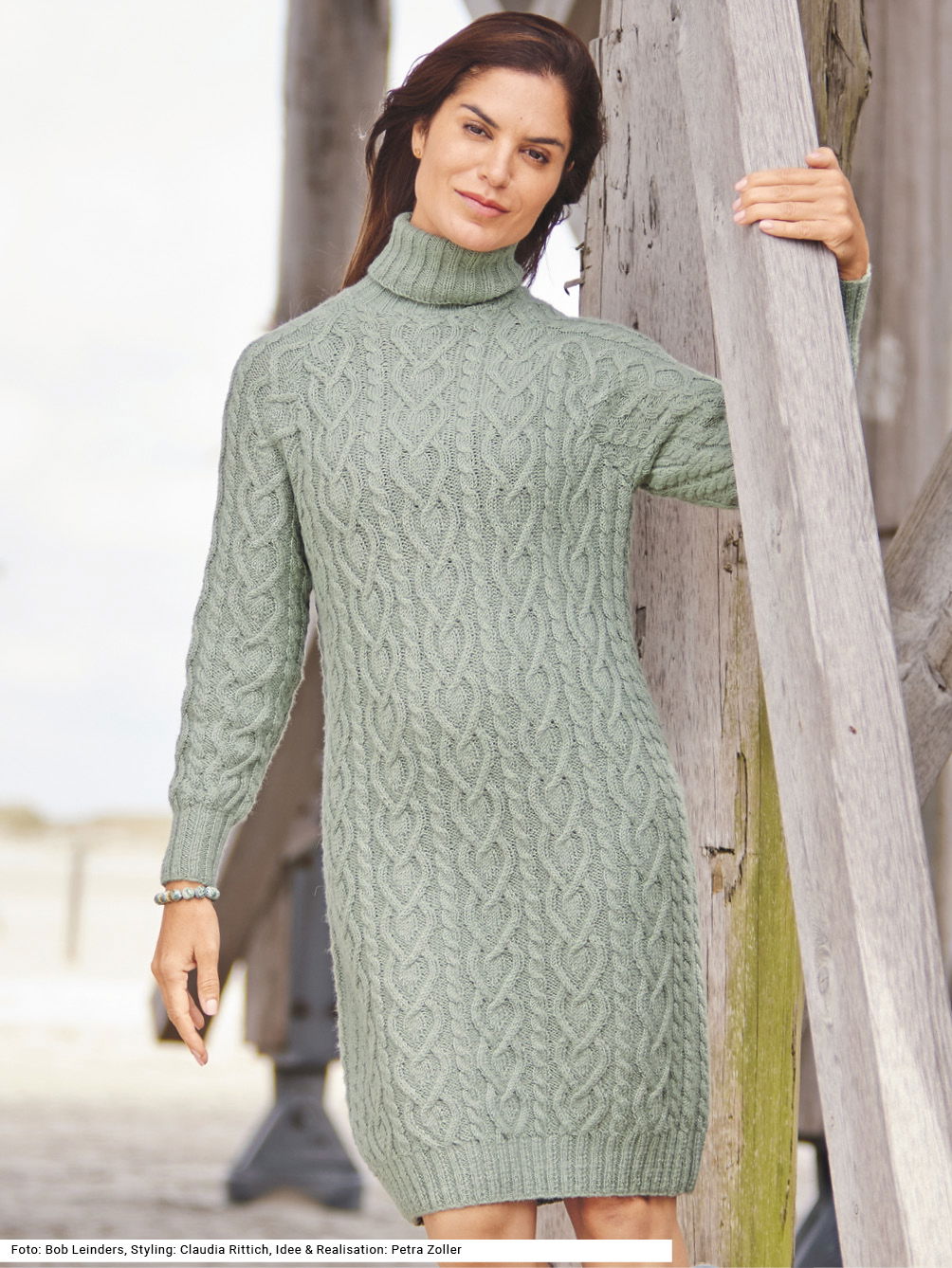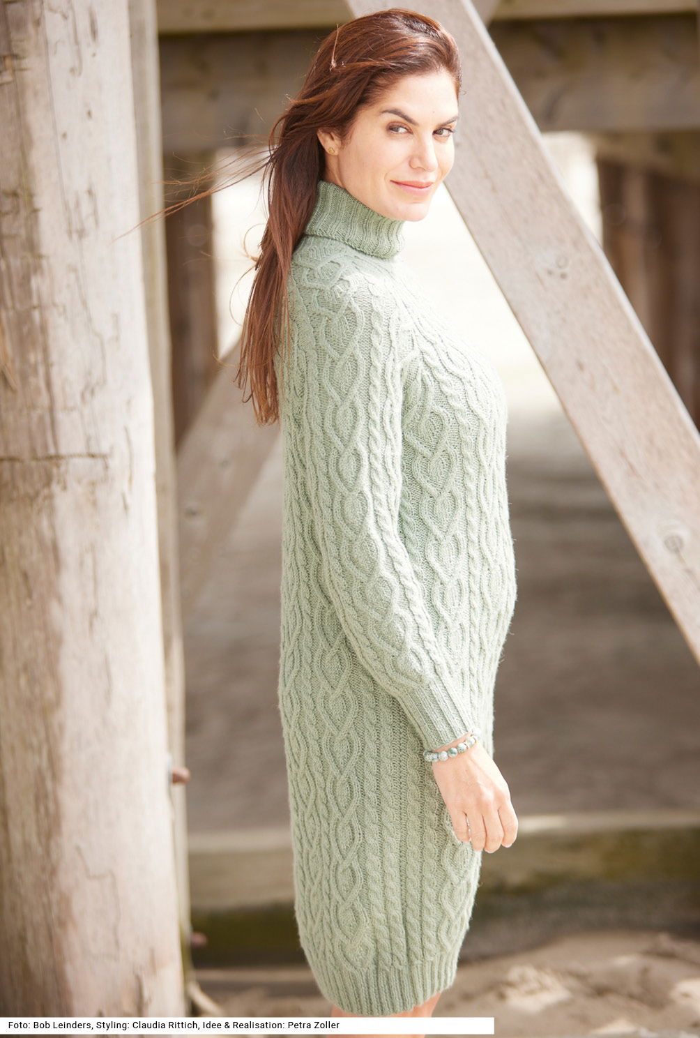 Dieses Kleid in italienischer Länge bis knapp oberhalb der Knie macht eine tolle Figur. Einfach nur, wie hier, mit Boots getragen oder, wenn es kühler wird, mit einer Thermoleggings dazu, ist der winterliche Look perfekt. Das verzopfte Aranmuster ist nicht allzu schwer zu stricken, jedoch ist das Modell aufgrund der Größe etwas zeitaufwendig. Der Rollkragen sowie die Bündchen sind im 2/2-Rippenmuster gearbeitet. Das salbeigrüne Garn ist aus reinem Alpaka. Eine Anleitung gibt es für die Größen 36/38, 40/42 und 44/46.
