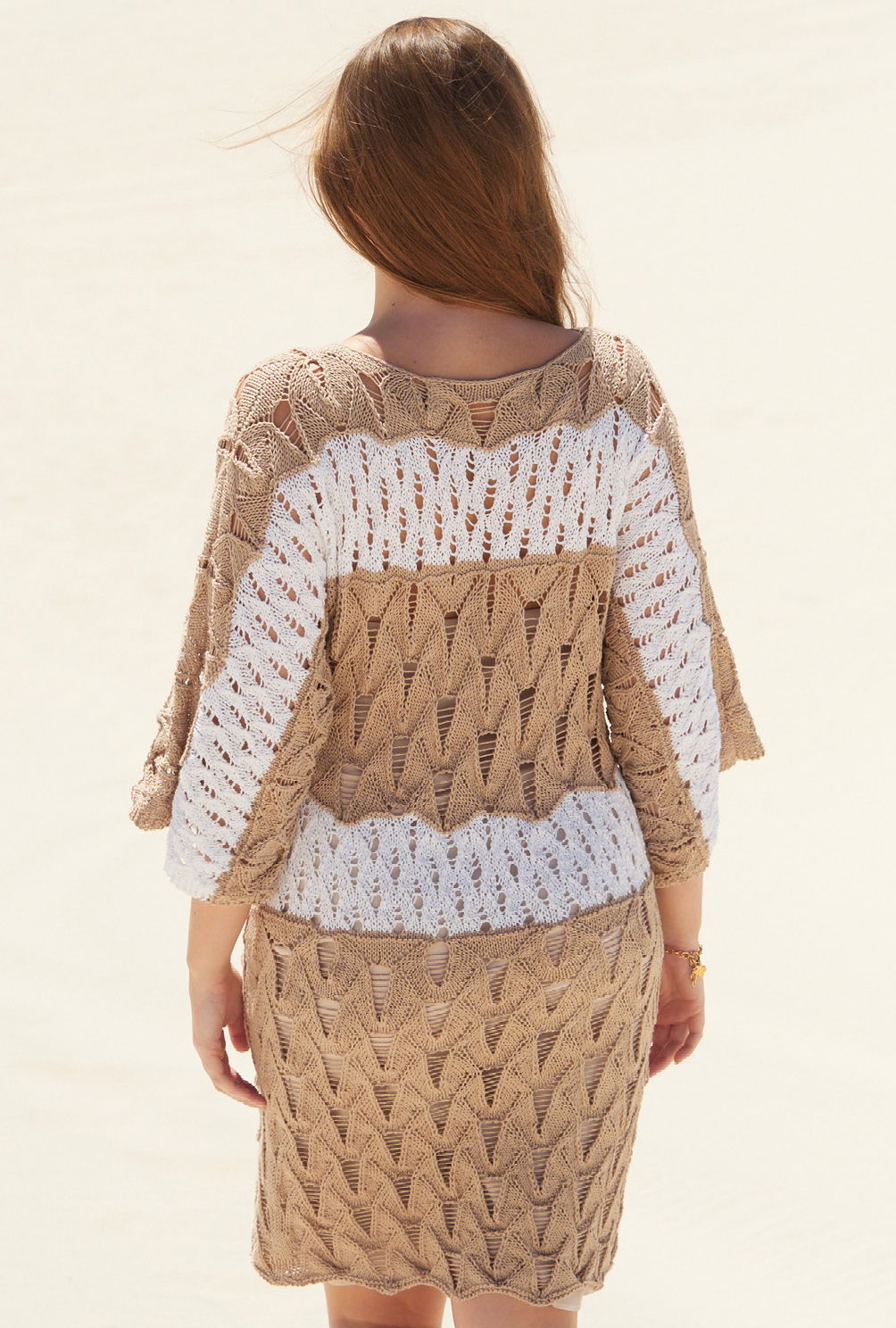 Sabrina Strickjournal Kleid mit breiten Blockstreifen in Sand und Weiß mit Ajourmustern