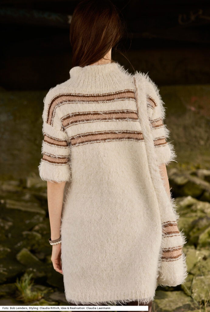 Ein wunderbar flauschiges Duo, bestehend aus Pullikleid mit kurzen Ärmeln und einer geräumigen Tasche, die das Modell perfekt ergänzt. Neben der großen glatt rechts gestrickten flauschigen Fläche wird im oberen Bereich und bei der zweifädig gearbeiteten Tasche eine Kombination aus kraus links, kraus rechts und glatt rechts gearbeitet, wobei die unterschiedlichen Garne eine ganz eigene Struktur ergeben. Die Bündchen und der breite Stehkragen sind im Rippenmuster gestrickt. Die Garne sind aus Schurwolle und Polyamid und zum anderen aus Alpaka, Schurwolle und Polyamid. Eine Anleitung ist für die Größen 36/38, 40/42 und 44/46, Tasche: 30 x 28 cm.