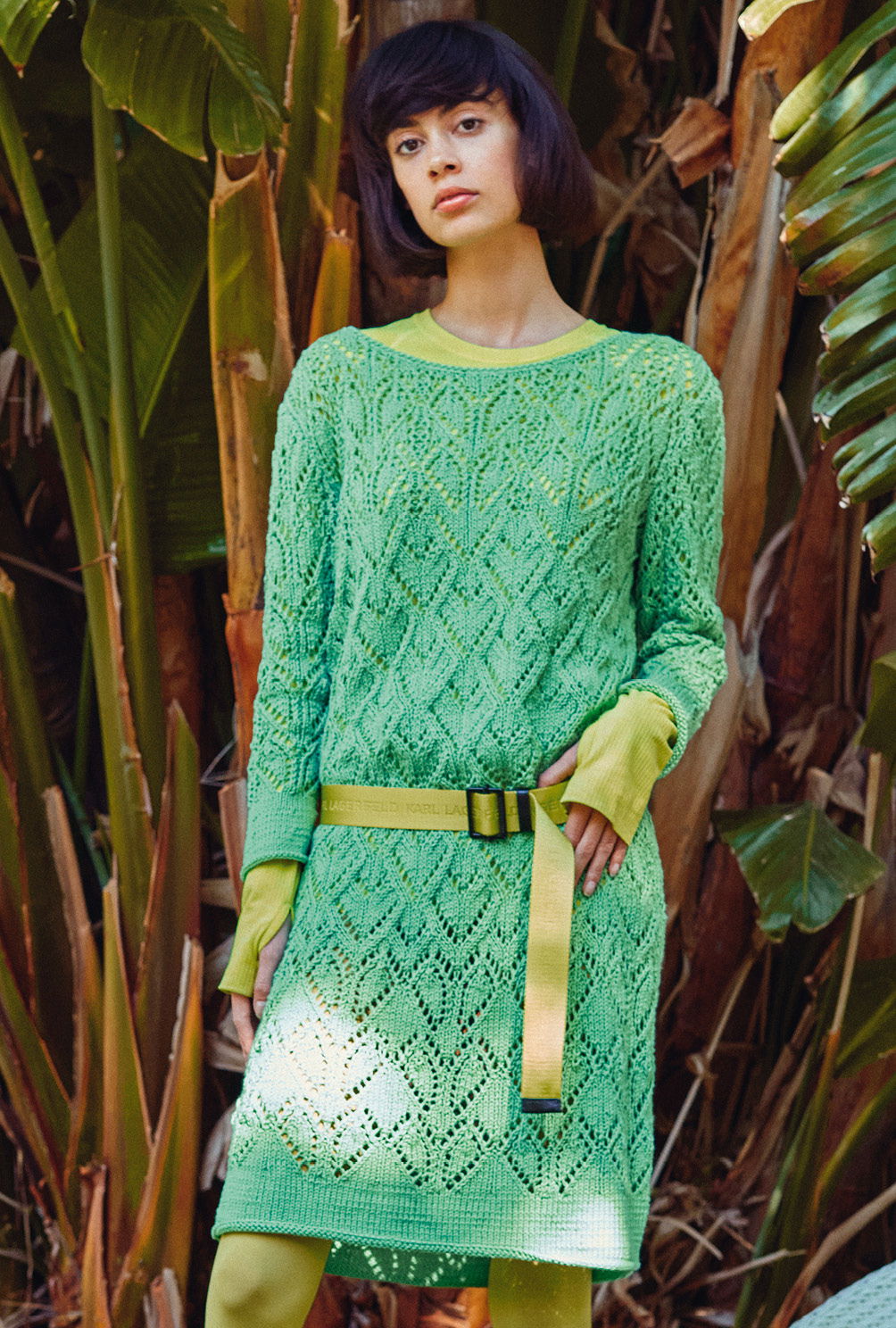 Ob als Kleid oder Tunika getragen – dieses Modell begeistert durch die perfekte Anordnung drei unterschiedlicher Ajourmuster. In leuchtendem Grün ist es zudem ein Ausdruck purer Lebendigkeit. Gestrickt werden Vorderteil, Rückenteil und Ärmel in Einzelteilen von unten nach oben. Begonnen wird immer mit einem glatt rechts gestrickten Bündchen. Dann geht es in der Musterfolge weiter. Nach und nach werden so bei Vorder- und Rückenteil die drei Lochmuster gestrickt. Diese benötigen schon ein wenig Aufmerksamkeit, die übersichtlichen Strickschriften helfen jedoch dabei, stets den Überblick zu behalten. Lediglich bei den Ab- und Zunahmen muss darauf geachtet werden, dass sich die Umschläge und zusammengestrickten Maschen immer ausgleichen. Die Ärmel werden lediglich in einem Ajourmuster gearbeitet, so wird die Gesamtwirkung nicht zu unruhig. Zum Schluss werden noch die Nähte geschlossen und der Halsausschnitt umhäkelt – fertig ist die luftig-leichte Tunika.