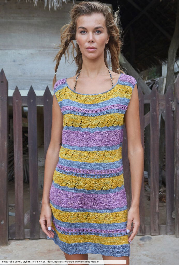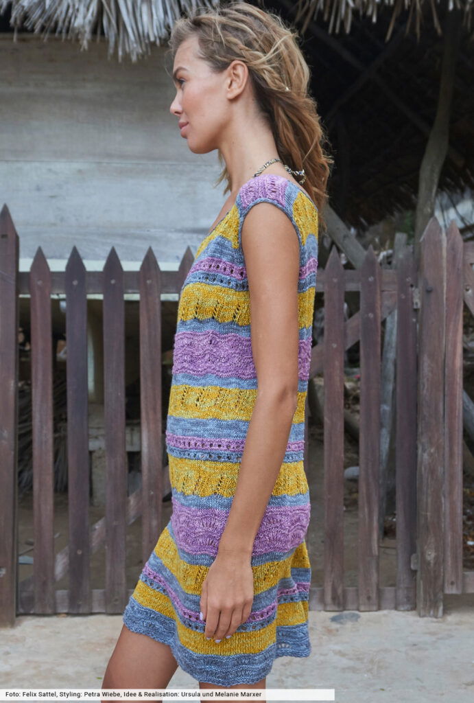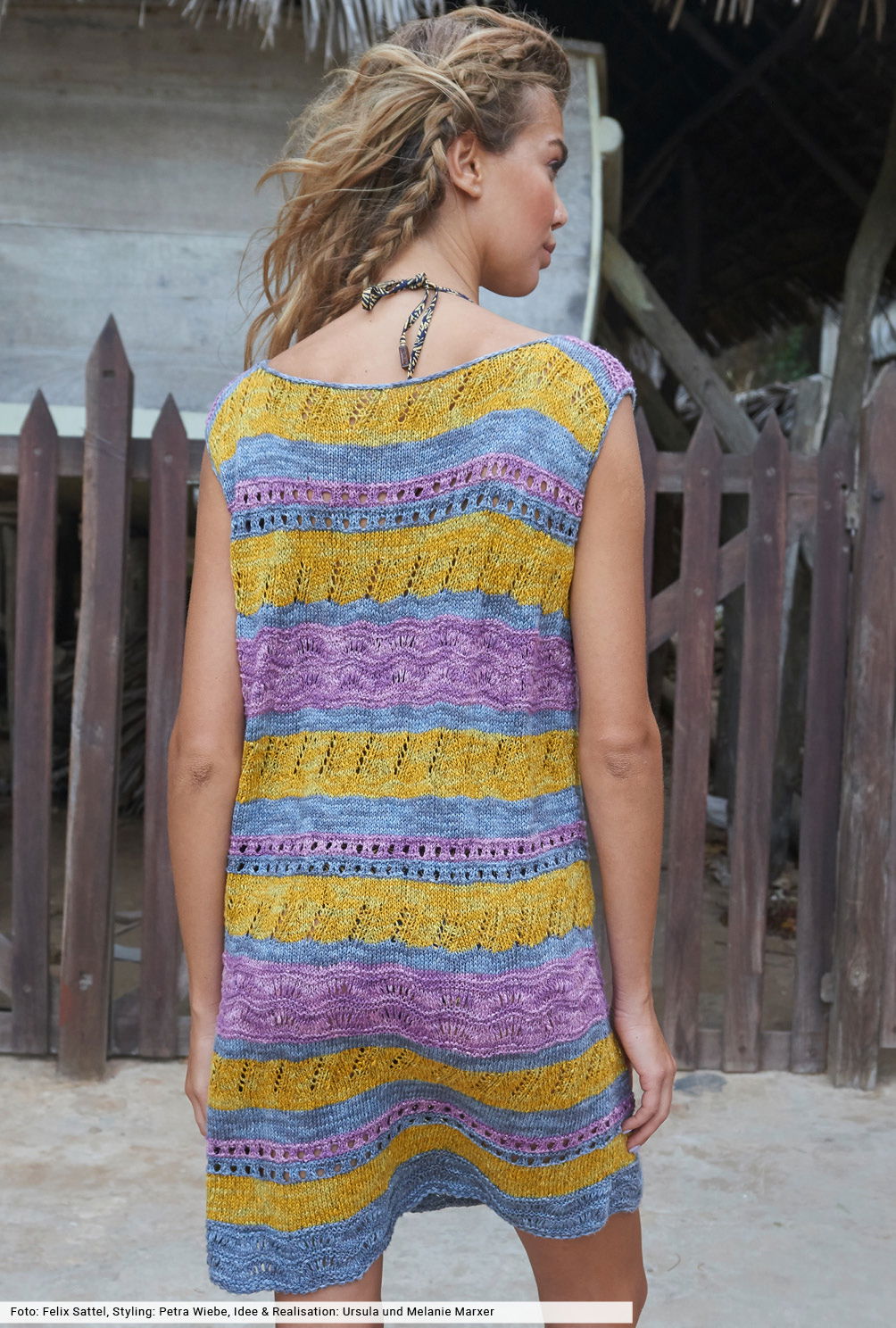 Ein in sich leicht changierendes Garn in Gelb-, Graublau- und Lilatönen wäre an sich schon Abwechslung genug. Wenn dann auch noch verschiedene Lochstrukturen streifenweise ins Maschenspiel kommen, entsteht daraus ein freches Minikleid, das es nicht von der Stange zu kaufen gibt. Die Muster haben wir teilweise verbal beschrieben, für das größere Ajourmuster gibt es eine Strickschrift direkt bei der Anleitung. Die schmalen Blenden an den Armausschnitten und am Halsrand werden in I-Cord-Technik angebracht.