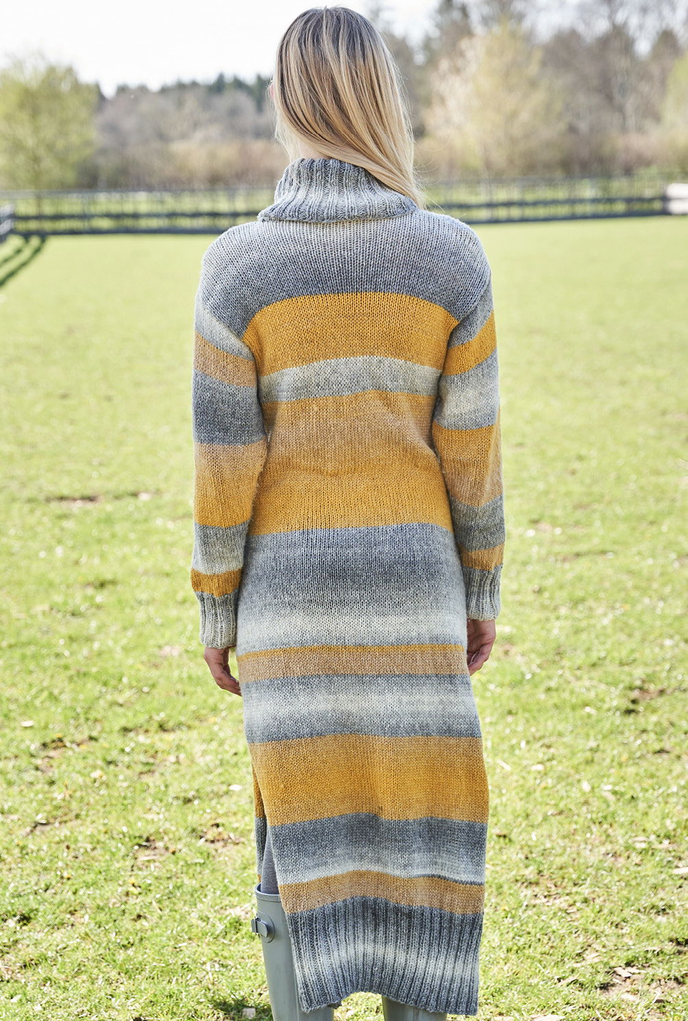 Stil trifft auf Komfort: Strickkleider vermitteln pure Behaglichkeit. Hier aus einem grauen und gelben Farbverlaufsgarn, das sich streifenweise in Szene setzt. Modische Details bietet die angesagte legere Form, breite Rippenblenden und hohe Seitenschlitze. Besonders viel Strickspaß bietet das Arbeiten mit dem Dégrade-Garn in zwei unterschiedlichen Farbgebungen im ansonsten schlichten glatt rechts gestricktem dress. Zuzusehen, wie sich die Farben so harmonisch entwickeln spornt zu ungeahnten strickerischen Höchstleistungen an. So sind die vier Teile mit Nadelstärke 6 auch überraschend schnell fertig gestrickt. Dann werden nur noch die Nähte geschlossen und aus dem Halsausschnitt die Rippenblende herausgestrickt.