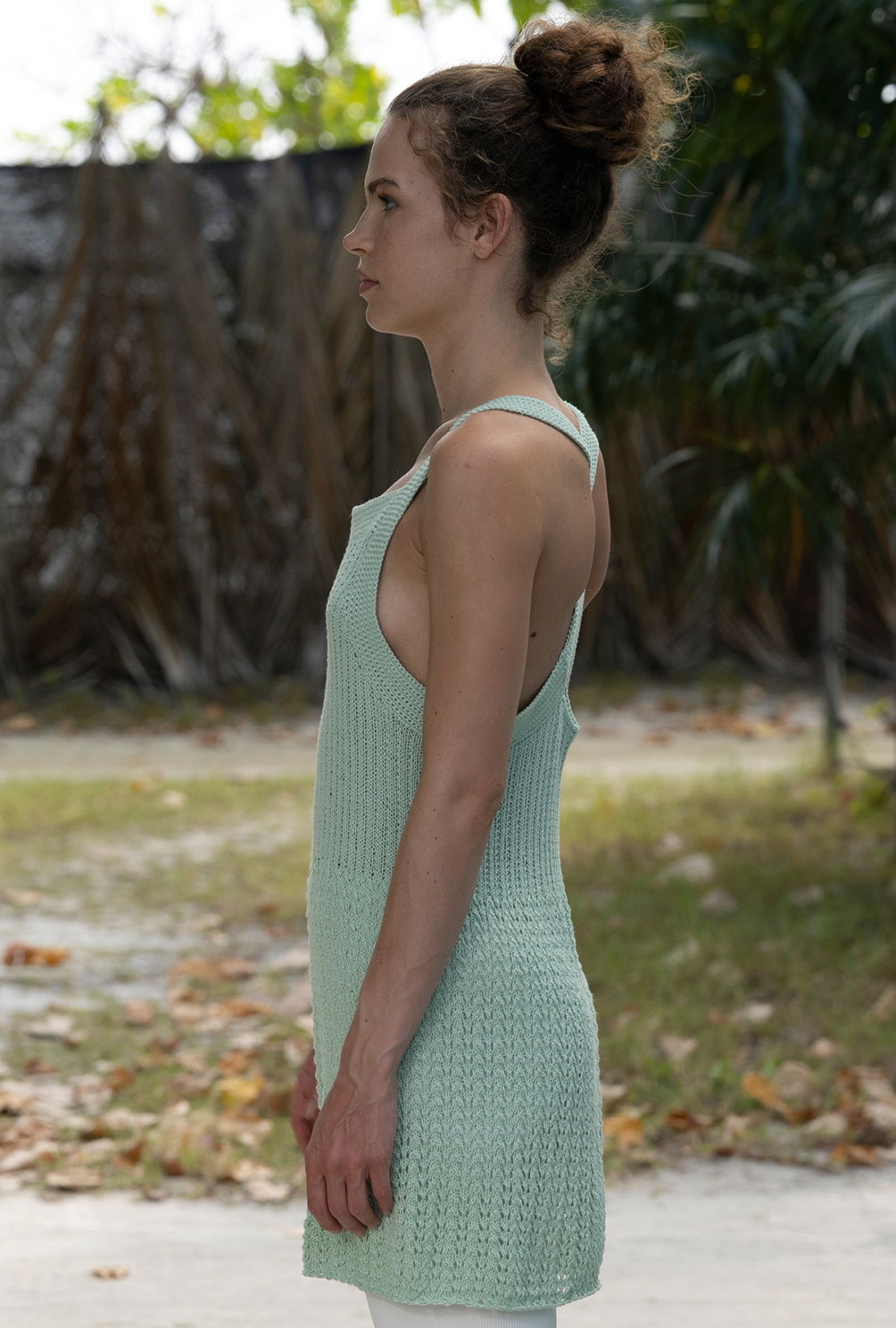 Dieses hübsche Kleid aus mintgrünem Baumwoll-Mischgarn wird mit Ajour- und Rippenstrukturen bis zu den Armausschnitten in Runden gearbeitet. So kommst Du zügig voran und ersparst Dir die Seitennähte. Danach heißt es allerdings aufgepasst, denn die Konfektion der gehäkelten Ärmelblenden und überkreuz gelegten Rückenträger sollte perfelt ausgeführt werden. Dafür gibt es in unserer Anleitung eine passgenaue Beschreibung, die Dich sicher zum Ziel führt.