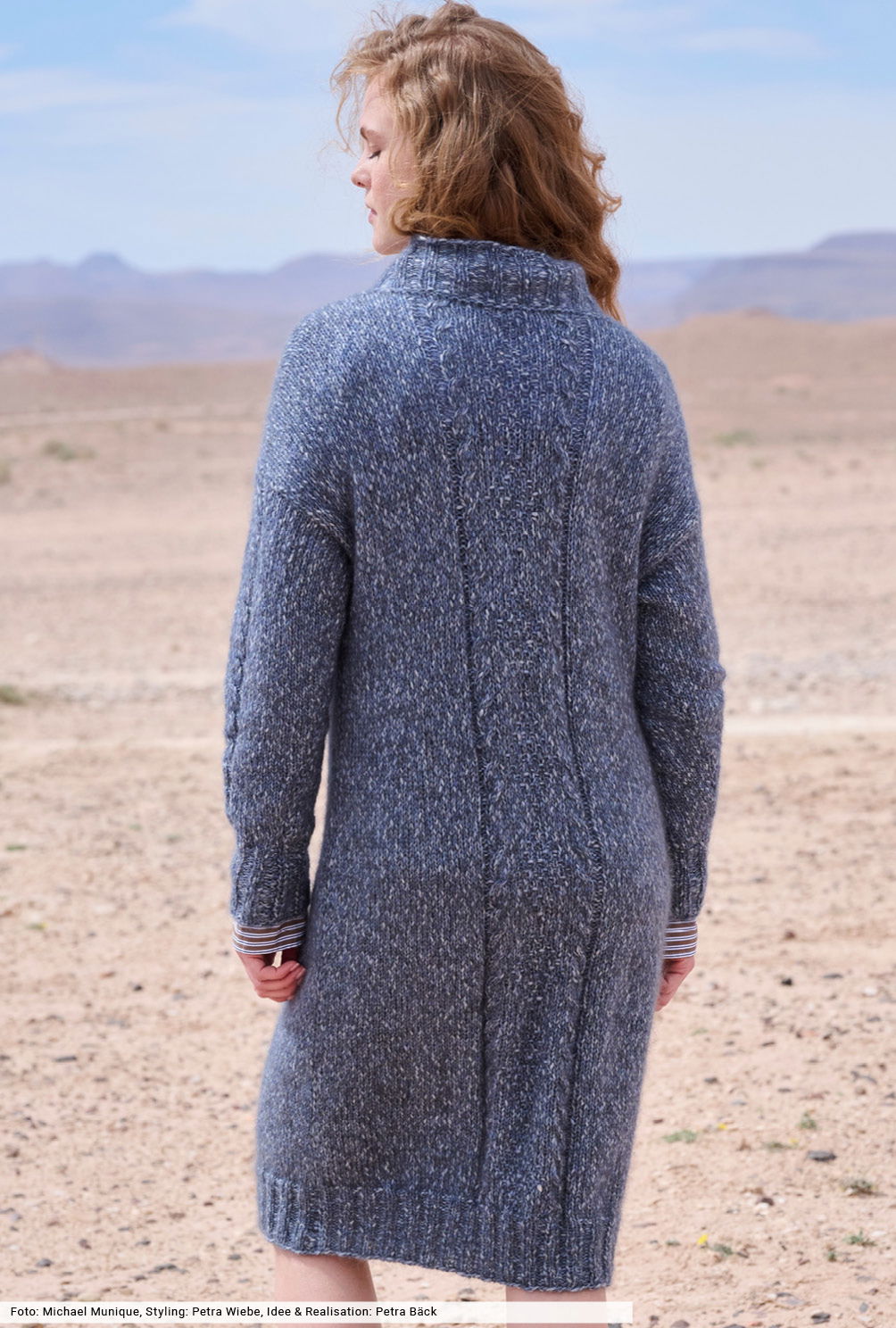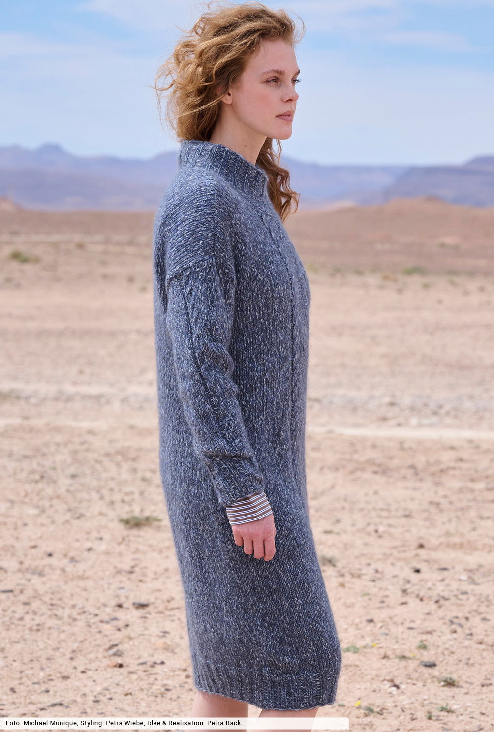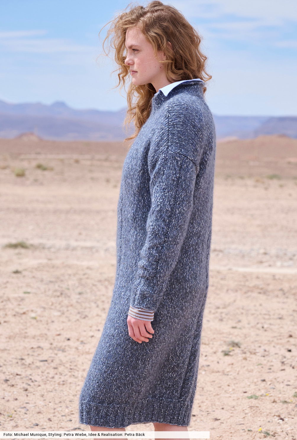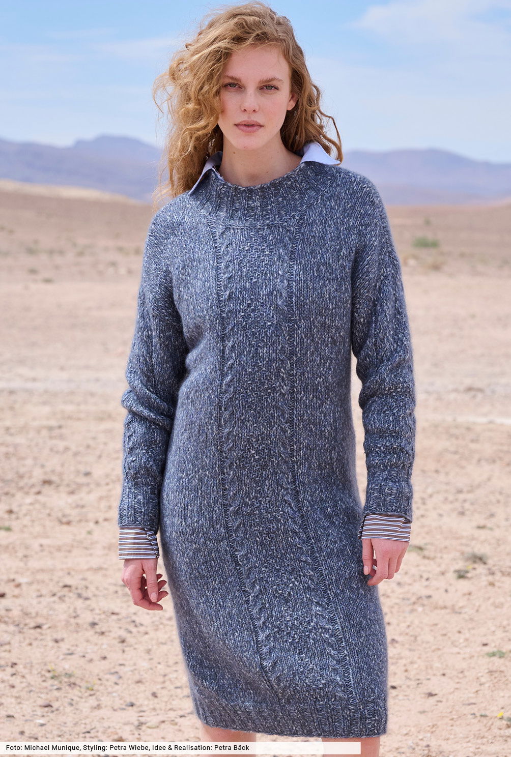 Strickkleider bringen in jeder Form eine lässige Eleganz in deine Herbstgarderobe und lassen sich besonders gut zu robusten Boots und Stiefeletten kombinieren. Hier ein Modell, dessen dezente Tweedoptik durch ein meliertes Schwurwoll-Mischgarn erzeugt wird, dem wir einen flauschigen Mohairfaden beigefügt haben. Unser Fazit: ein toller Effekt, mit dem sich auch schmale Zöpfe und einfache Rechts-Links-Rauten in Szene setzen!