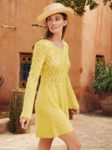 Better together: Zwei Garne zusammen zu verstricken hat seinen ganz besonderen Reiz. Hier ist es eine Kombination aus feinem Leinengarn und edler Mohairseide, die bei diesem leicht ausgestellten Kleid für den Schmeichelfaktor in Sachen Komfort sorgen. Und auch die Muster setzen sich ins richtige Licht: Wir beginnen mit einfachen Perlstrukturen und wechseln im oberen Bereich auf Rautenlinien, die wir mit Noppen effektvoll ergänzt haben. In hellen Gelbtönen ein strahlendes Statement für den Frühling!