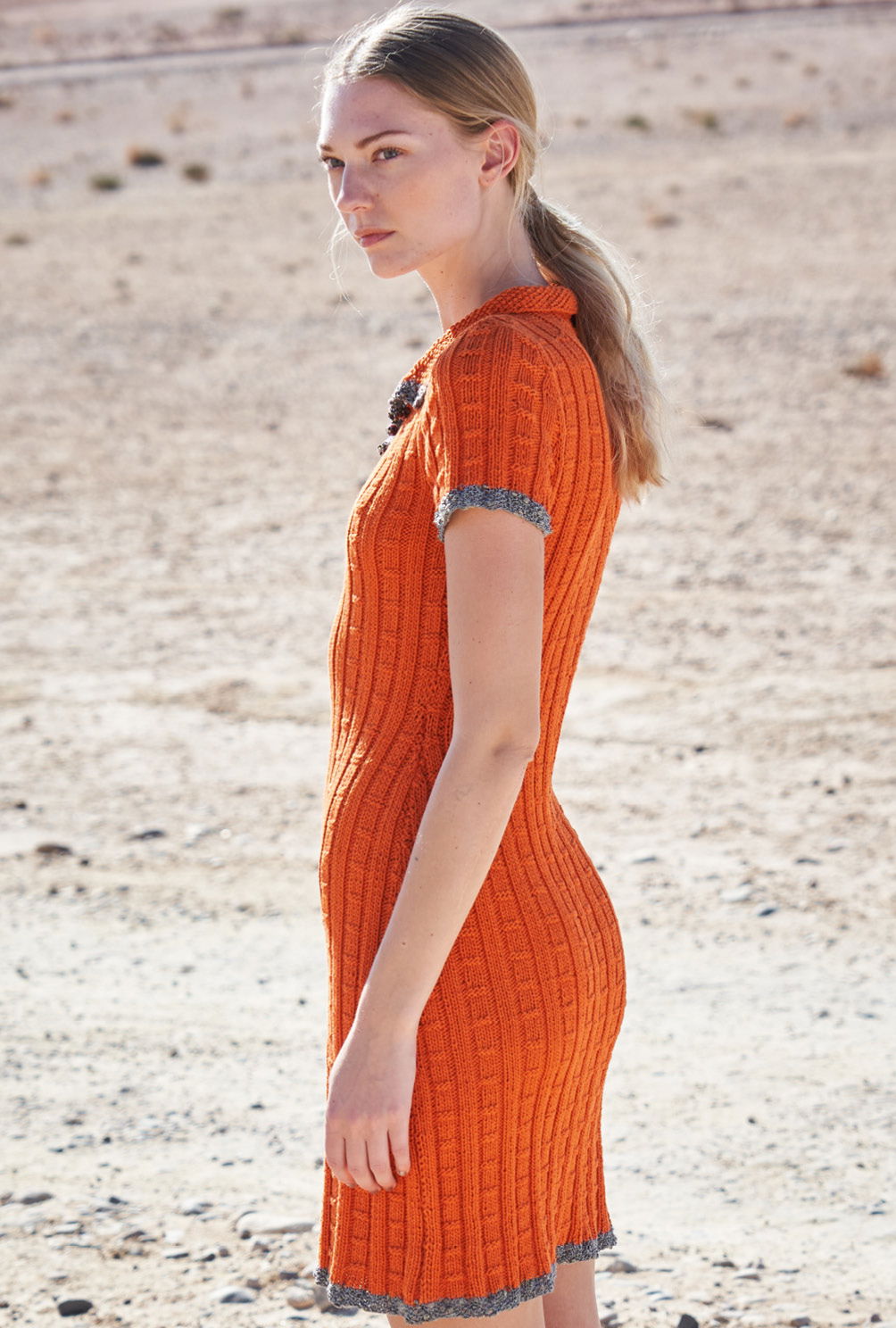 Das kurze Strickkleid lebt von Akzenten und einer gewissen Nonchalance. Dies zeigt sich durch das einfache Strukturmuster in Orange, das wir ganz mutig mit silbernen Lurexblenden eingefasst haben. Besonders schön sind die detaillverliebten Streifen, die im mittleren Bereich dezent, aber effektvoll durch das kleine Perlmuster der Figur folgen. Das wirkt sehr feminin, während der Polokragen den klassischen, sportlichen Akzent verleiht. Gestrickt wird erst das Rückenteil, dann das Vorderteil und zum Schluss die kleinen Ärmel. Nach dem Perlmuster-Bündchen werden die Maschen für die Musterstreifen eingeteilt. Die einzelnen Muster sind nicht schwierig, es empfiehlt sich lediglich für das Mittelmuster Maschenmarkierer zu verwenden. So hat man einen besseren Überblick darüber, wo man sich gerade im Muster befindet. Gerade am Anfang ist das sehr hilfreich. Sind alle viert Teile fertig gestrickt, werden die Nähte geschlossen und der Polokragen aus dem Halsausschnitt herausgestrickt. Tipp: Da kräftiges Orange nicht unbedingt jedem steht: Die Soft Cotton gibt es in über 20 wunderschönen klassischen und trendigen Farben.