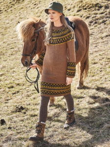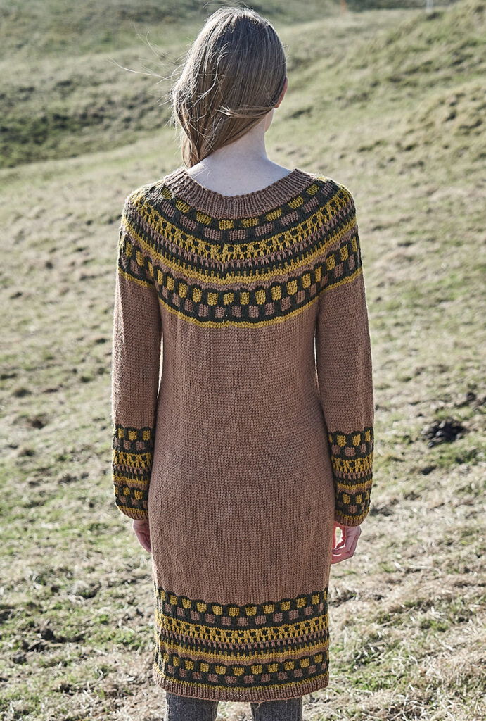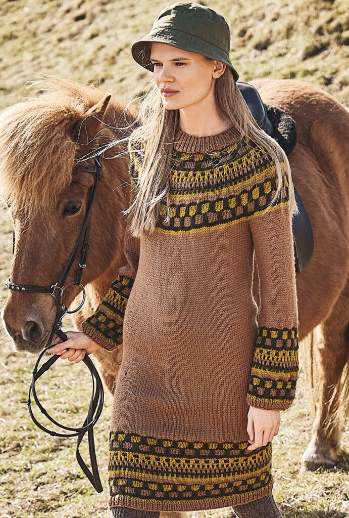 Aparte Strickkleider begleiten uns durch die ganze Herbstsaison. Dieses begeistert durch seinen Mix aus einfachen Hebemaschen, die sich in den typischen Laubtönen Braun, Dunkelgrün und Senfgelb präsentieren. Der besondere Dreh liegt in der Schnittführung: Du beginnst oben am Halsausschnitt, strickst Vorder- und Rückenteil in Runden nahtlos weiter bis zu den Saumbündchen, danach die stillgelegten Maschen für die Ärmel wieder aufnehmen und nochmals in Runden weiterarbeiten – fertig ist das gute Stück. Wer nicht gerne Nähte konfektioniert, ist damit bestens bedient.