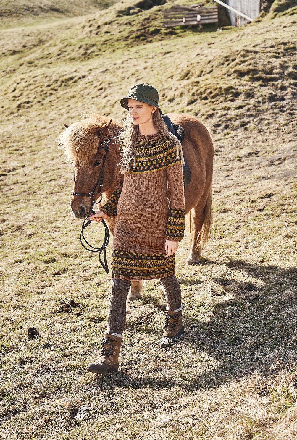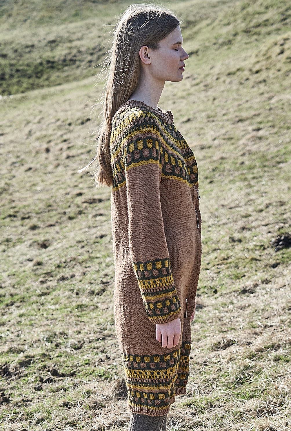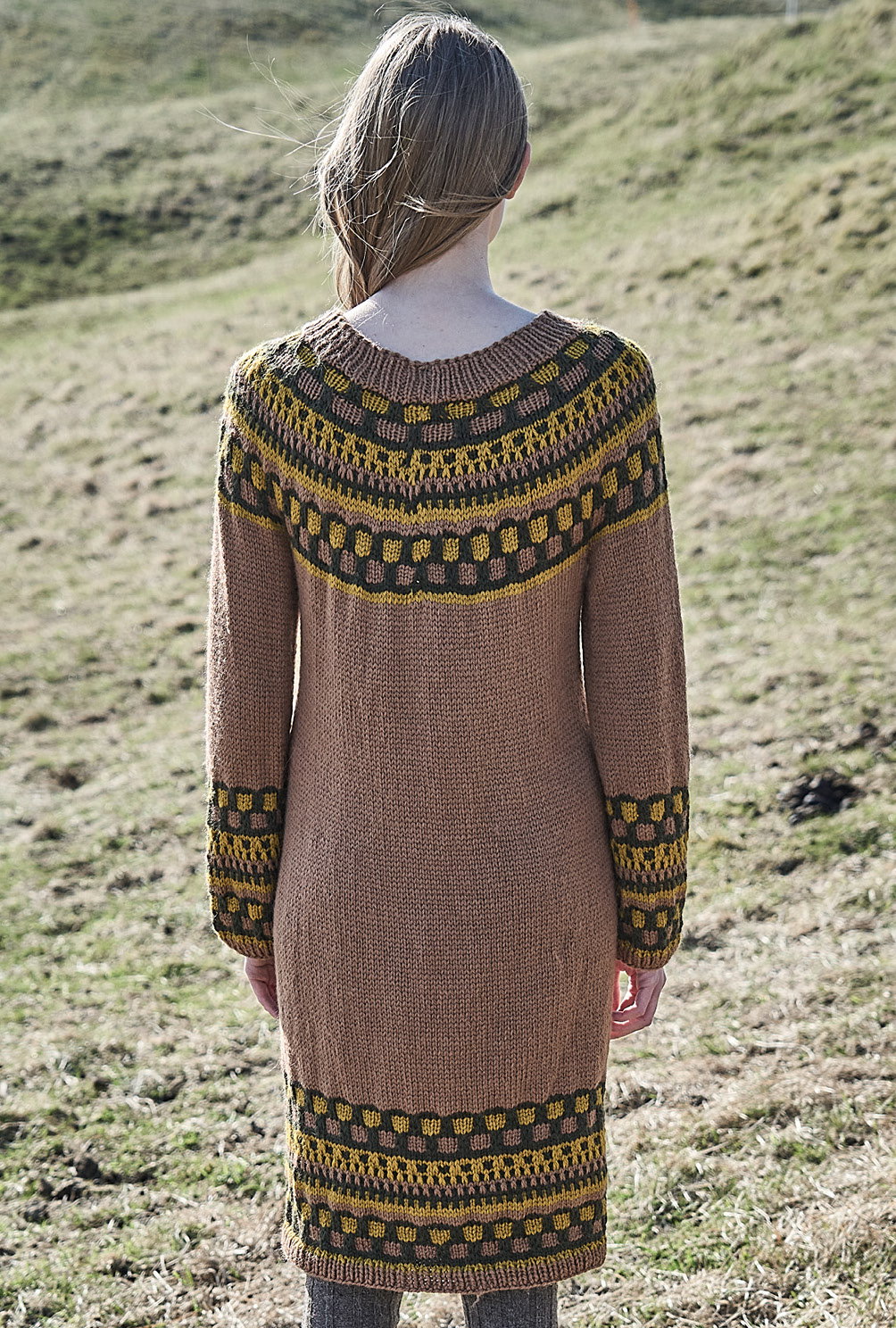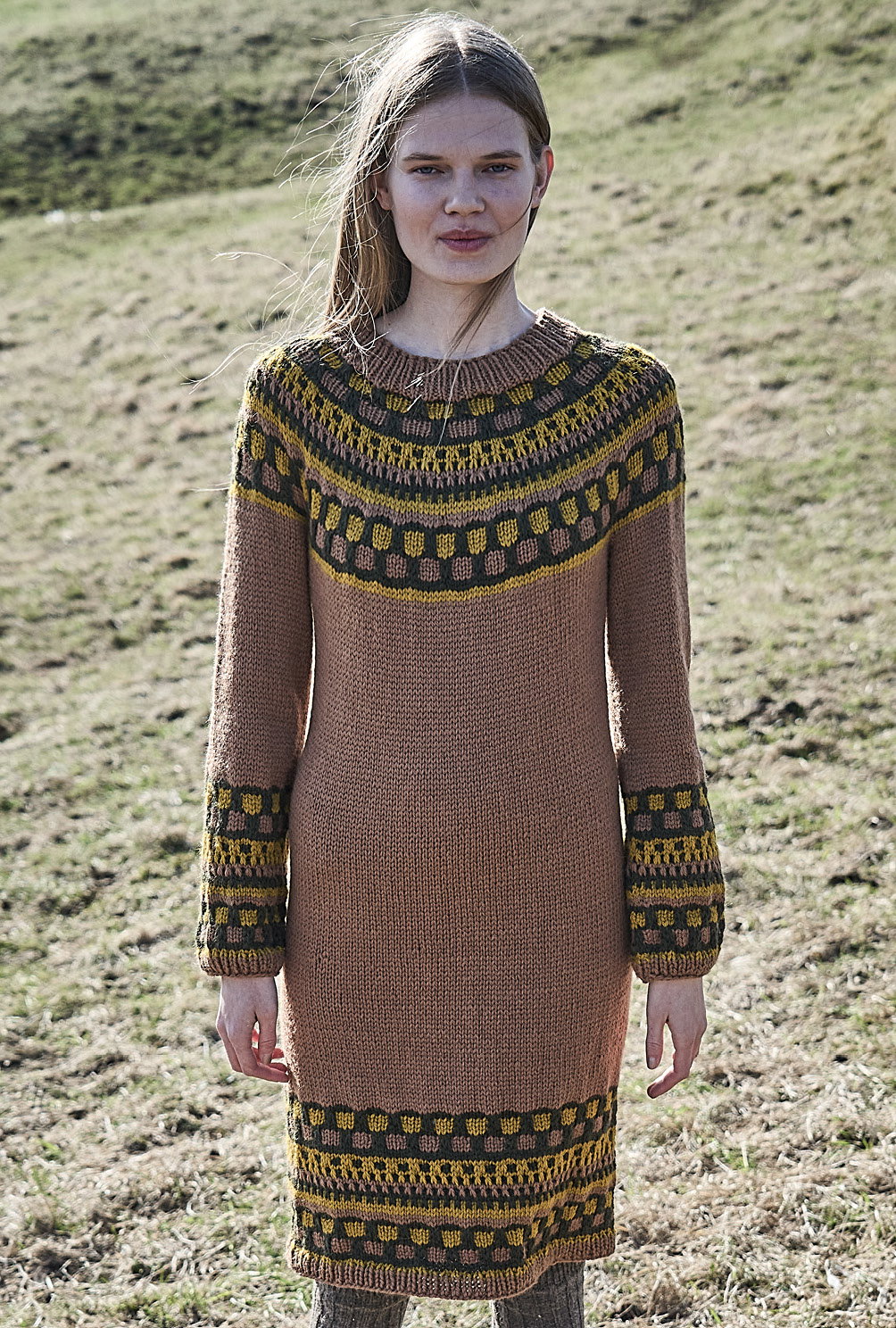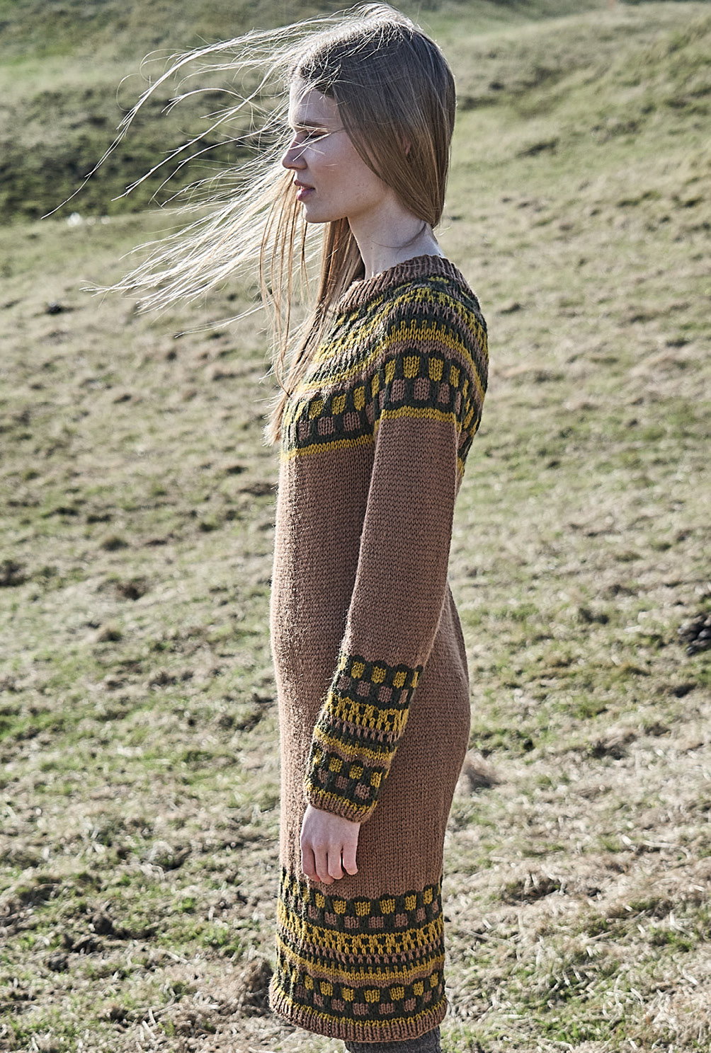 Aparte Strickkleider begleiten uns durch die ganze Herbstsaison. Dieses begeistert durch seinen Mix aus einfachen Hebemaschen, die sich in den typischen Laubtönen Braun, Dunkelgrün und Senfgelb präsentieren. Der besondere Dreh liegt in der Schnittführung: Du beginnst oben am Halsausschnitt, strickst Vorder- und Rückenteil in Runden nahtlos weiter bis zu den Saumbündchen, danach die stillgelegten Maschen für die Ärmel wieder aufnehmen und nochmals in Runden weiterarbeiten – fertig ist das gute Stück. Wer nicht gerne Nähte konfektioniert, ist damit bestens bedient.