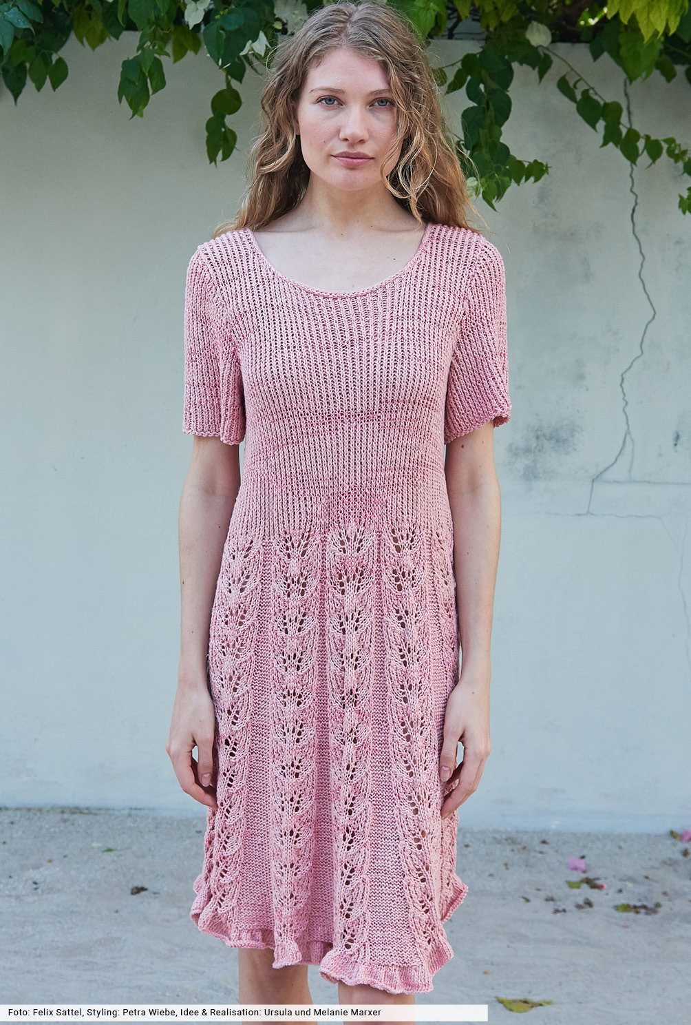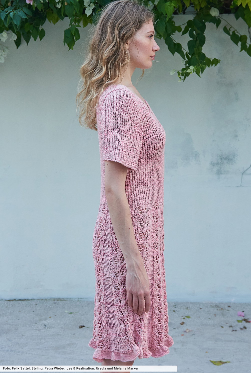 Strick steht hier sowohl beim Kleid als auch bei der Tasche im Mittelpunkt. Beide Teile zeigen sich mit breiten Ajourmusterstreifen, die mit Glatt-links-Partien kombiniert werden um hier die Abnahmen einzufügen. Bei den Garnen unterscheiden sie sich jedoch: Das Kleid entsteht aus einem weichen Baumwollgarn, das mit glänzender Viskose ergänzt wird. Bei der Tasche haben wir auf Stabiliät geachten und feste Baumwolle als Grundlage verwendet.