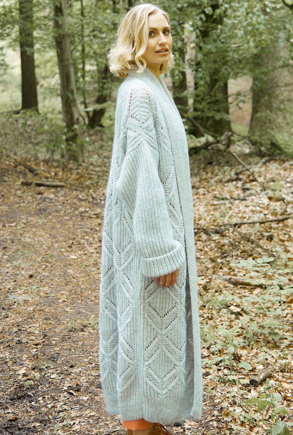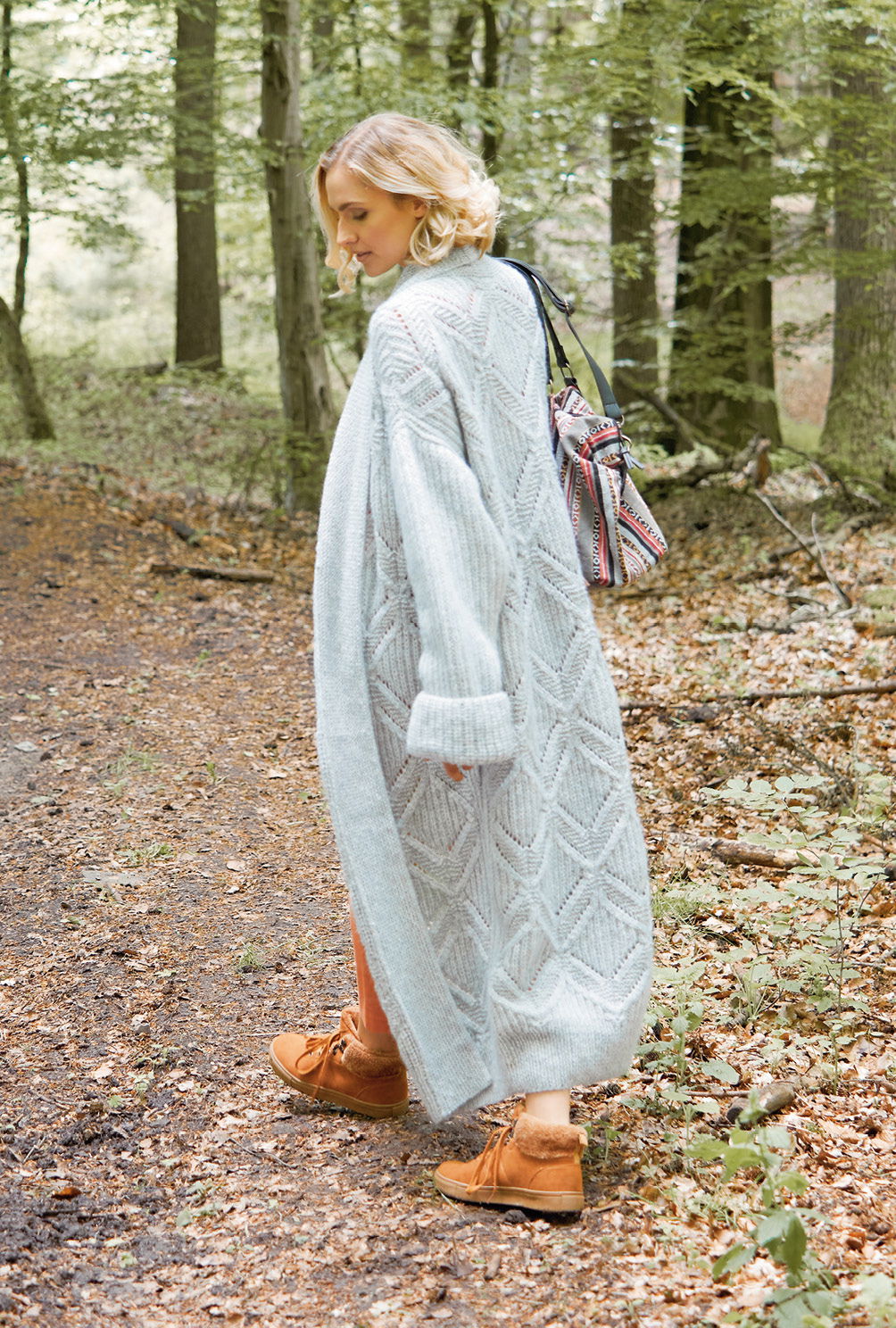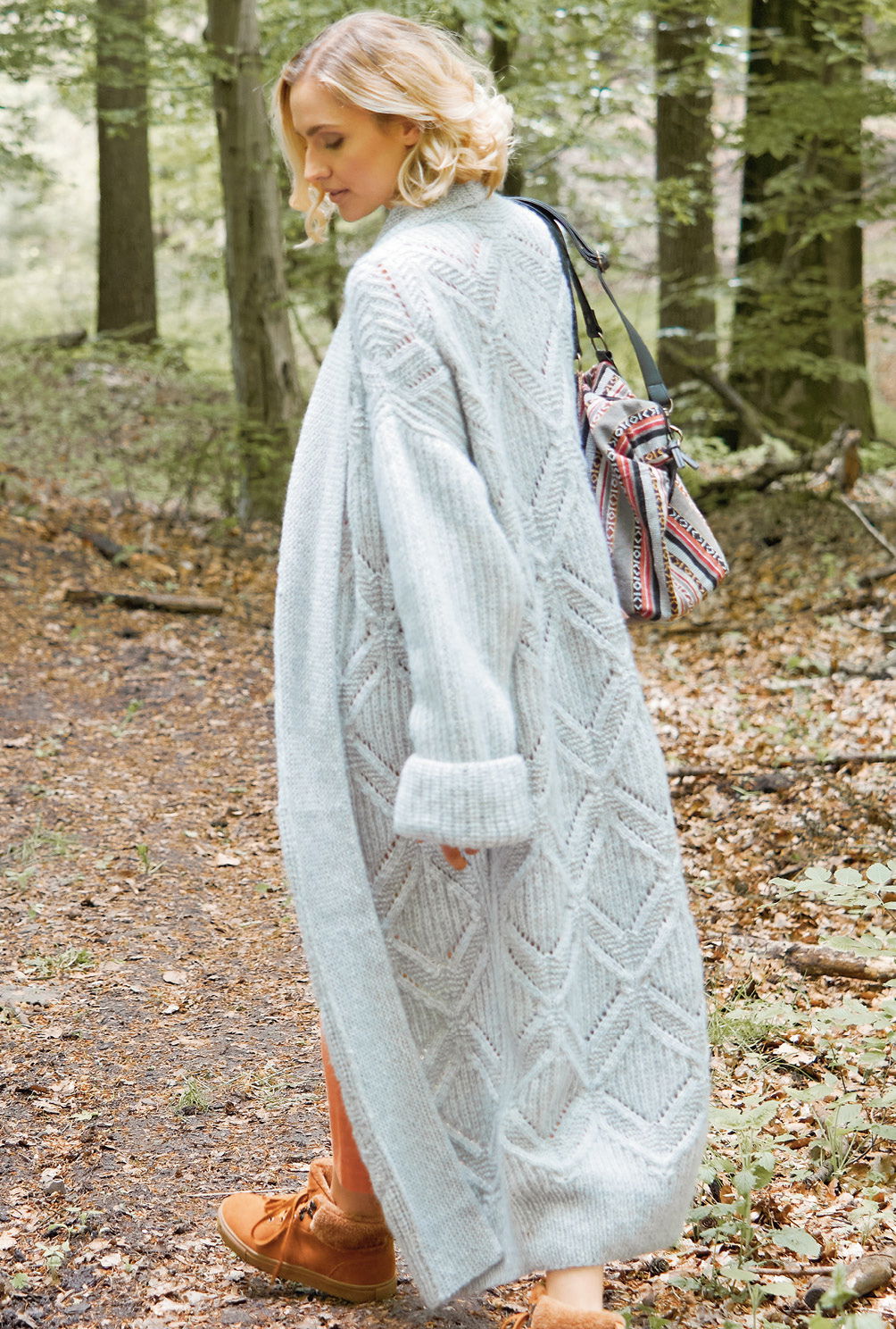 So ein Prachtexemplar sollte jetzt in keiner Wintergarderobe fehlen – der fast knöchellange Mantel macht eine gute Figur. Er wird Sie lange begleiten und immer wieder mit seinen ausdrucksstarken Rautenmotiven begeistern. Er ist ganz in Hellgrau, hat im halbpatent gestrickte Ärmel und ein ausdrucksvolles breites Rautenmuster an Rückenteil und den Vorderteilen, welches nach Anleitung super easy nachzuarbeiten ist.Glatt rechts gestrickt ist der breite Schalkragen an den Vorderteilen und Halsausschnitt. Eine Anleitung gibt es für die Größen 36/38 (40/42) 44/46.